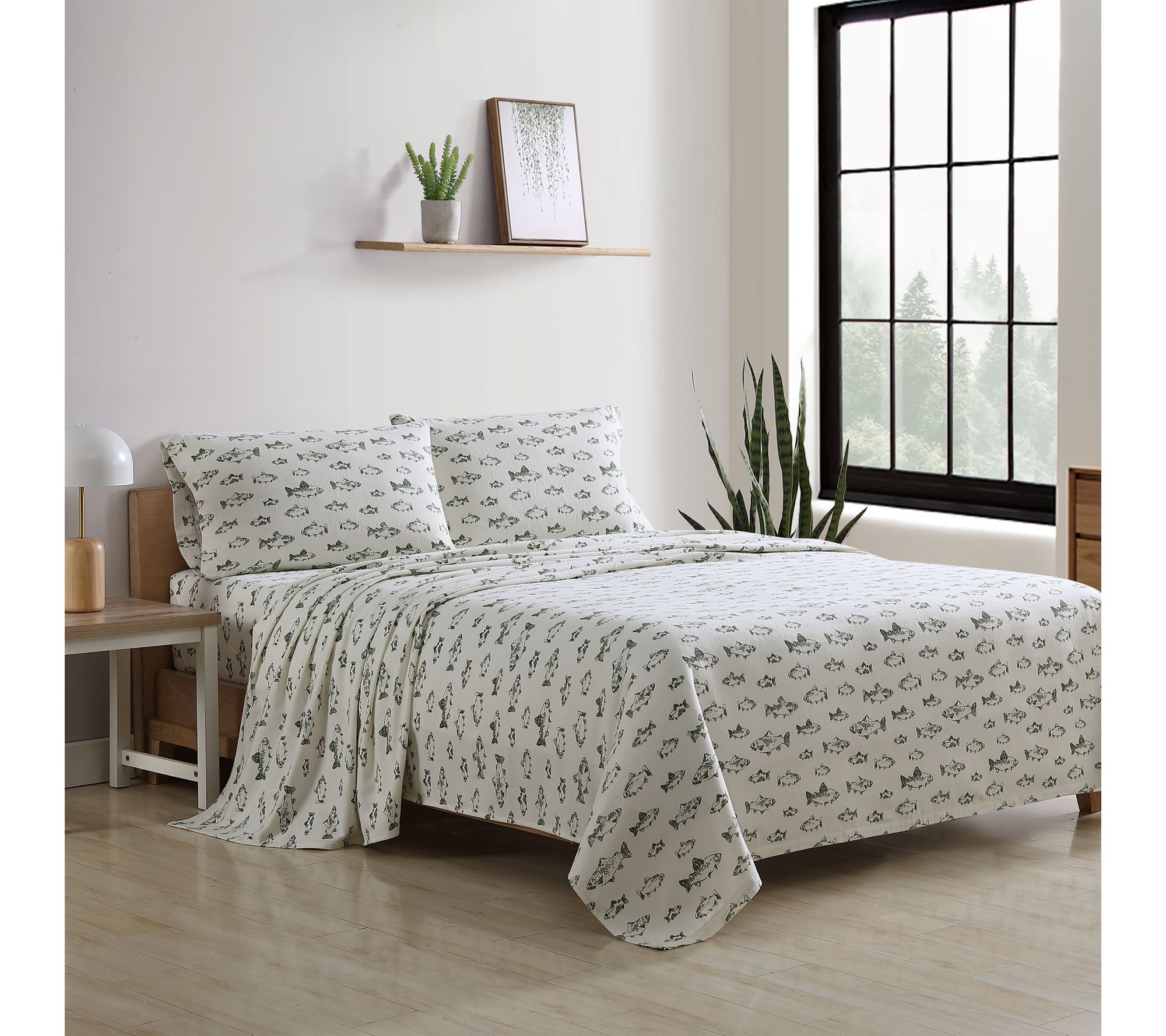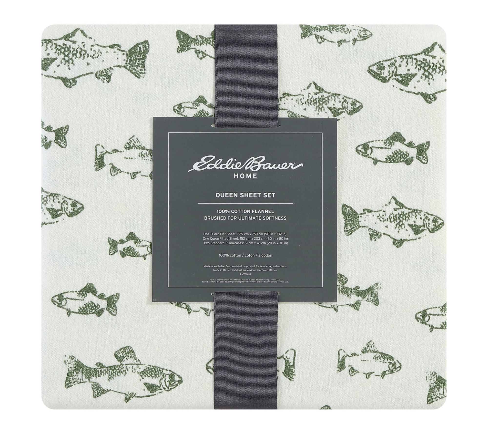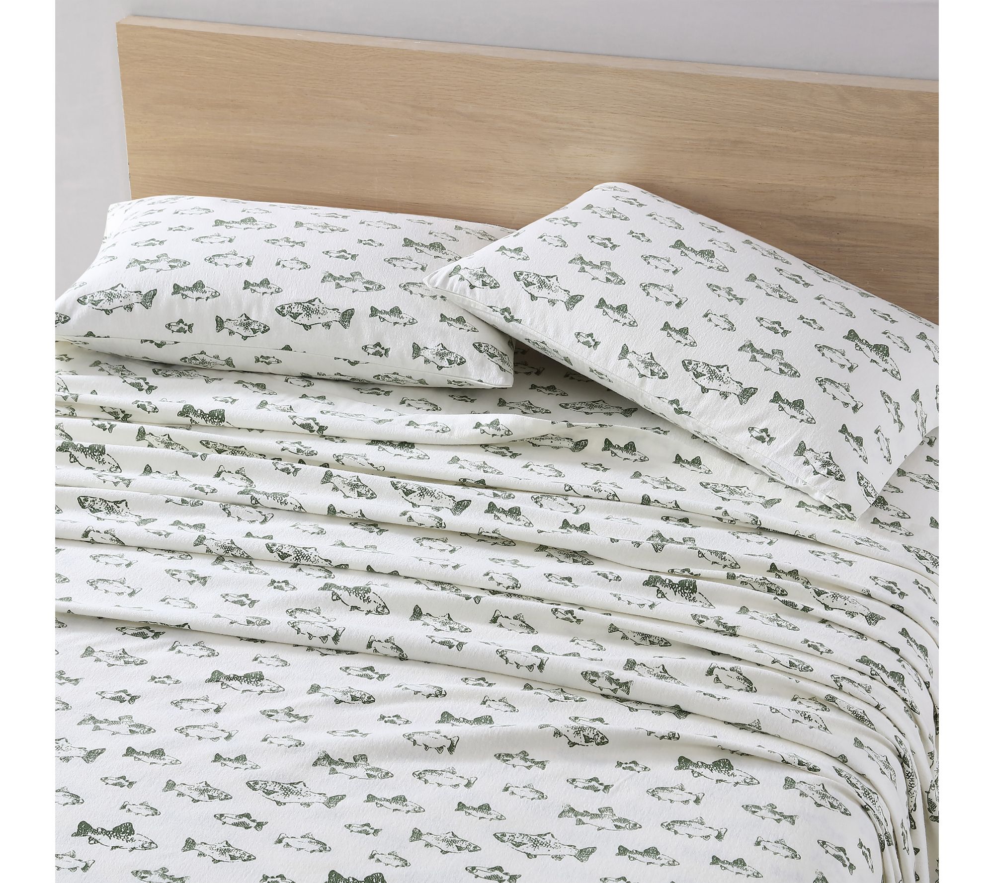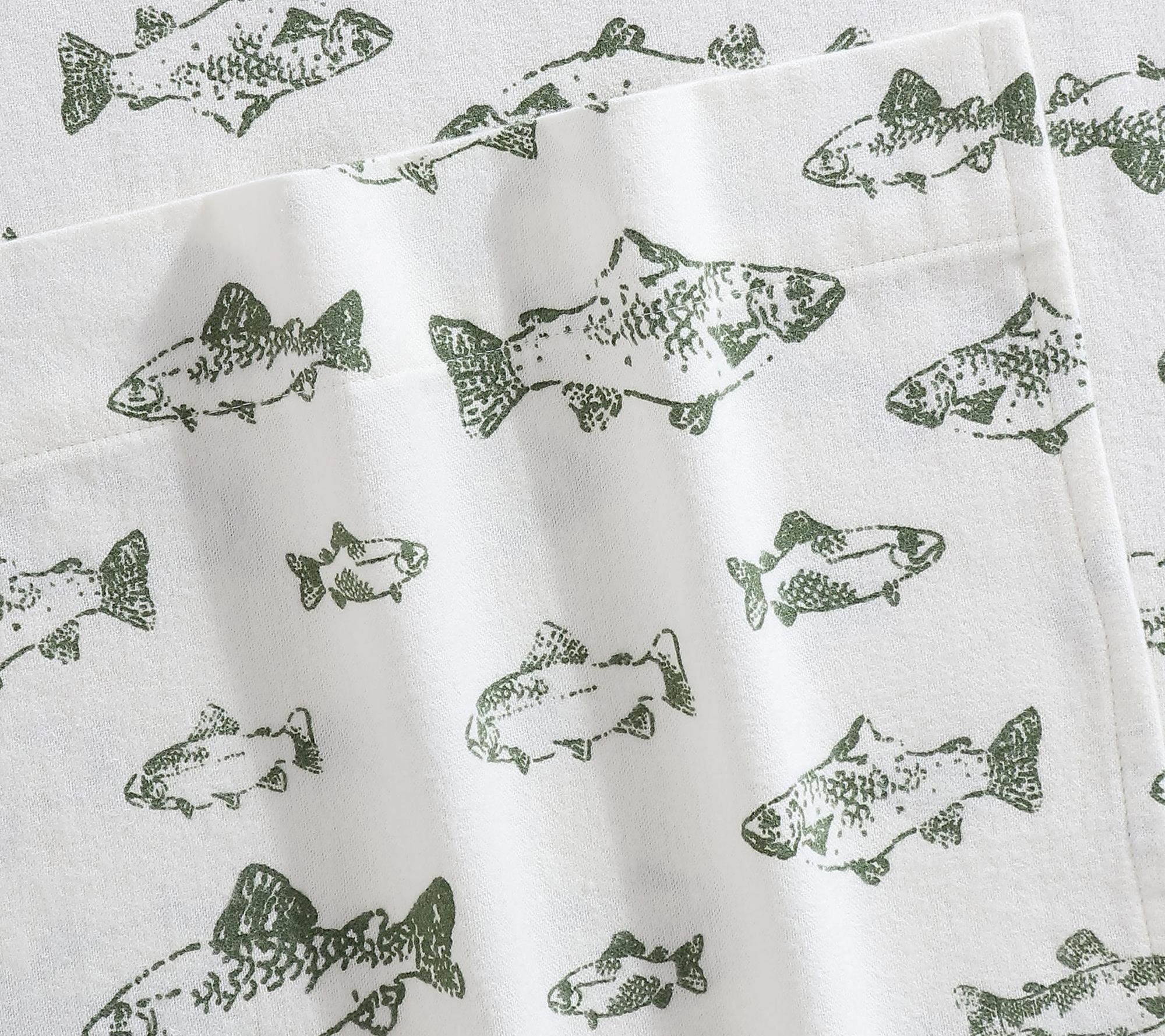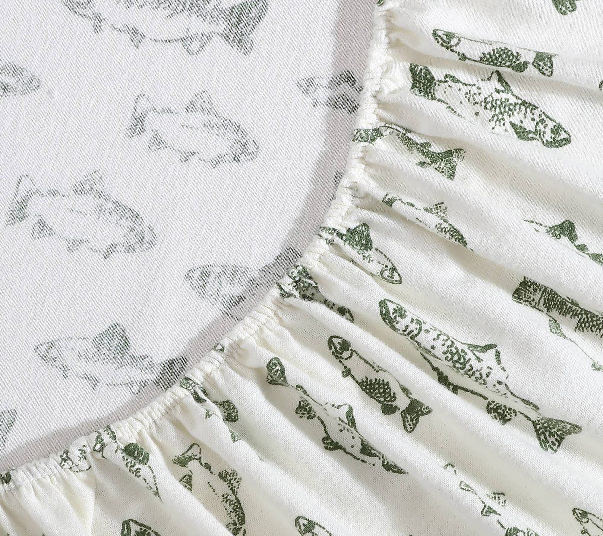 Drift off into a restful slumber surrounded by the playful charm of the School Of Fish Green cotton sheet set. Crafted for all-night comfort, these king-sized sheets offer a brushed, cozy texture that's ideal for chilly evenings and softens beautifully over time. The deep-pocket fitted sheet stays snug, while the lively pattern brings a fresh update to your bedroom retreat. From Eddie Bauer.