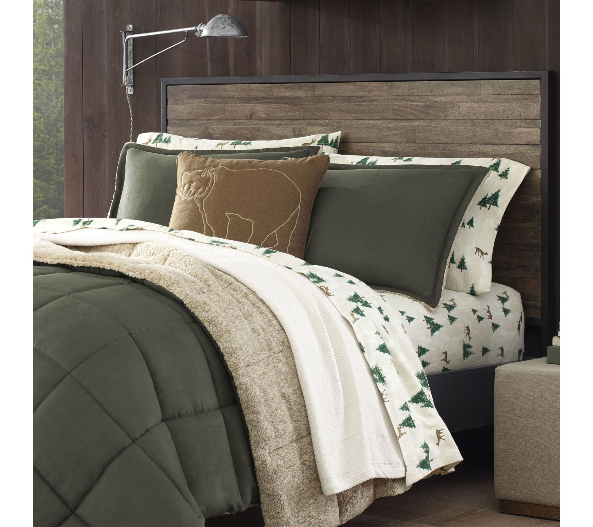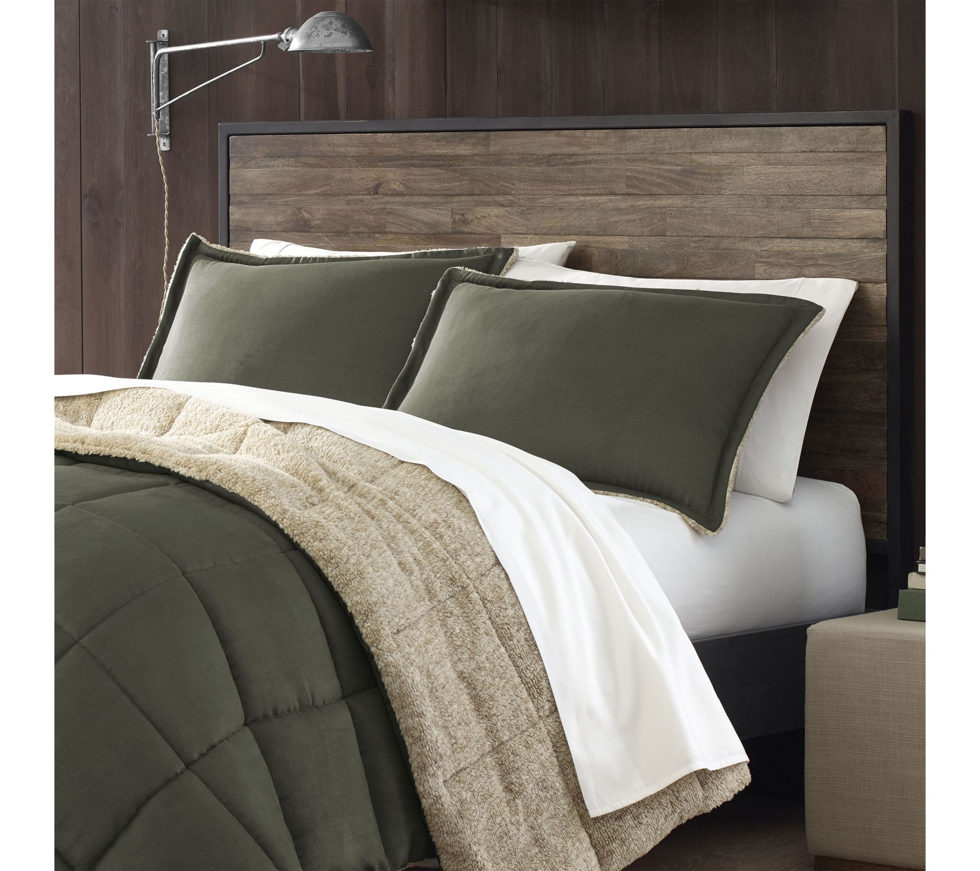 • Comforter features micro-suede face in Sherwood green reversing to ultra-plush light brown sherpa
