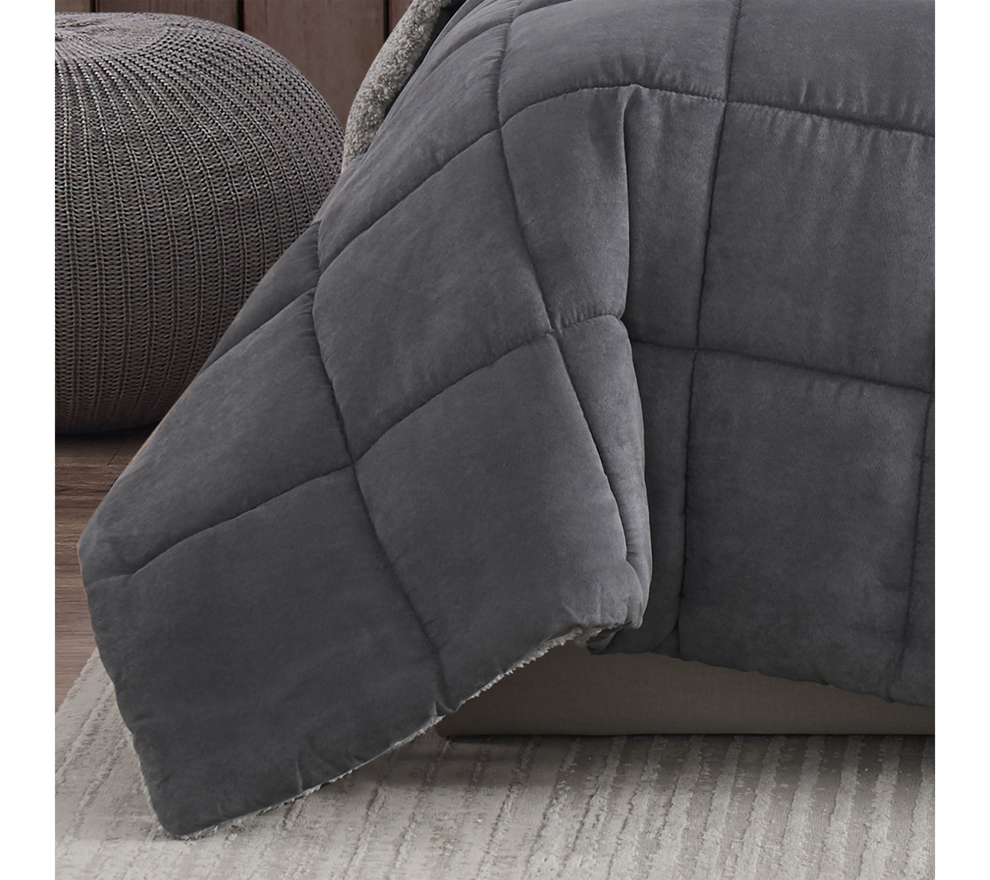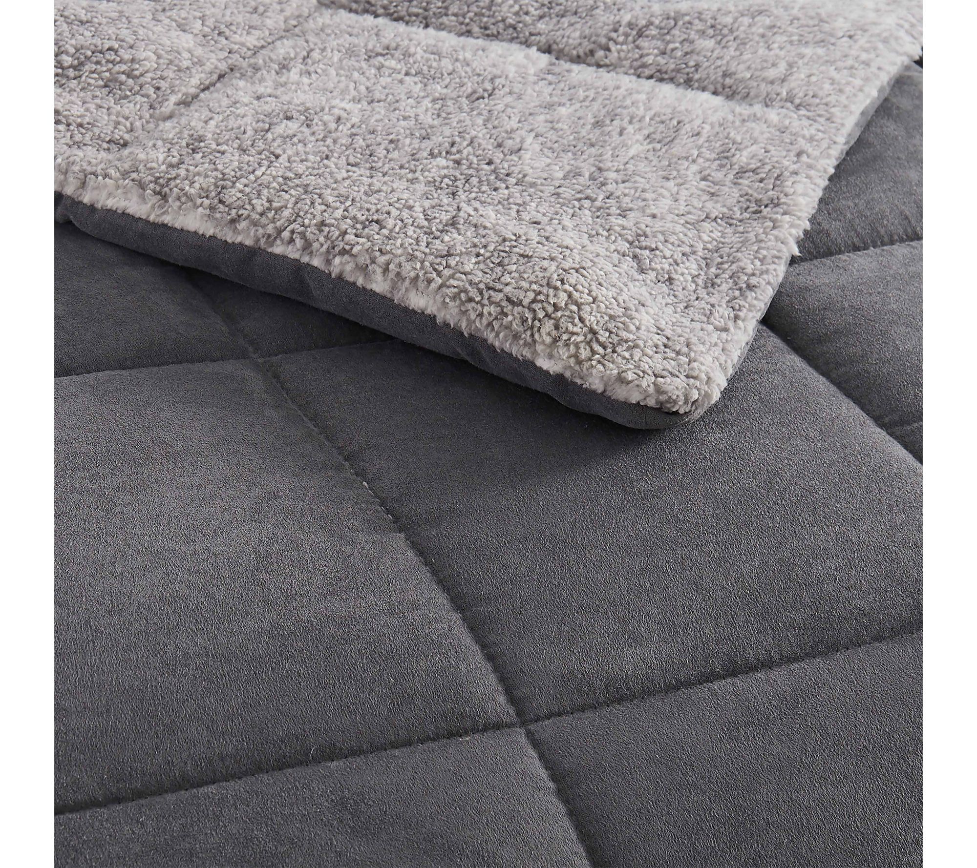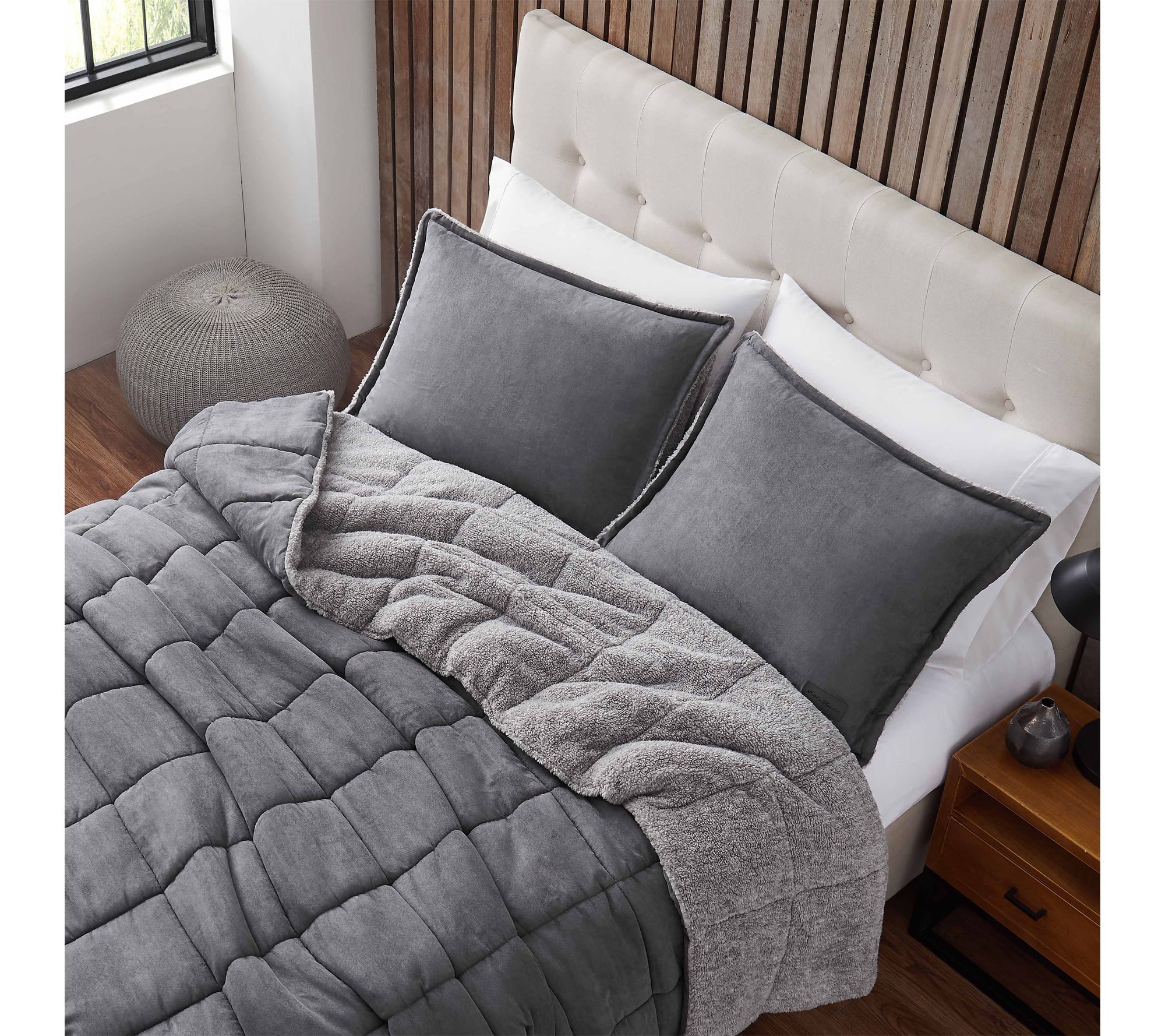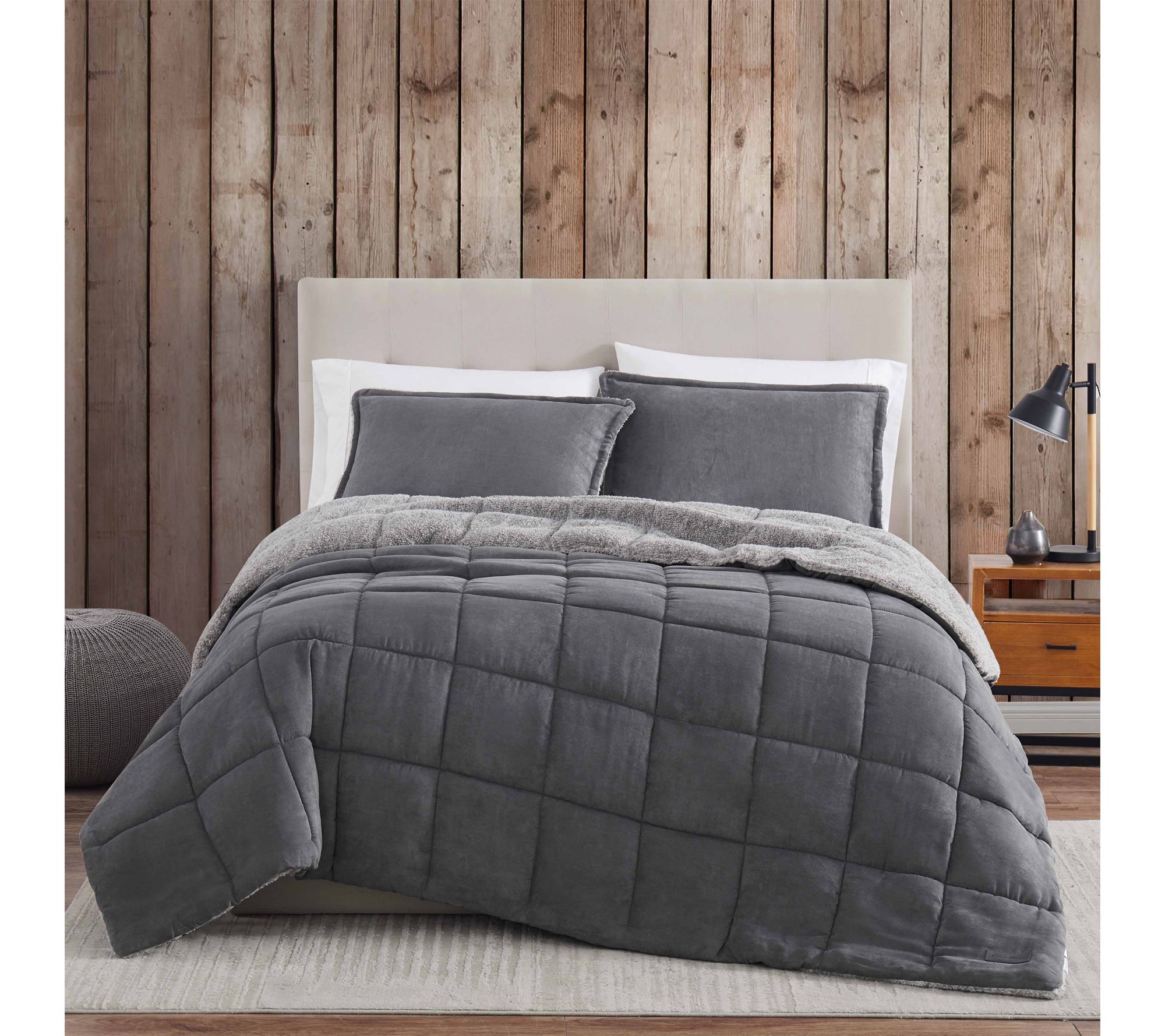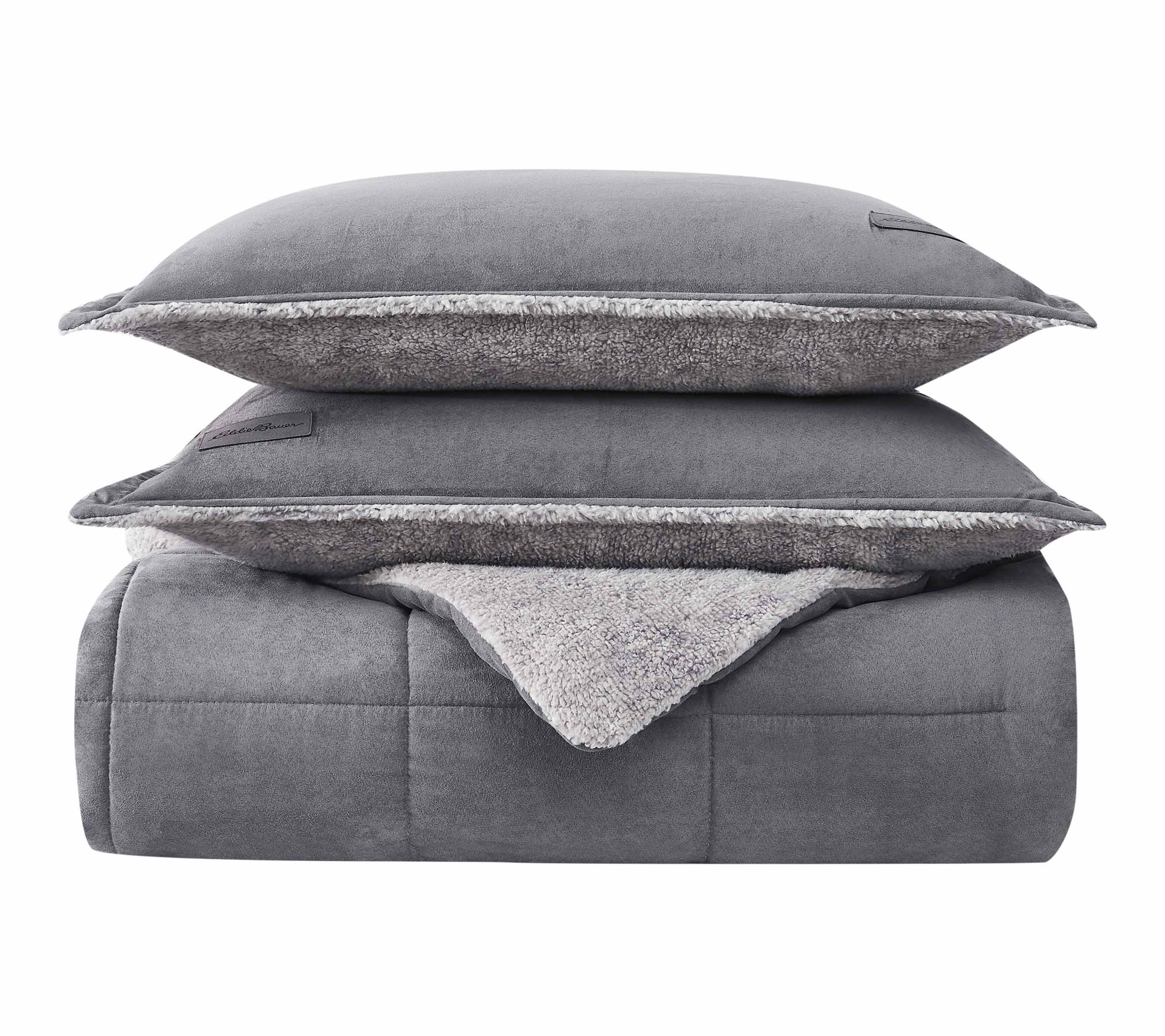 Transform your bedroom into a restful haven with this textured comforter set, featuring a plush micro-suede face and heathered sherpa reverse that promise warmth and comfort all winter long. Curl up under layers of softness and enjoy nights surrounded by cozy style and inviting textures. From Eddie Bauer.