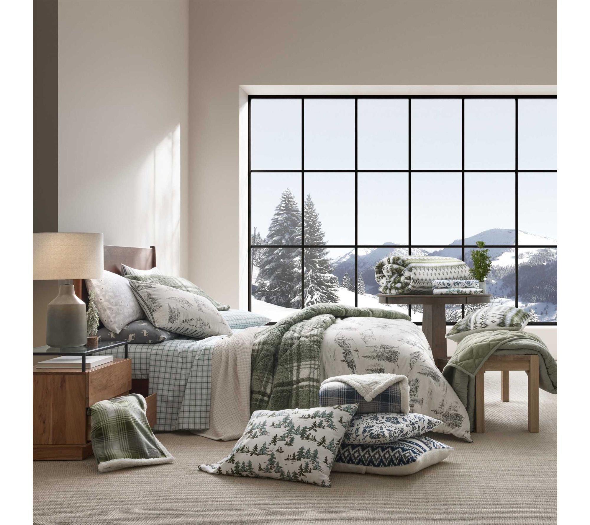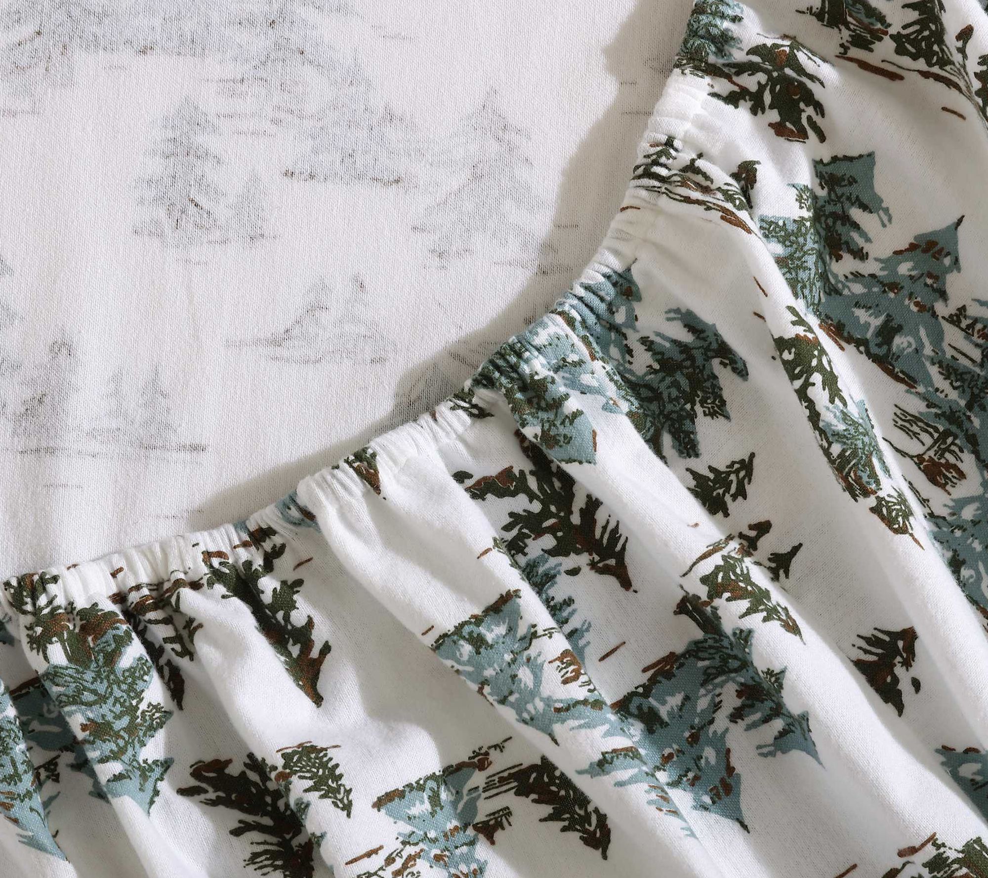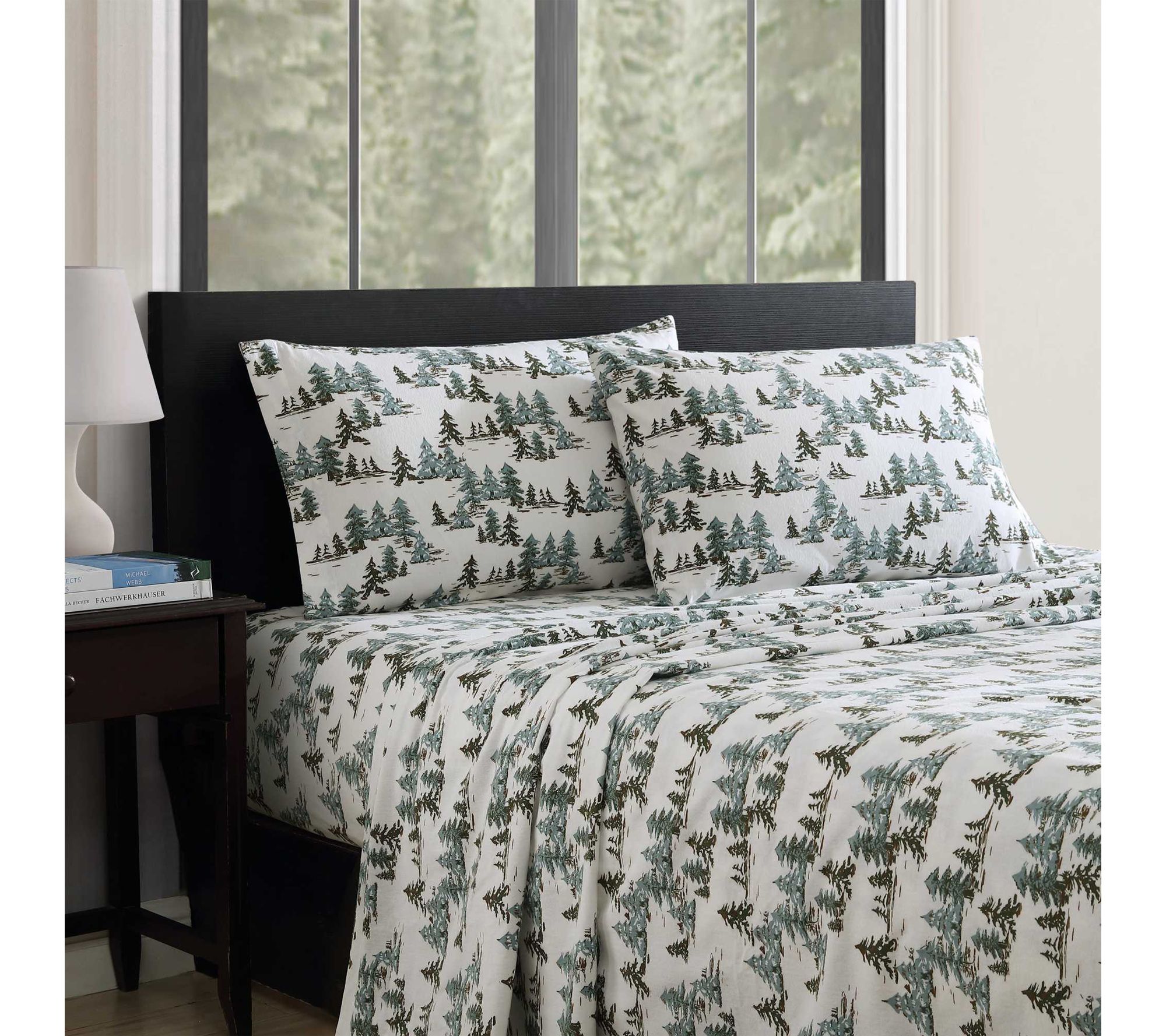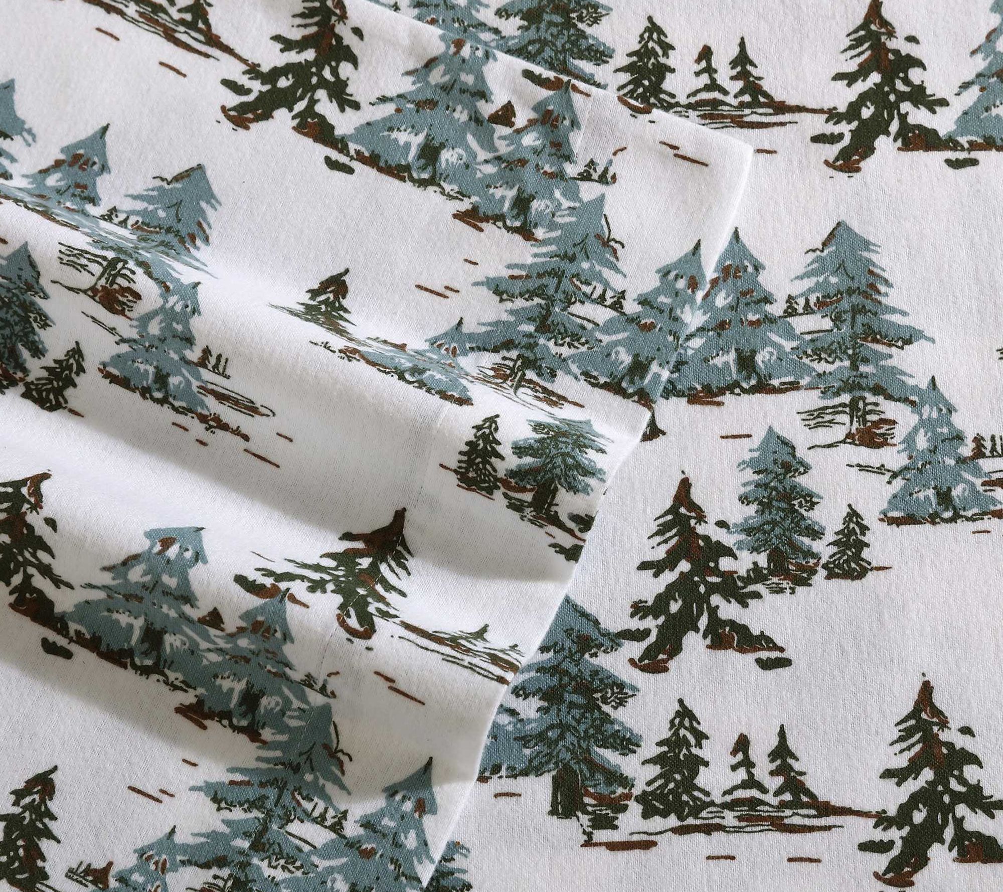 Create a cozy retreat from the winter chill with this cotton flannel sheet set, featuring a charming snowy pine tree design. Brushed for extra softness and warmth, these sheets offer all-night comfort and a snug fit, making bedtime something to look forward to as the temperatures drop. From Eddie Bauer.