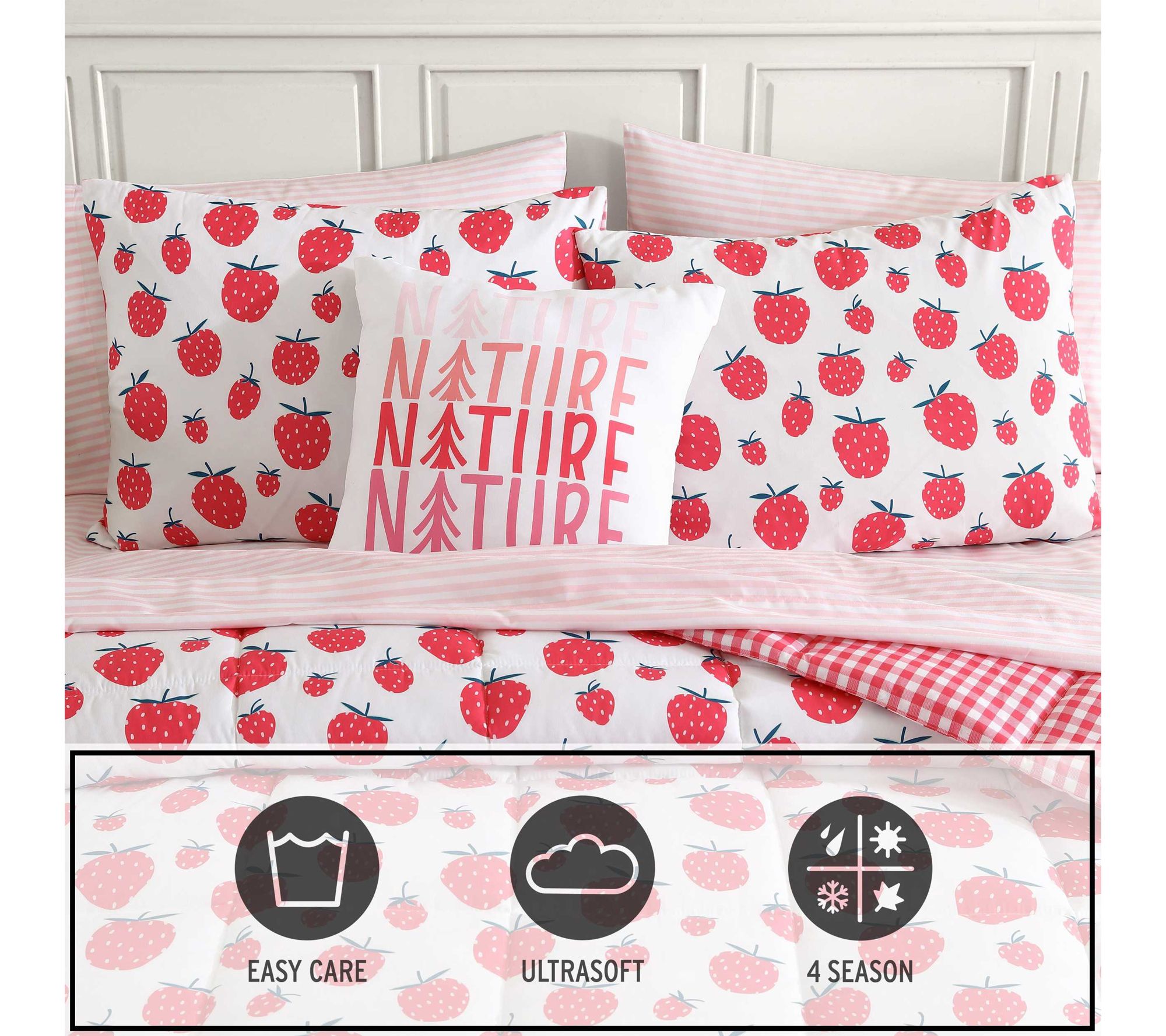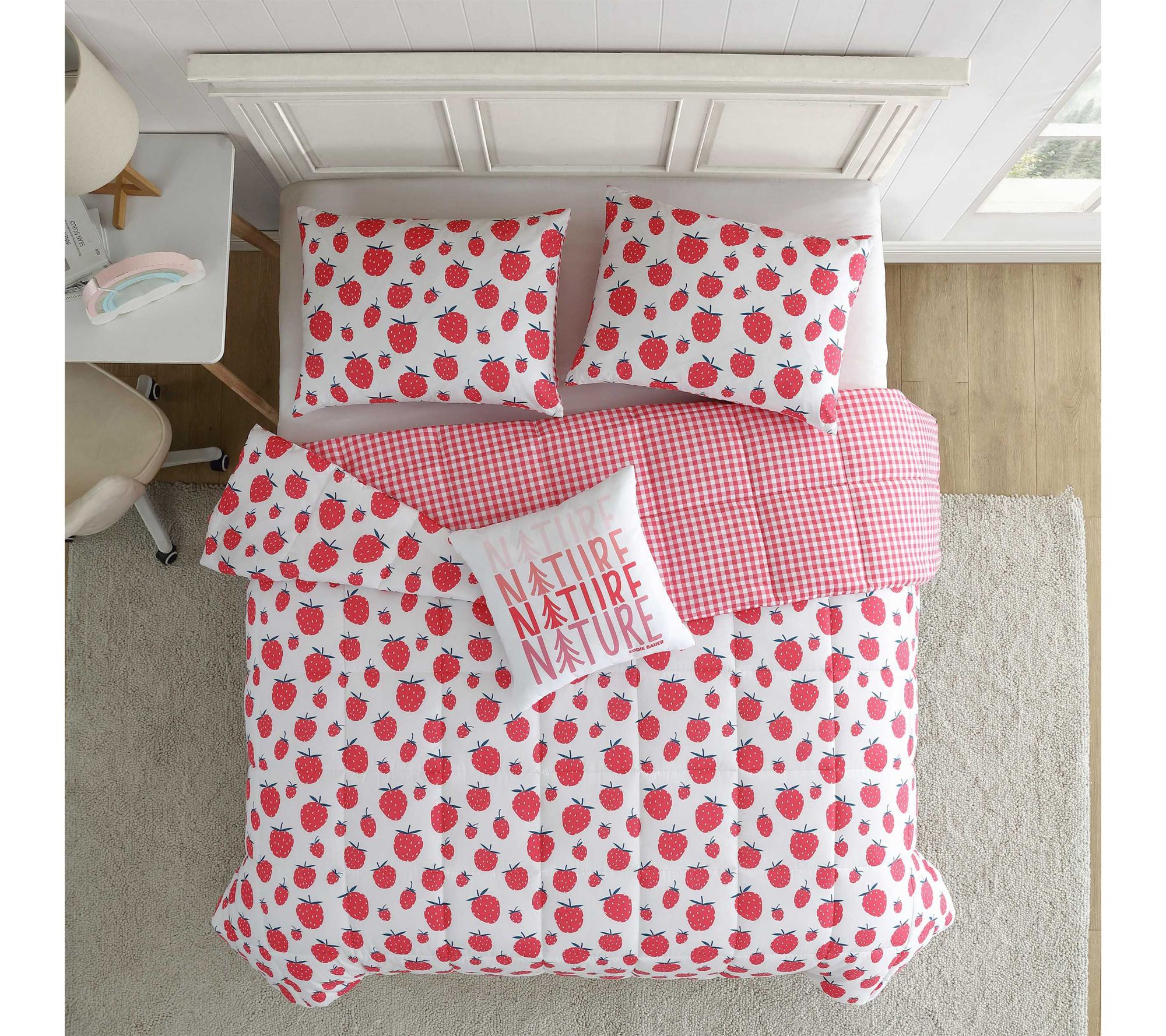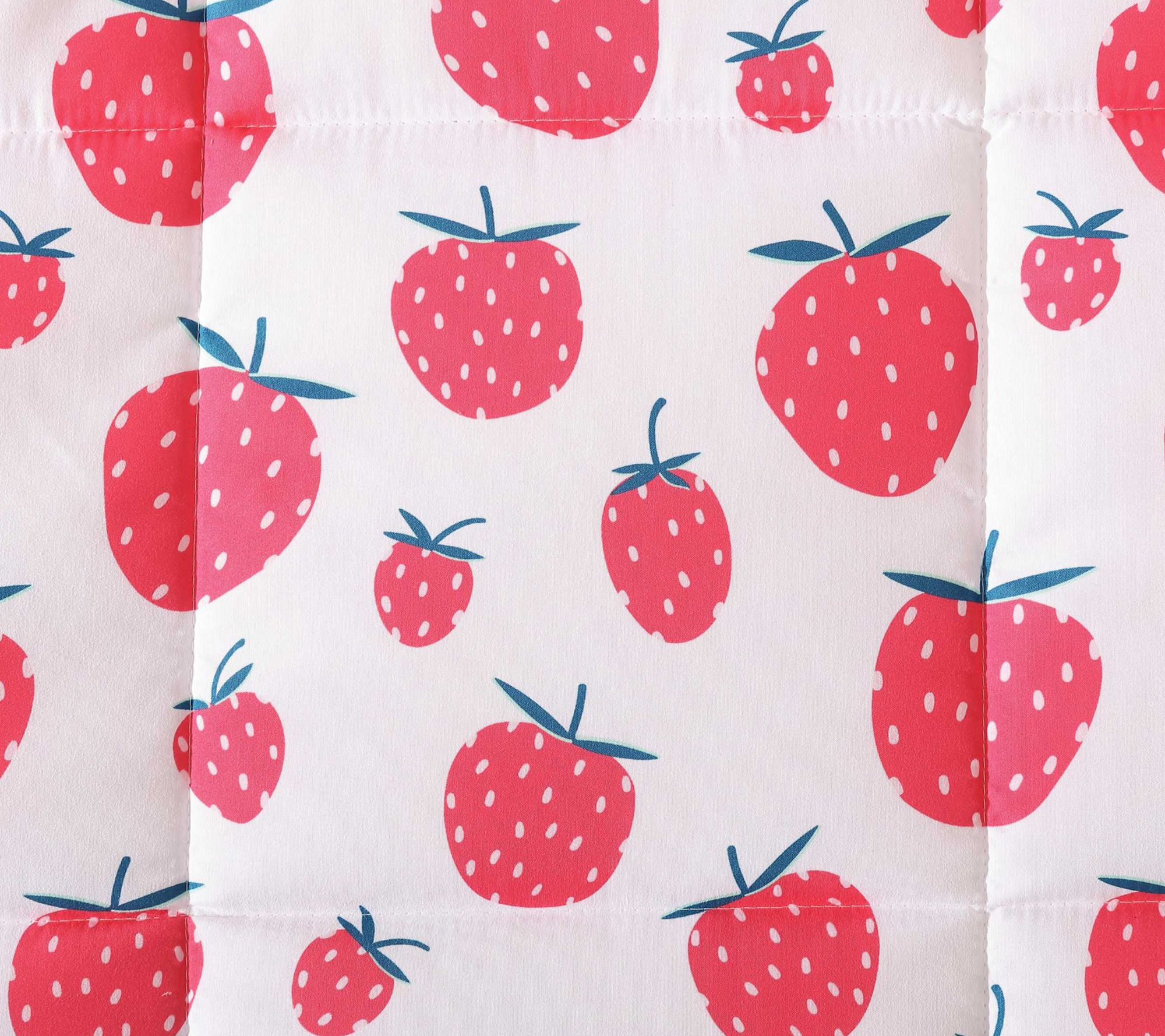 Add a pop of playfulness to your child's bedroom with this Strawberry Field comforter set. With its vibrant strawberry design and soft microfiber feel, this bedding brings a cheerful look and cozy comfort that makes bedtime something to look forward to. The fun pillow and matching sham create a space that invites smiles and sweet dreams. From Eddie Bauer.