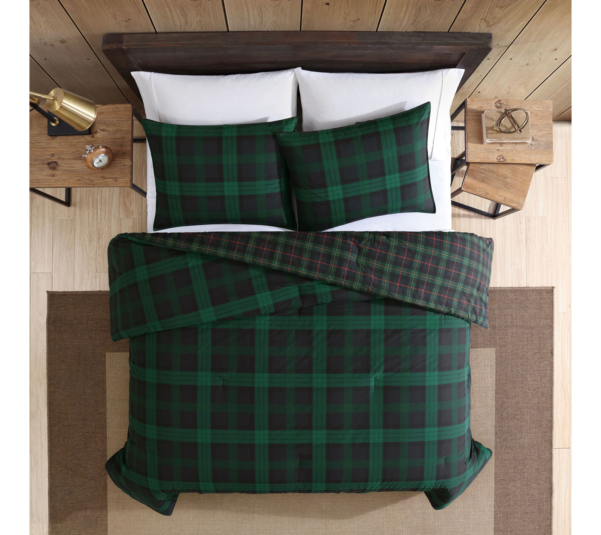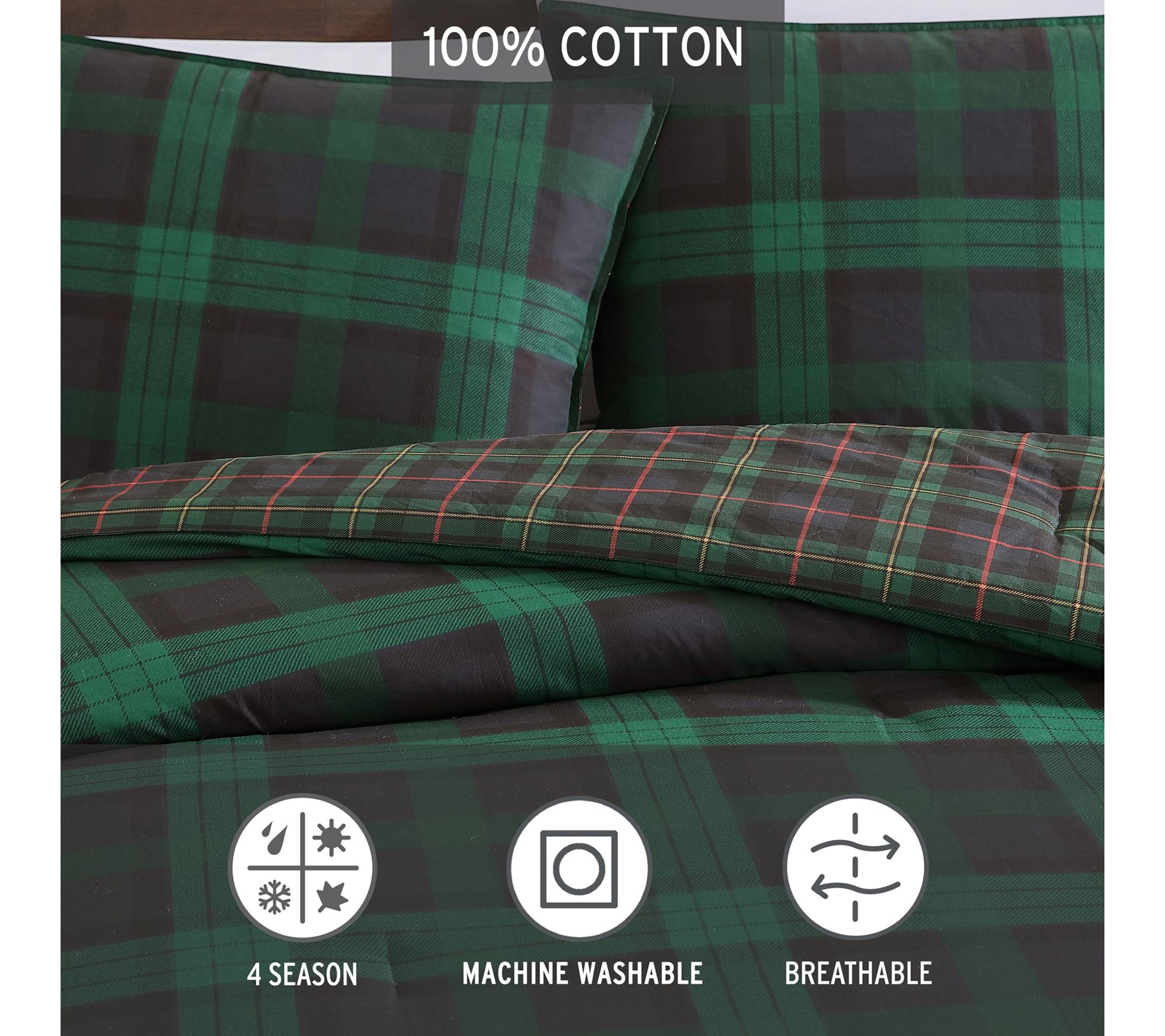 Bring the classic comfort of Scottish-inspired plaid to your bedroom with this twin comforter set. The bold tartan design in pine green and dark blue instantly creates a cozy retreat, while textural effects in the print mimic the look of woven fabric. Reversible styling and soft cotton construction make it easy to switch up your look for movie nights or weekend relaxation. From Eddie Bauer.
