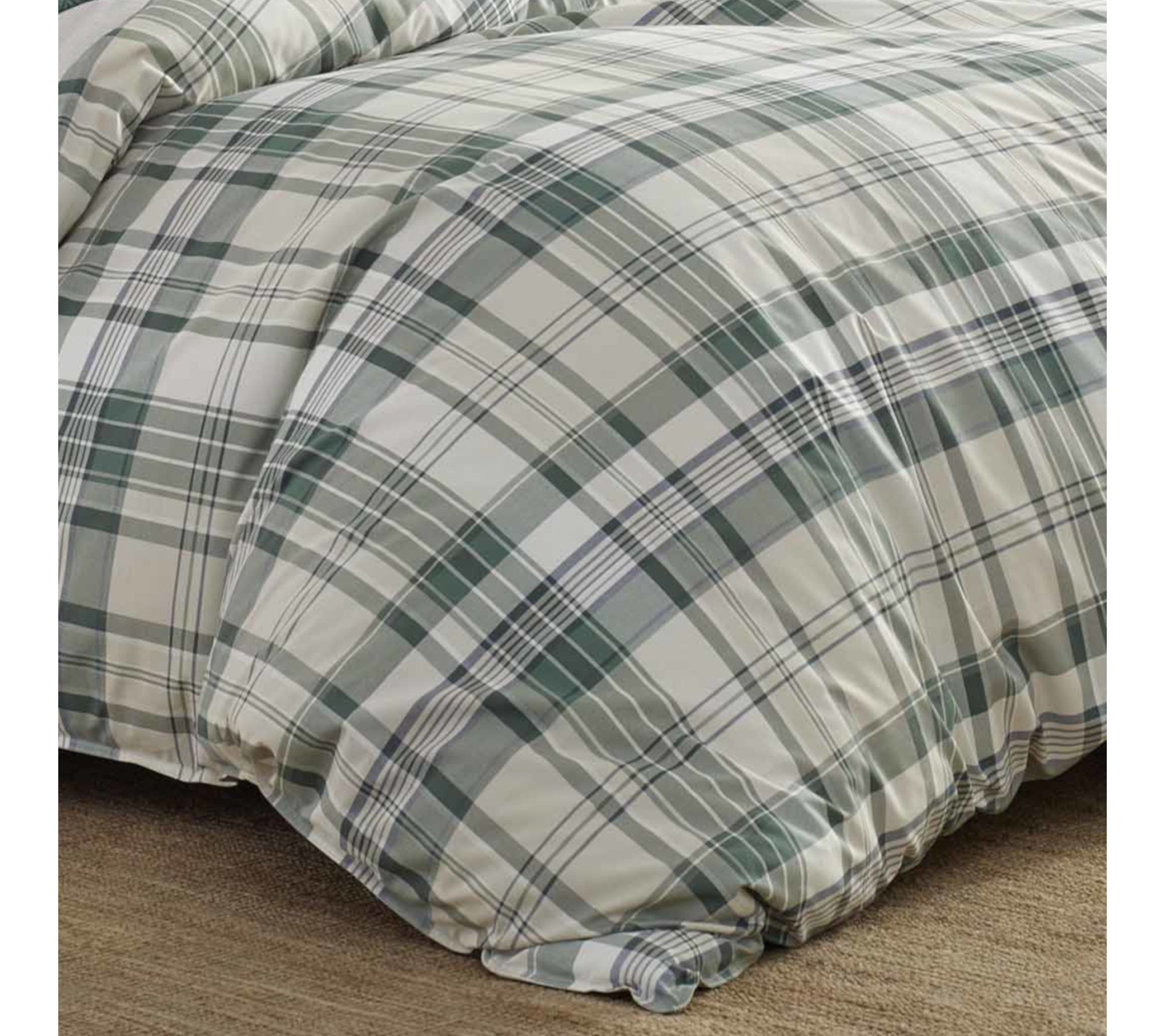Whether you're winding down after a busy day or waking up ready to take on the morning, this king comforter set welcomes you with a bold forest green plaid and soft cotton comfort. The double needle stitched edging brings a tidy, tailored look that adds warmth and style to your bedroom retreat. From Eddie Bauer.