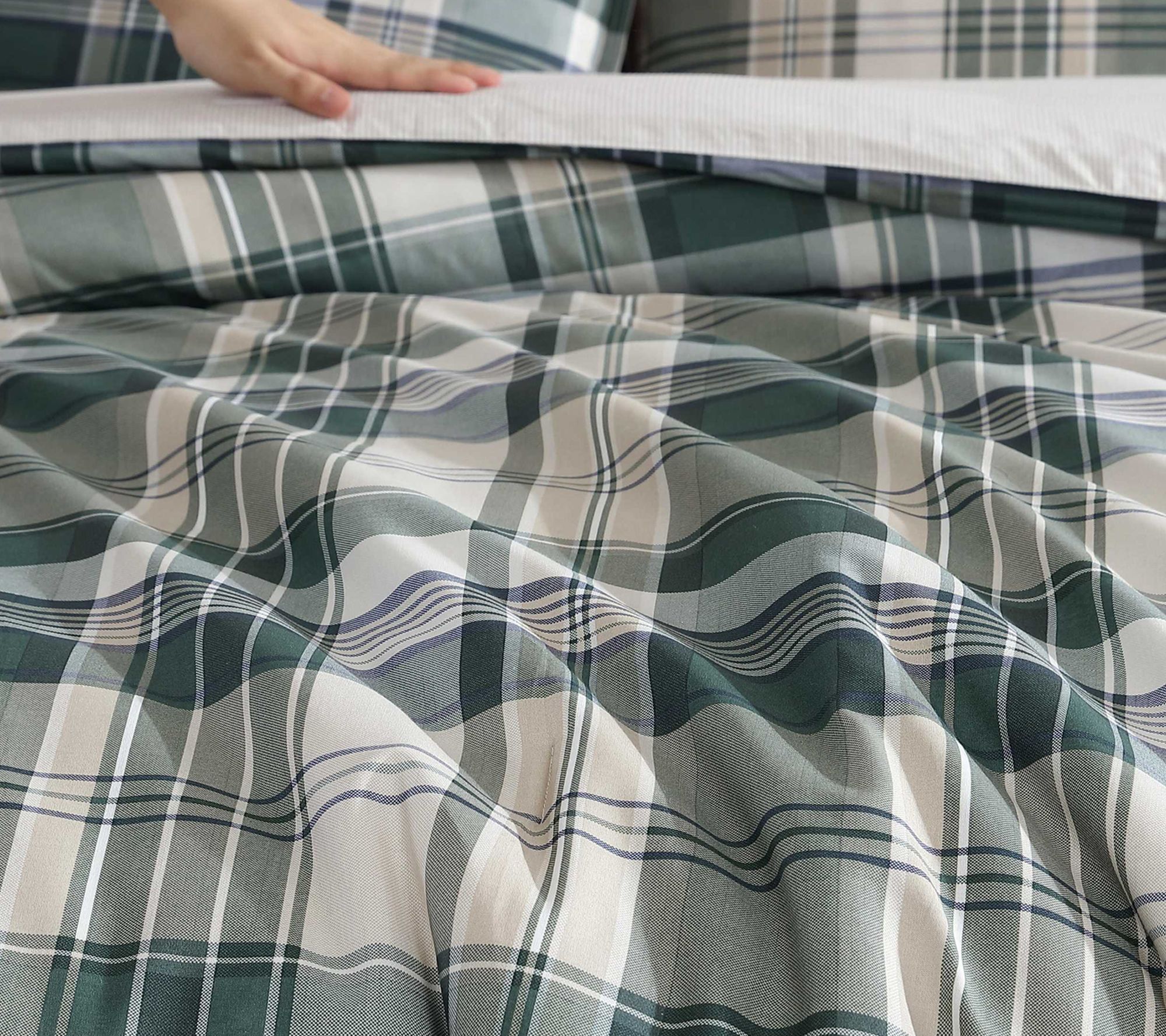 • Bold plaid pattern in forest green, pale khaki, and white with a shirting stripe reverse