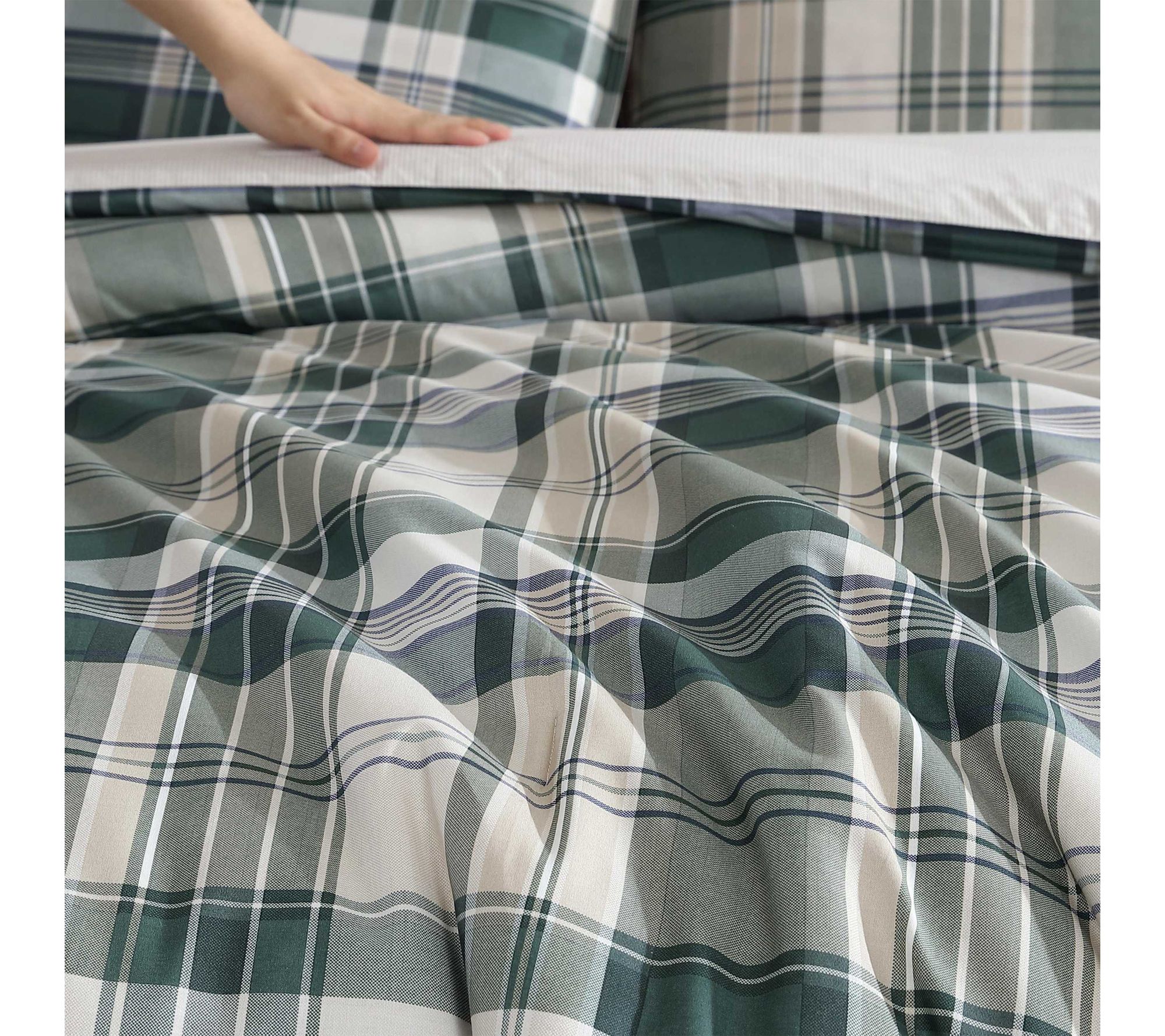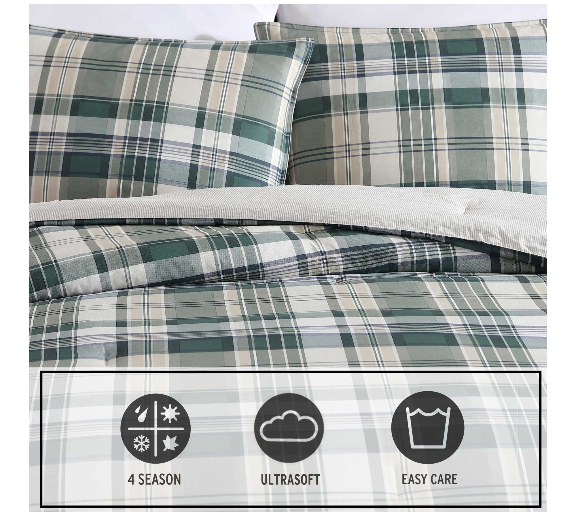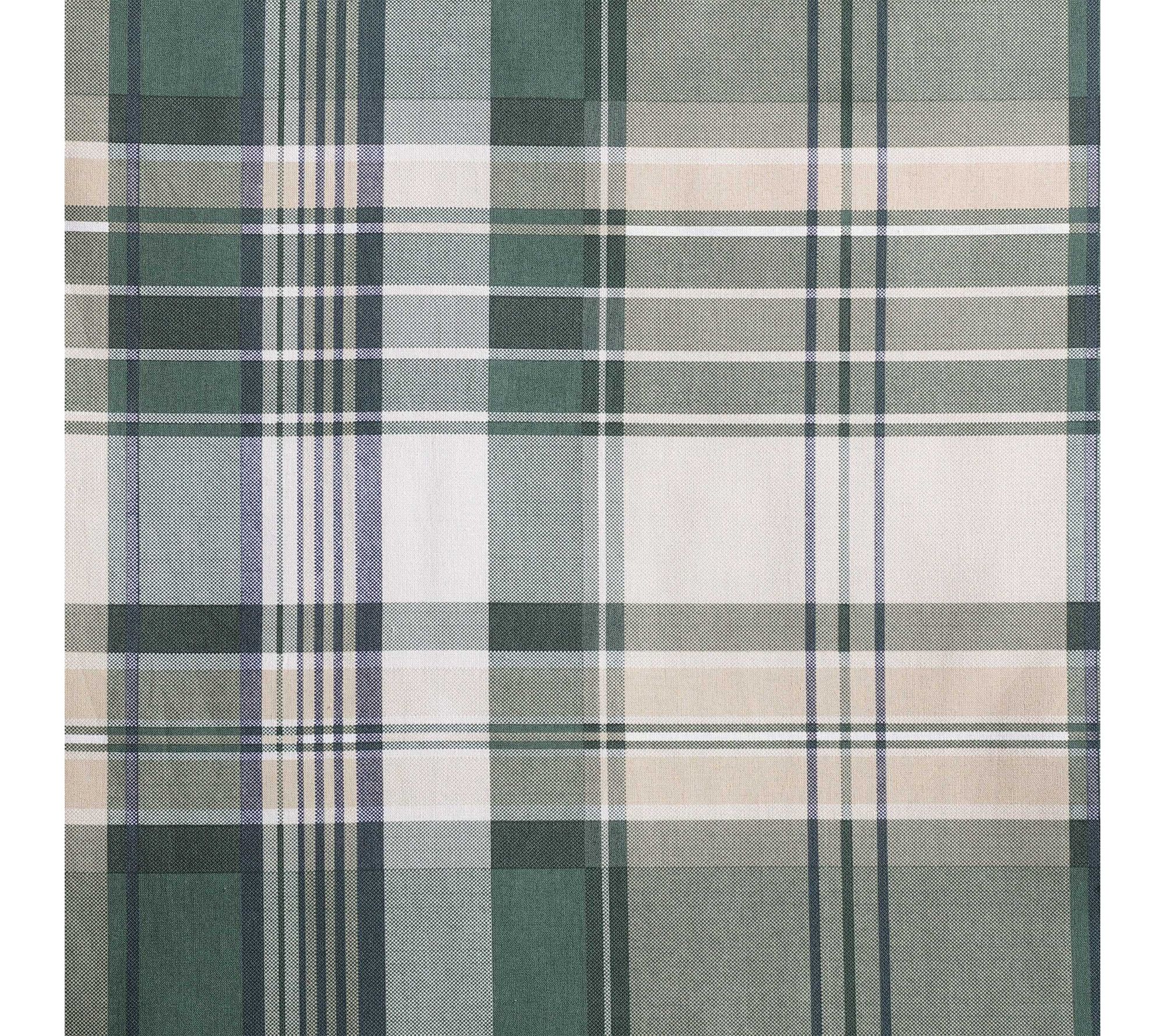 • Plaid pattern in forest green and pale khaki with shirting stripe reverse