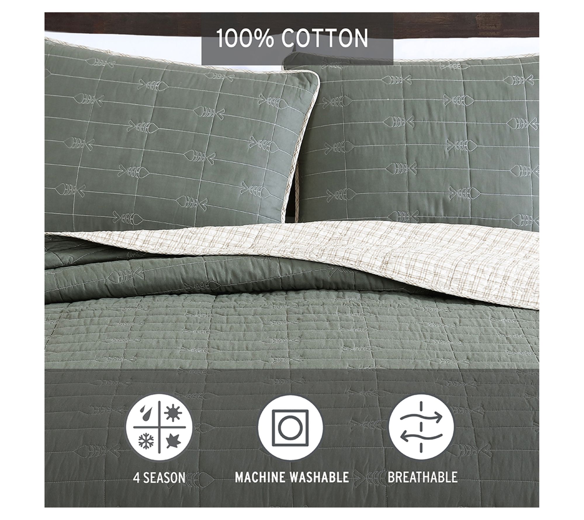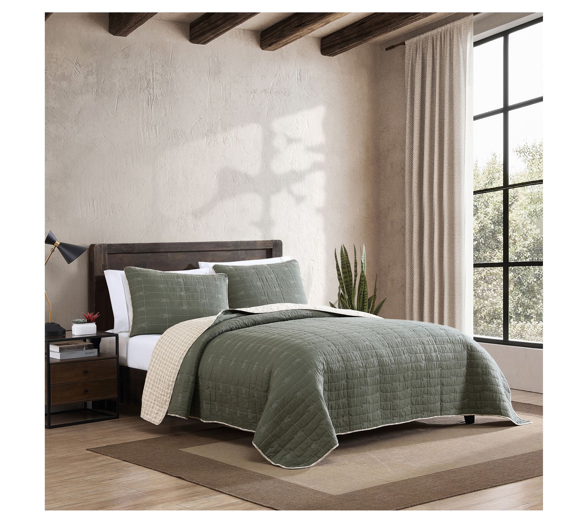 Transform your bedroom into a serene retreat with the Troutdale quilt and sham set. Inspired by the tranquility of Oregon's fishing spots, this reversible set features an iconic trout quilt stitch, finished in a modern solid army green that reverses to khaki for versatile styling. From Eddie Bauer.