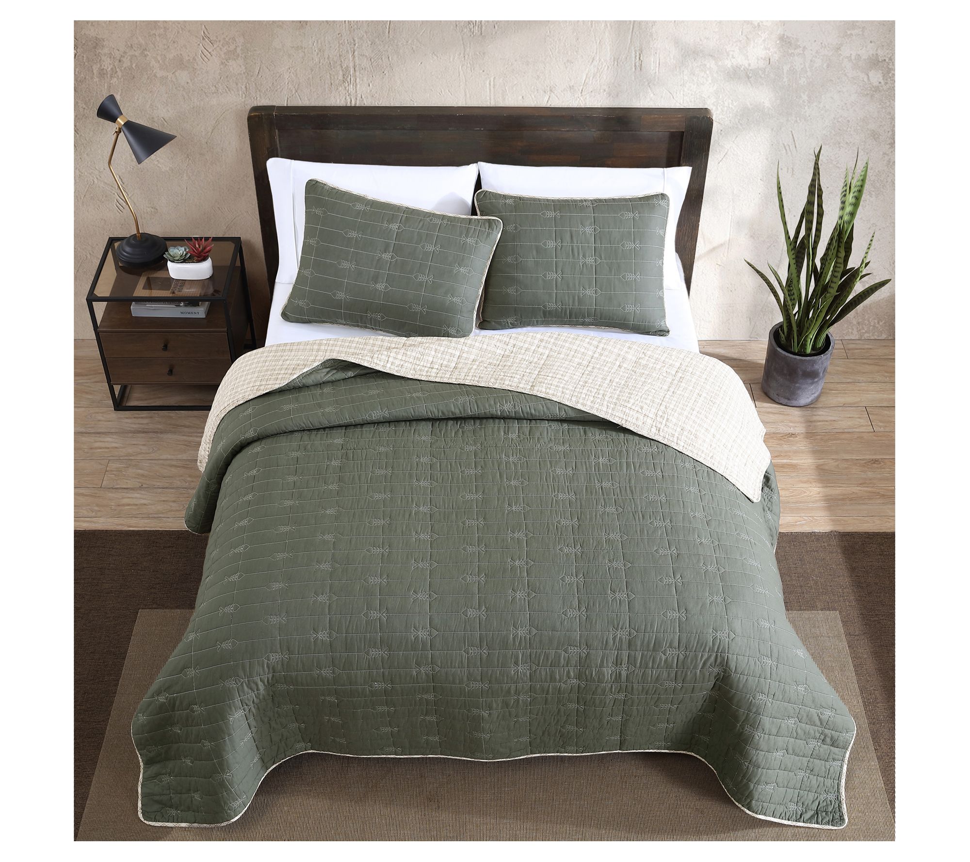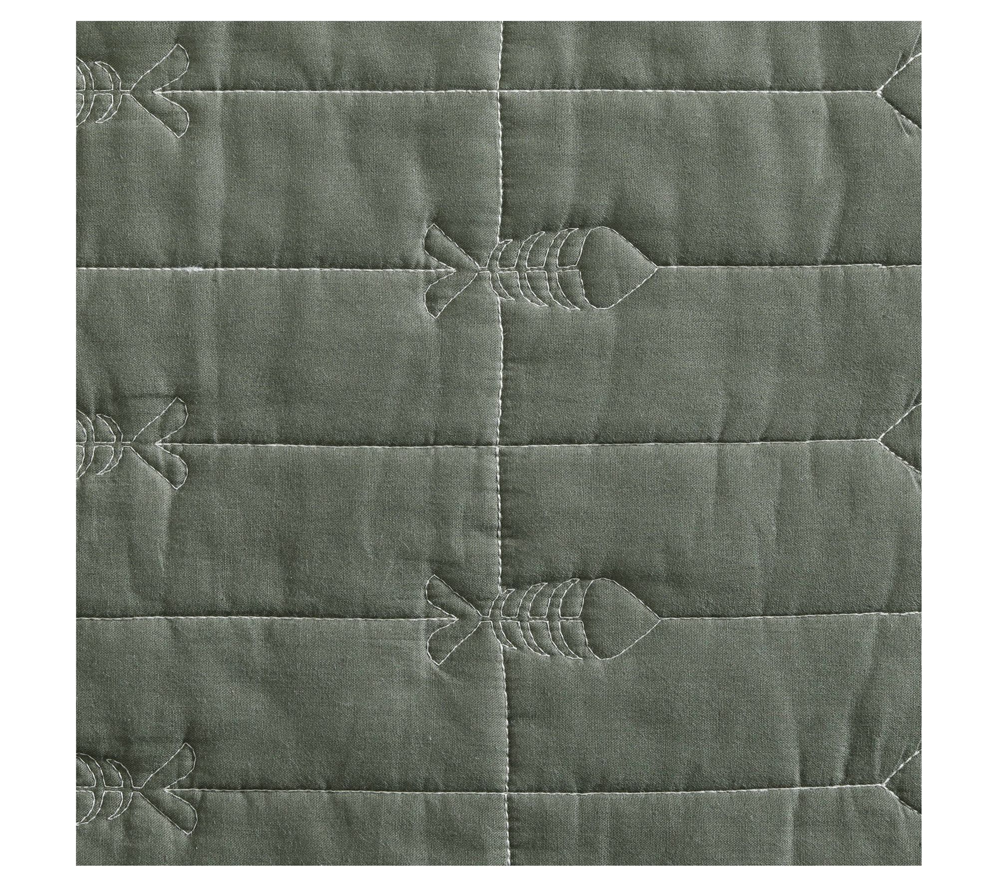 Enrich your bedroom with the classic charm of the Troutdale quilt and sham set by Eddie Bauer. Inspired by fishing in Oregon, this set features a subtle trout quilt stitch on a solid army green backdrop, reversing to khaki for added versatility. Pre-washed for extra softness, it brings a cozy, lived-in feel to any space. From Eddie Bauer.