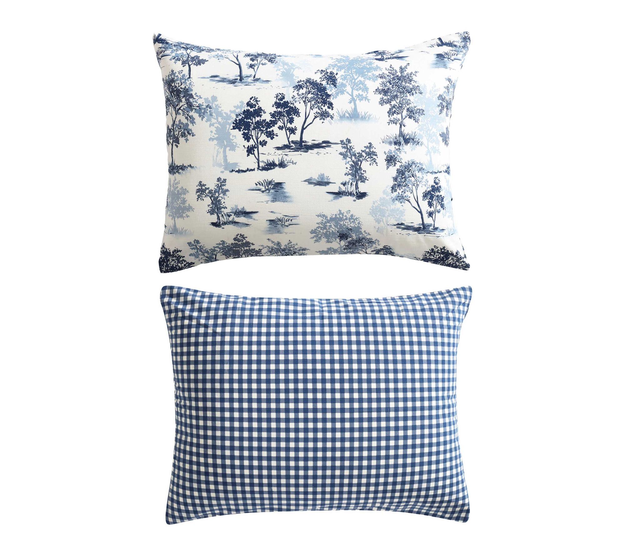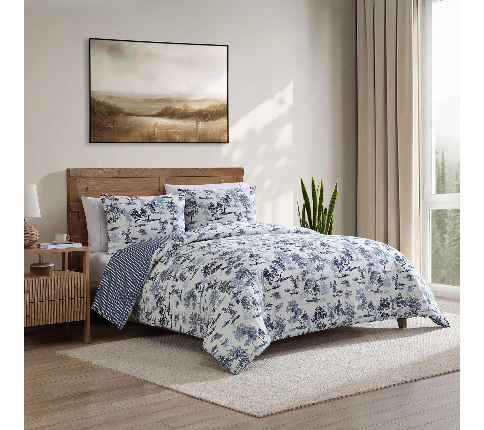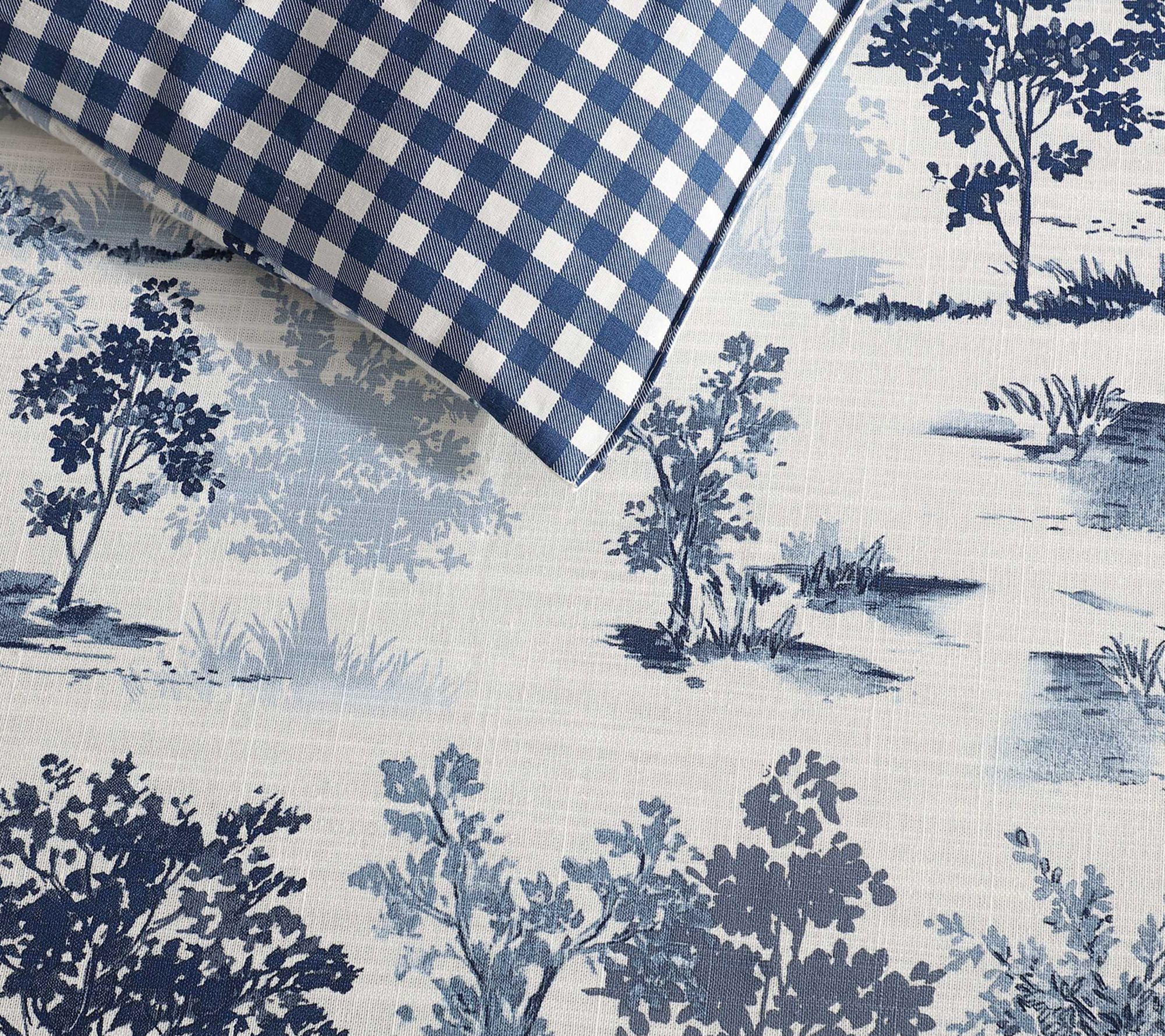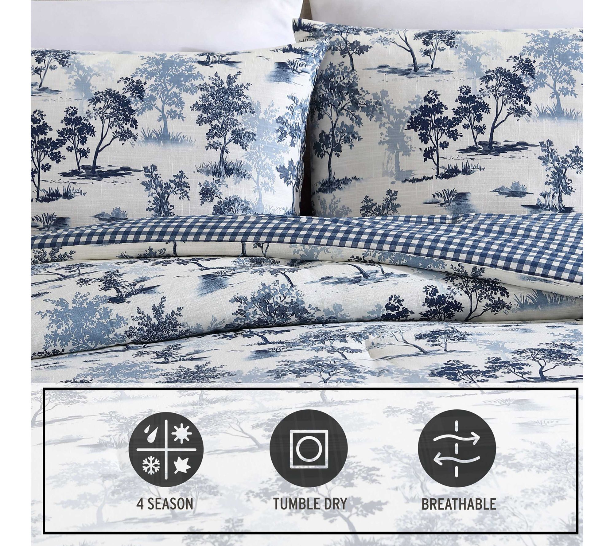 • Features a forest toile pattern in blue with a buffalo check plaid reverse