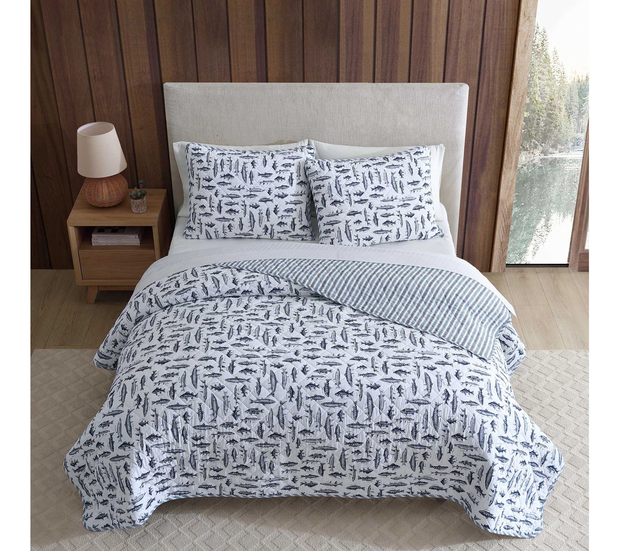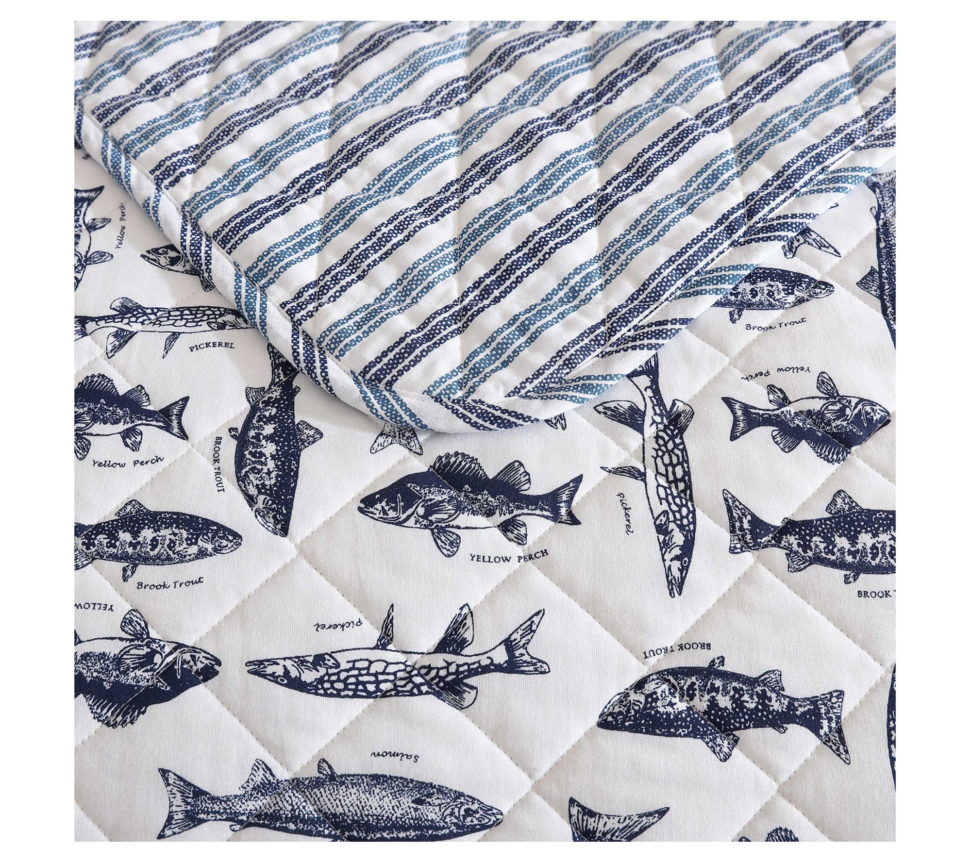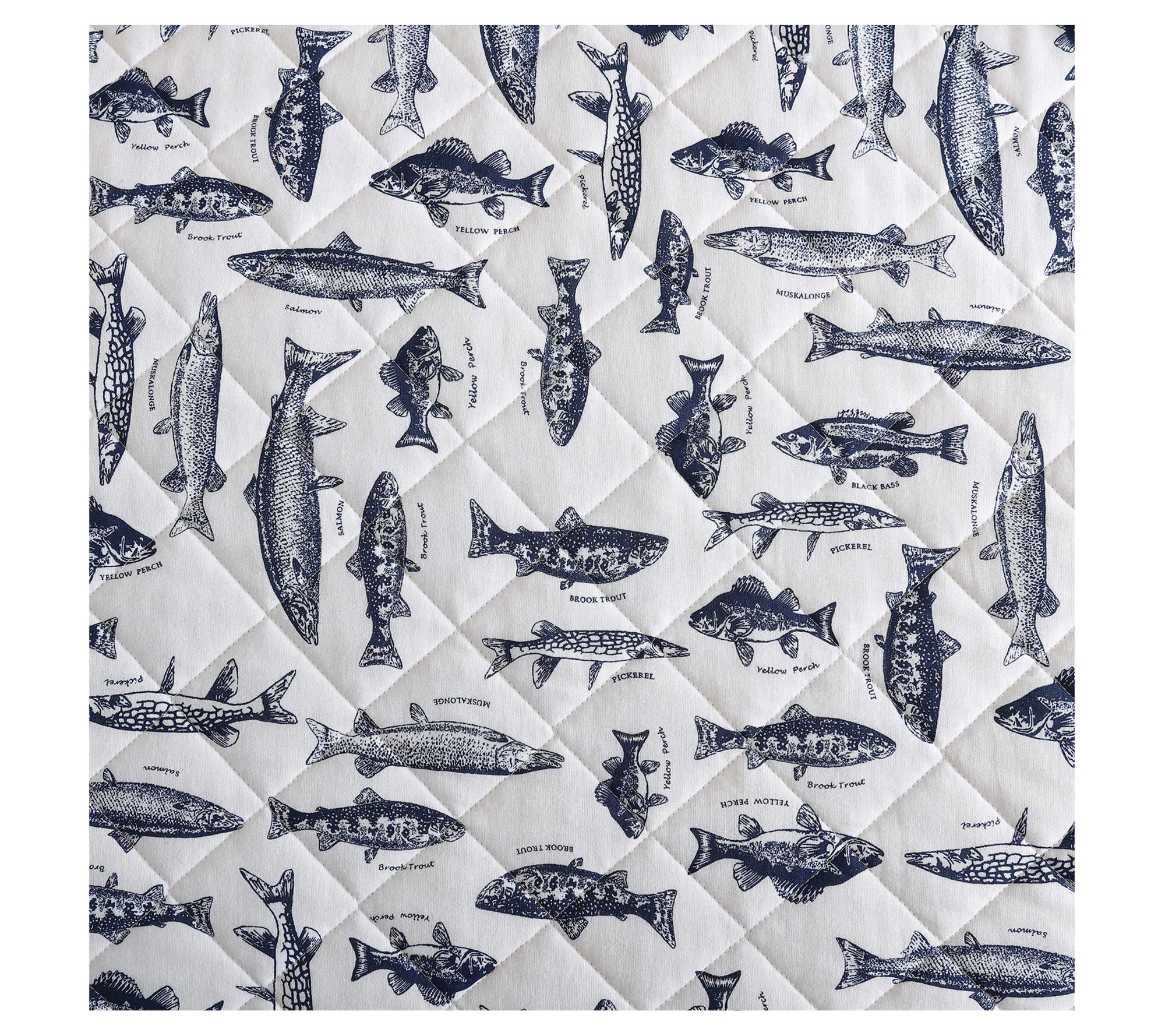 Immerse yourself in the tranquil charm of aquatic life with the Eddie Bauer Wes Fish quilt and sham set. Showcasing detailed sketches of various fish species in a classic navy on a neutral backdrop, this set will add character to any bedroom. The reversible design offers versatility with two distinct looks, completing the set with shams for a cohesive finish. Crafted from 100% cotton, the set is soft for year-round comfort. From Eddie Bauer.