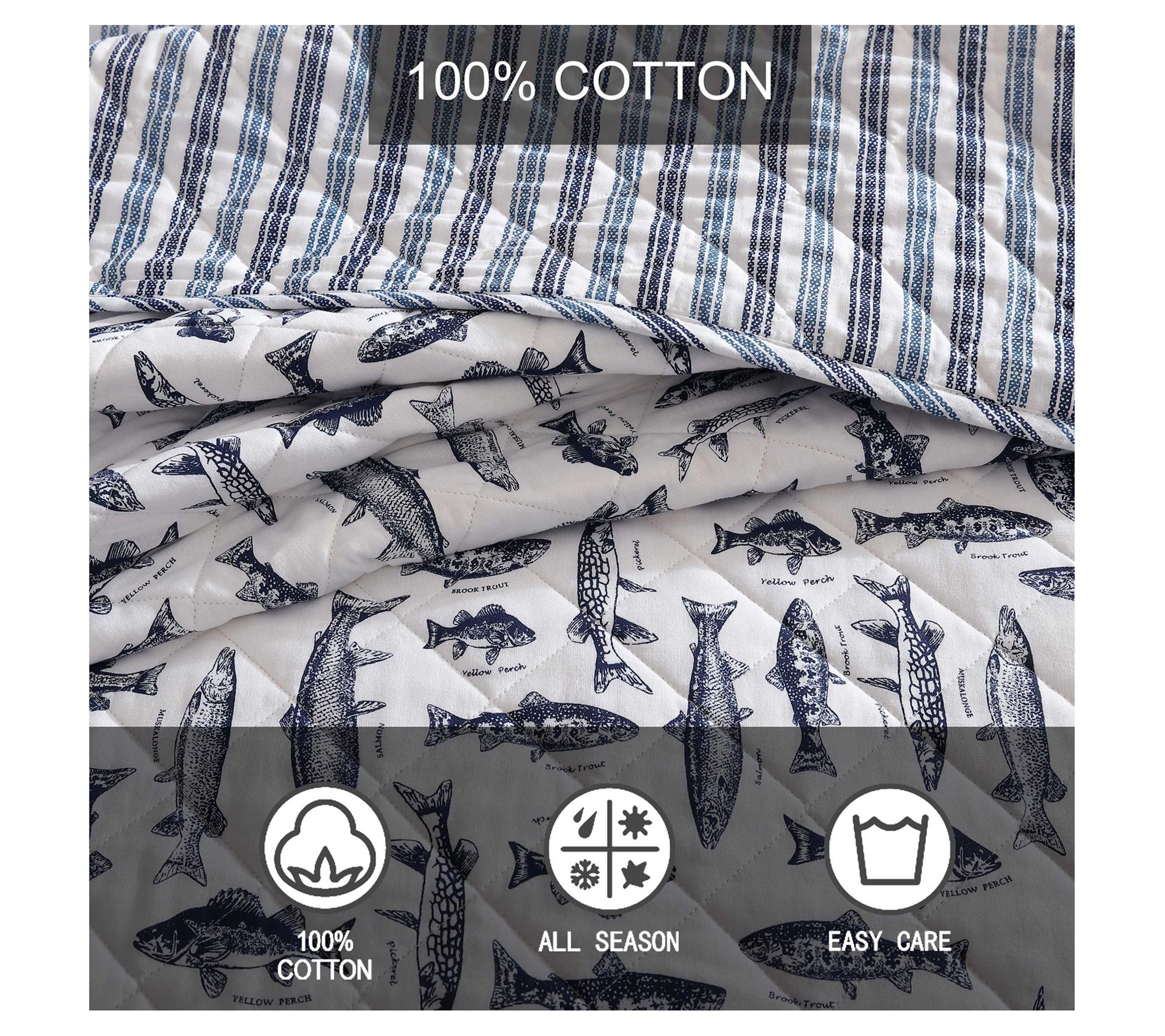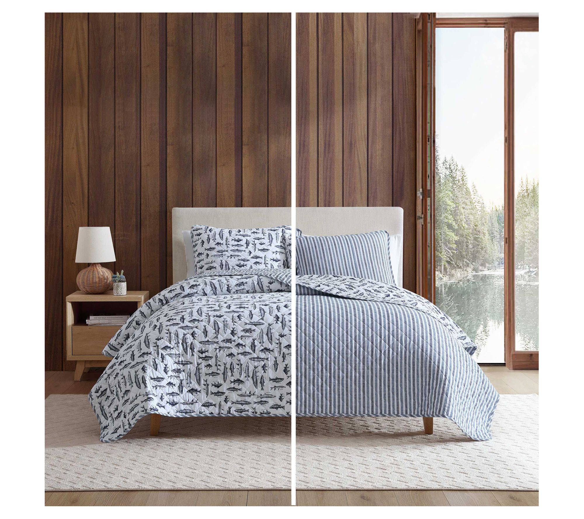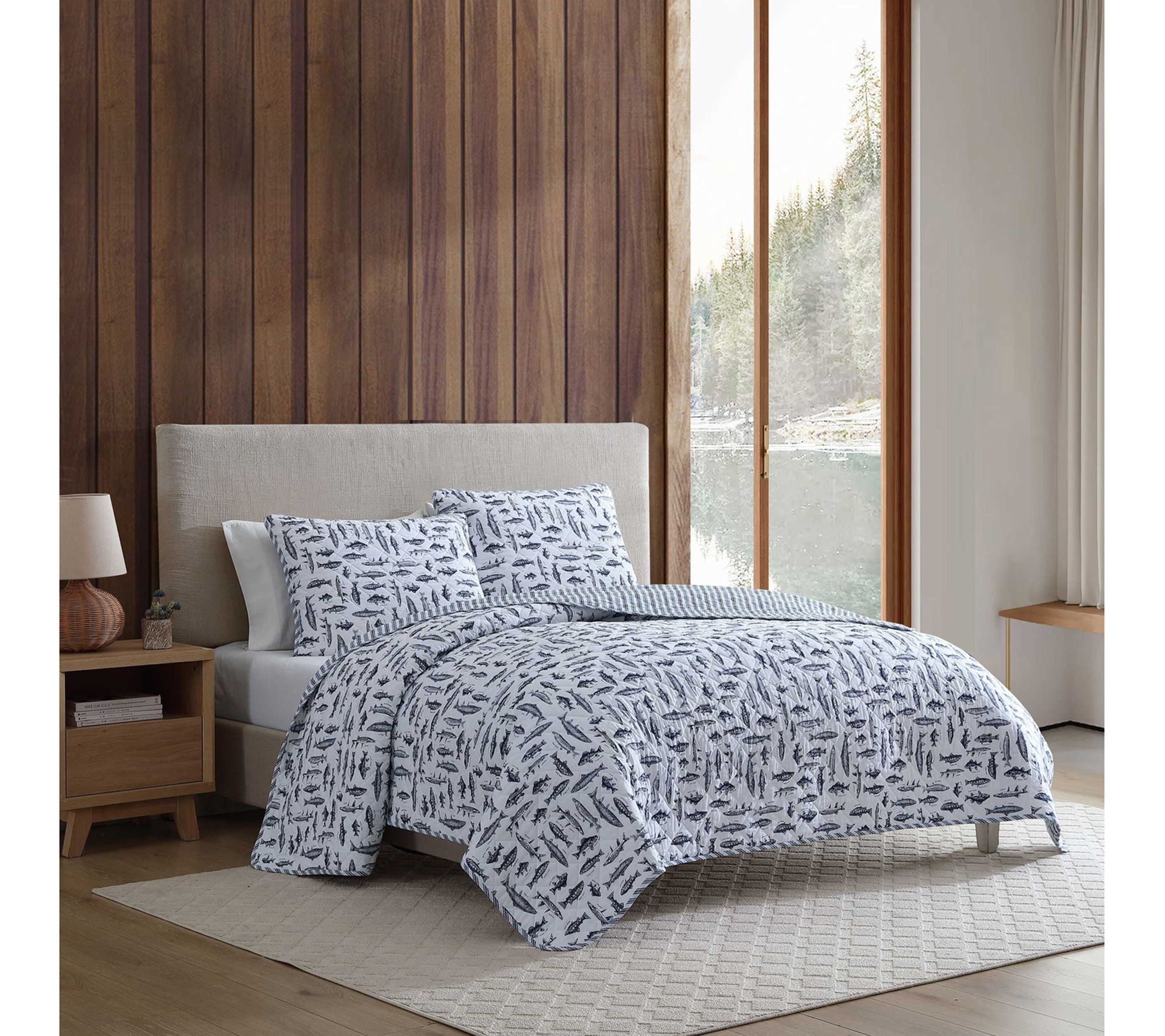 Immerse yourself in the tranquil charm of aquatic life with the Eddie Bauer Wes Fish quilt and sham set. Showcasing detailed sketches of various fish species in a classic navy on a neutral backdrop, this set will add character to any bedroom. The reversible design offers versatility with two distinct looks, completing the set with shams for a cohesive finish. Crafted from 100% cotton, the set is soft for year-round comfort. From Eddie Bauer.