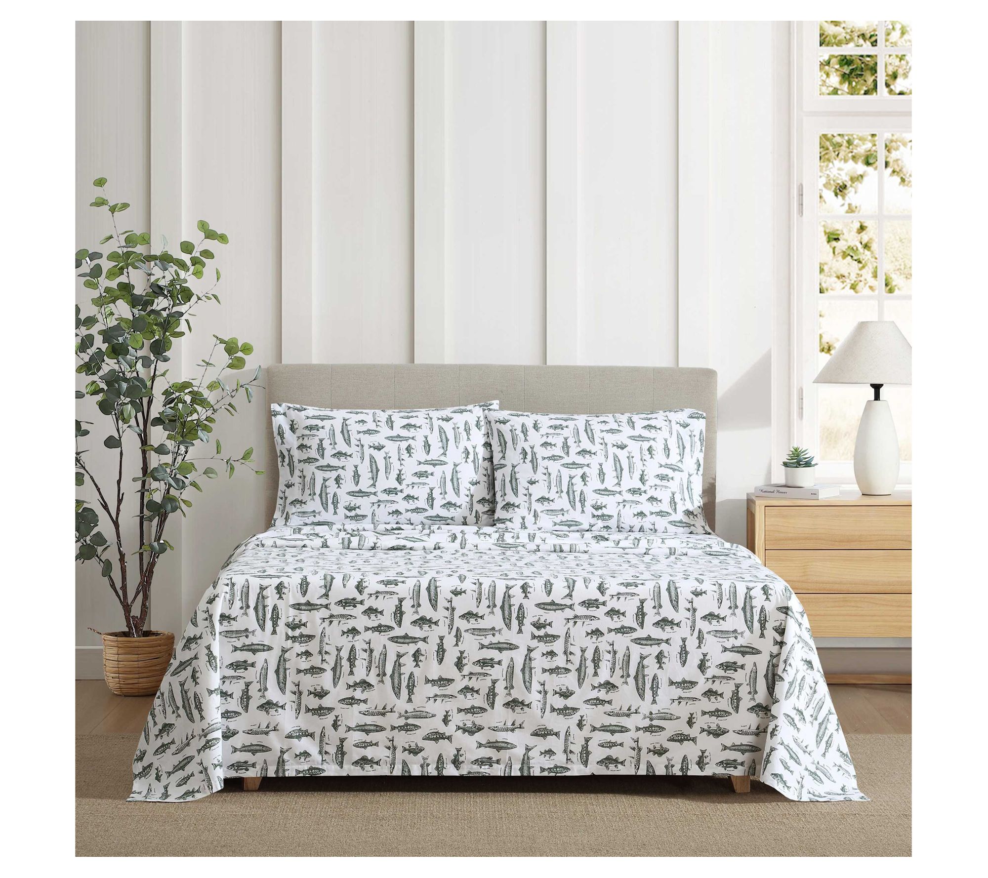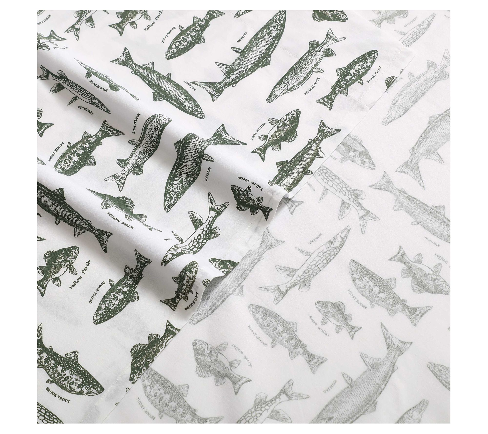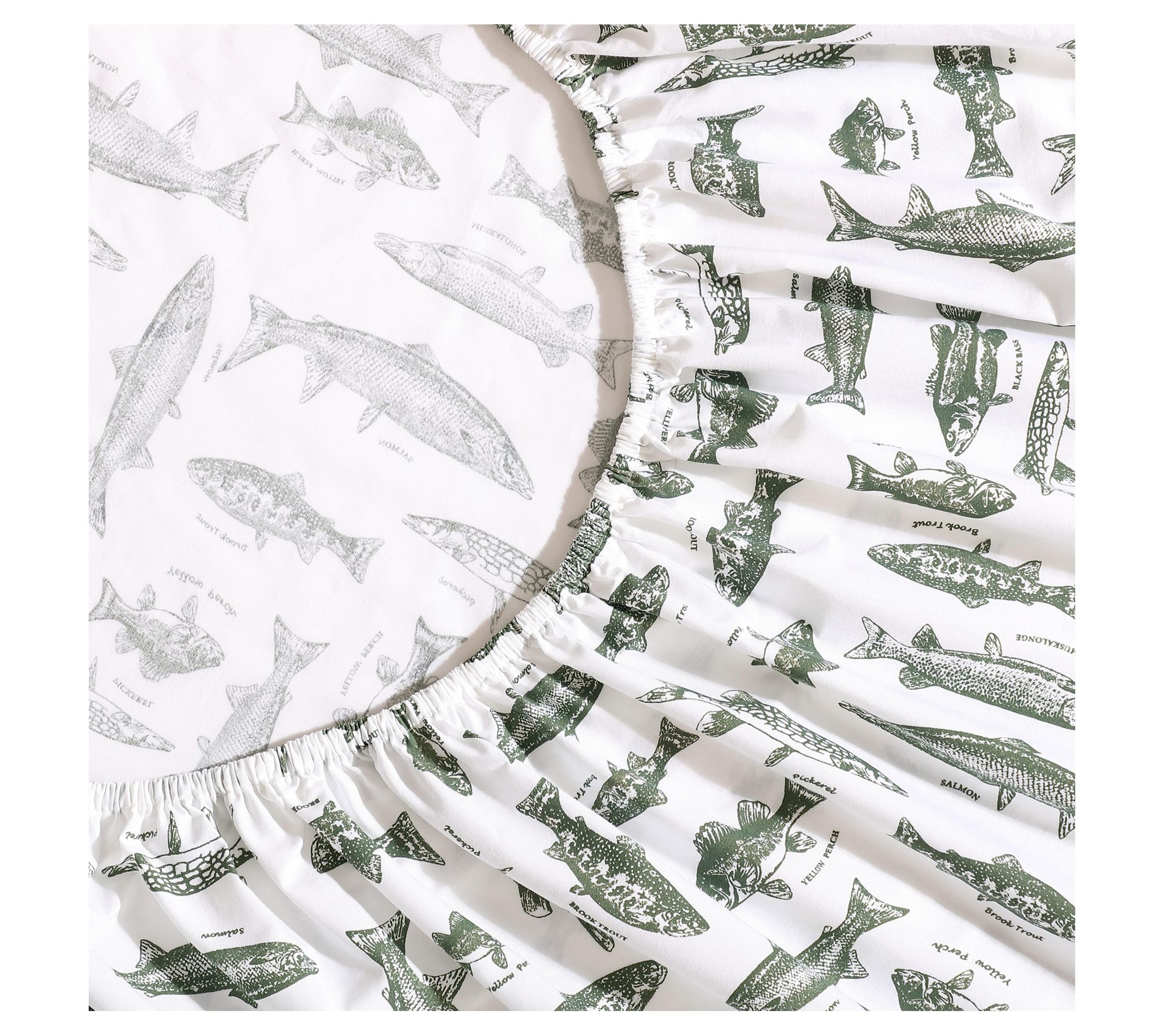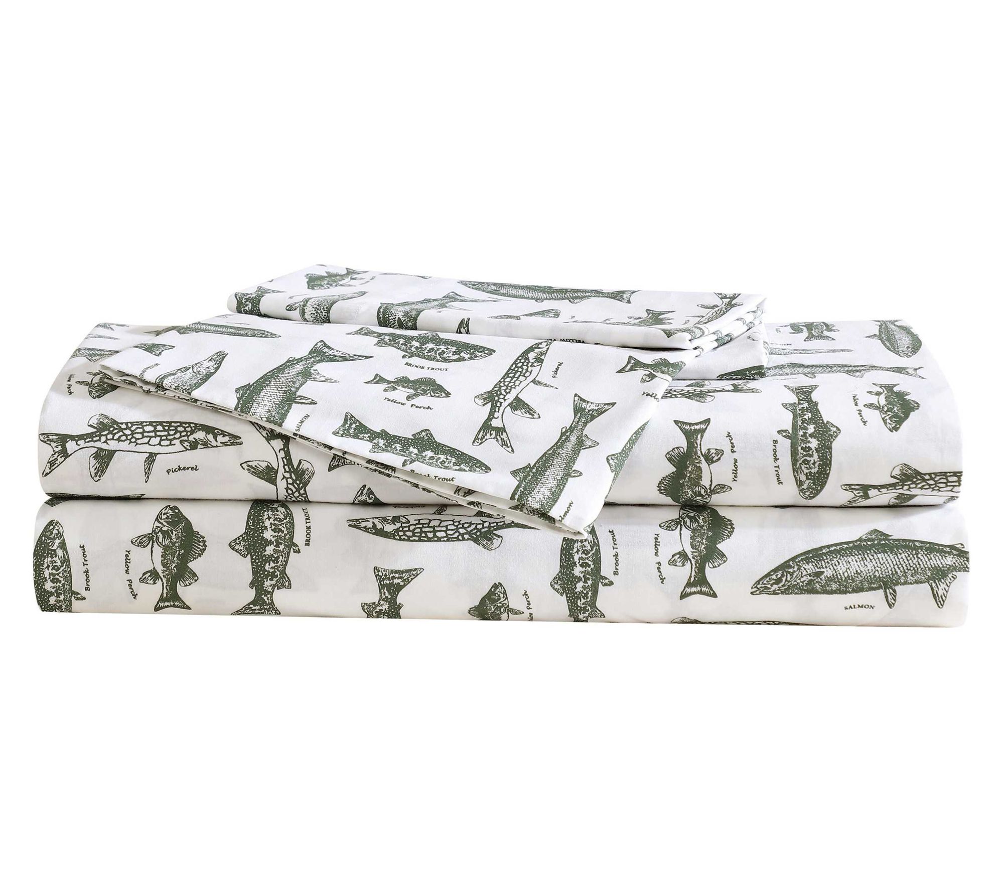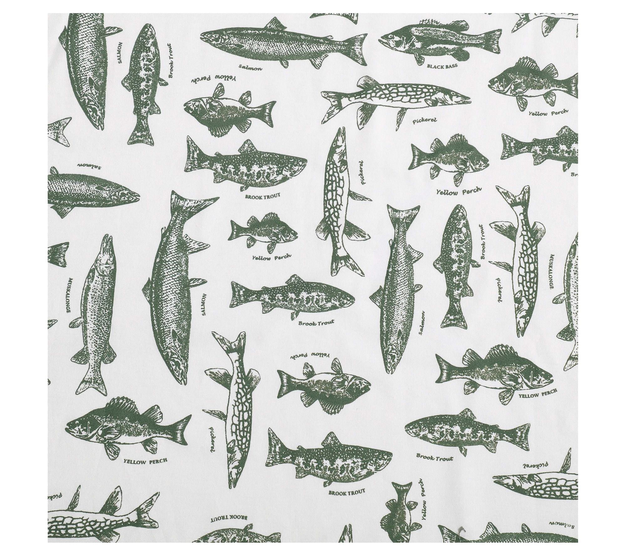 Bring the spirit of the outdoors to your retreat with this Eddie Bauer Wes Fish king sheet set, featuring crisp cotton percale and a playful aquatic sketch design in soothing green and white. The vintage fish motif adds character while staying versatile enough for a nature-inspired or rustic setting. With a smooth feel and easy-care comfort, this set keeps your bedroom inviting season after season. From Eddie Bauer.