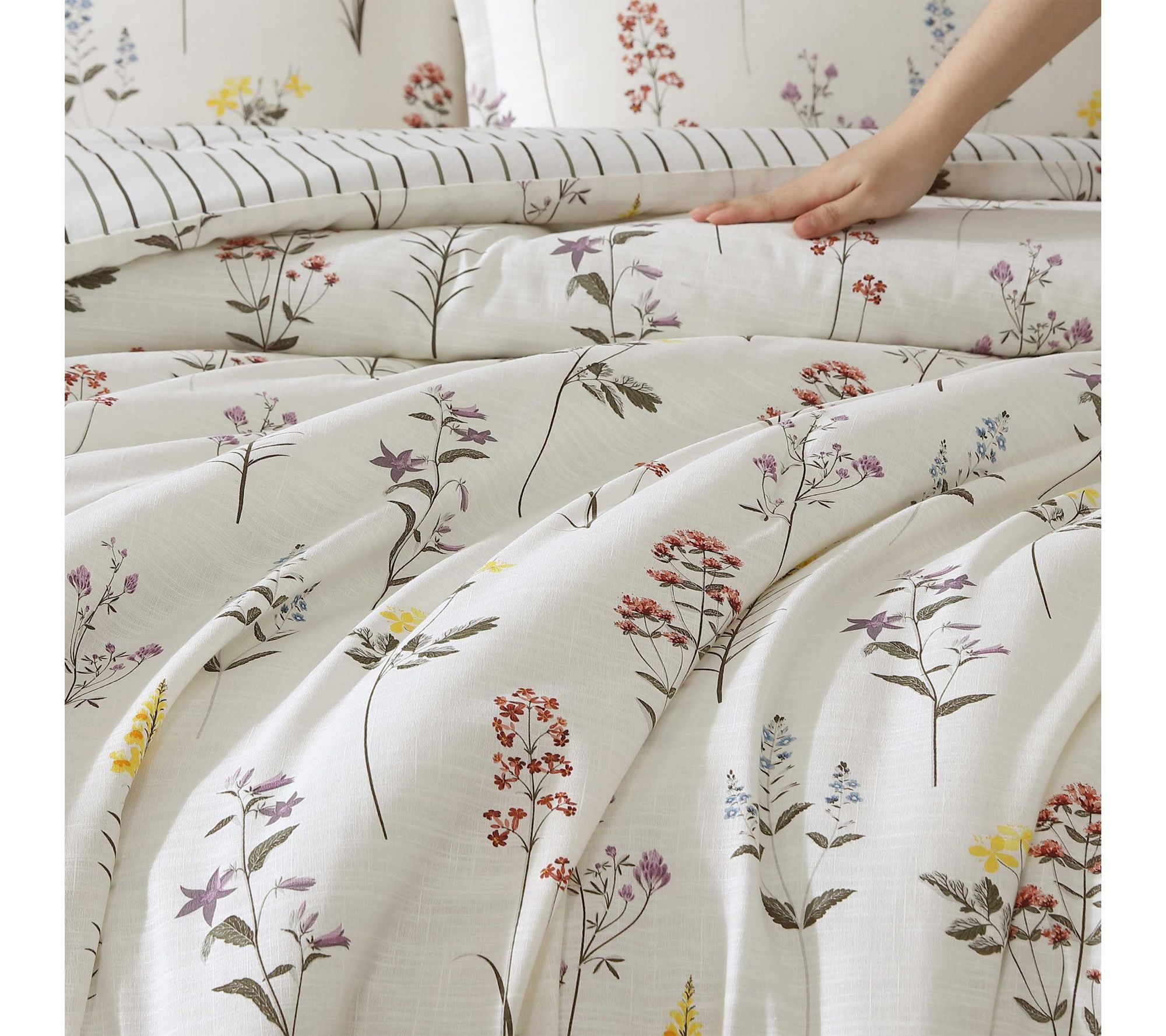 Create a restful escape with the Wildflower king comforter set, where artistic blooms and subtle green pinstripes invite visual interest and comfort into your bedroom. Soft cotton slub fabric adds dimension, while the reversible design gives you two charming looks for grounding your space. Easy to care for, this set welcomes vibrant poppies and gentle lavender sprigs with every wash. From Eddie Bauer.