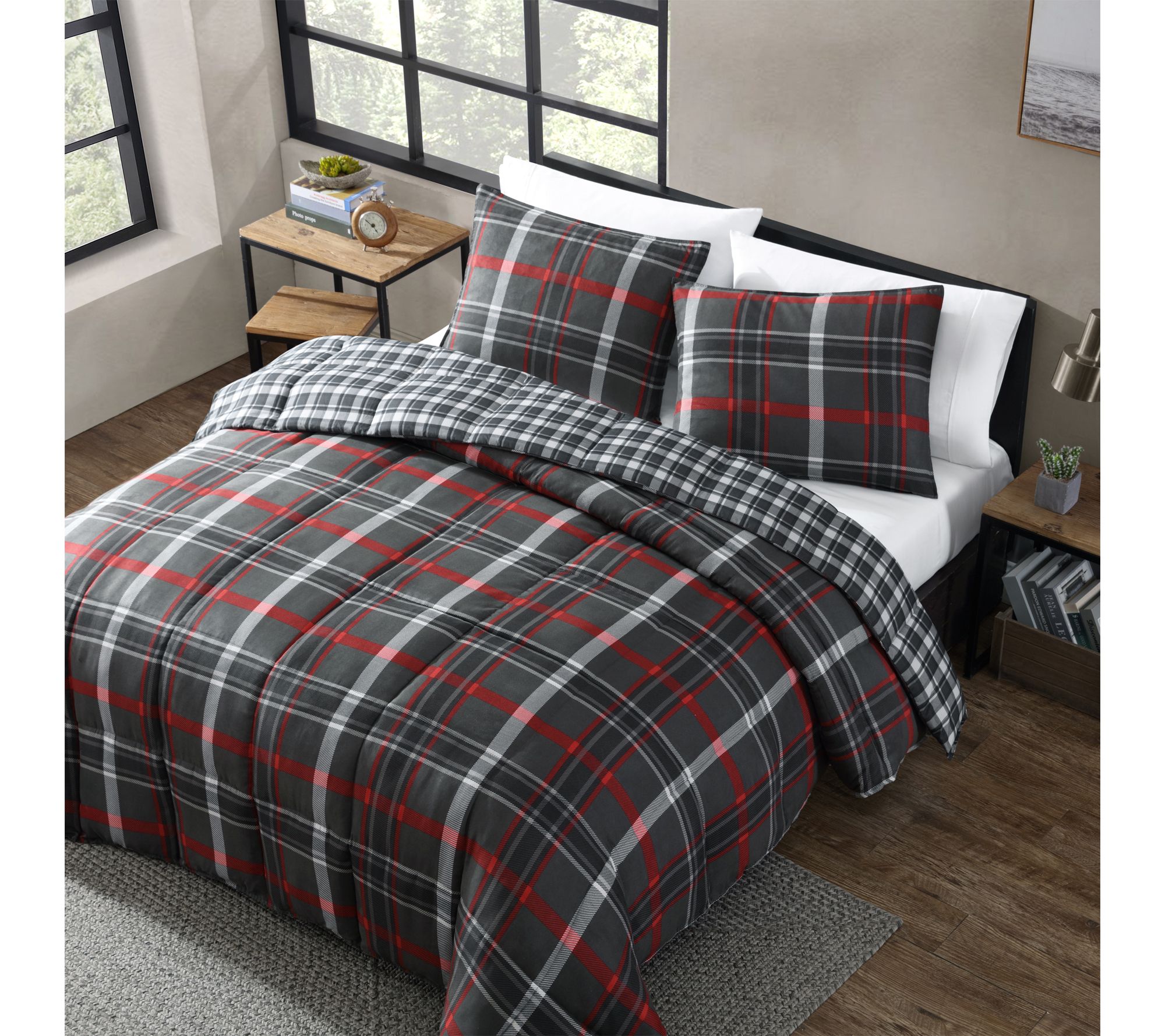 Refresh your bedroom retreat with this comforter set, designed to keep you cozy on chilly nights. Its plush polyester fill offers just-right warmth, while the micro-suede front and brushed microfiber back add an inviting texture to your bedding ensemble. Style it with your favorite sheets for a laid-back look that's effortlessly comfortable. From Eddie Bauer.