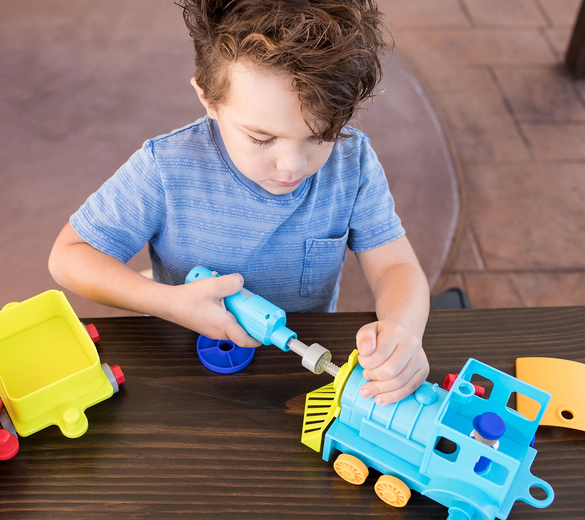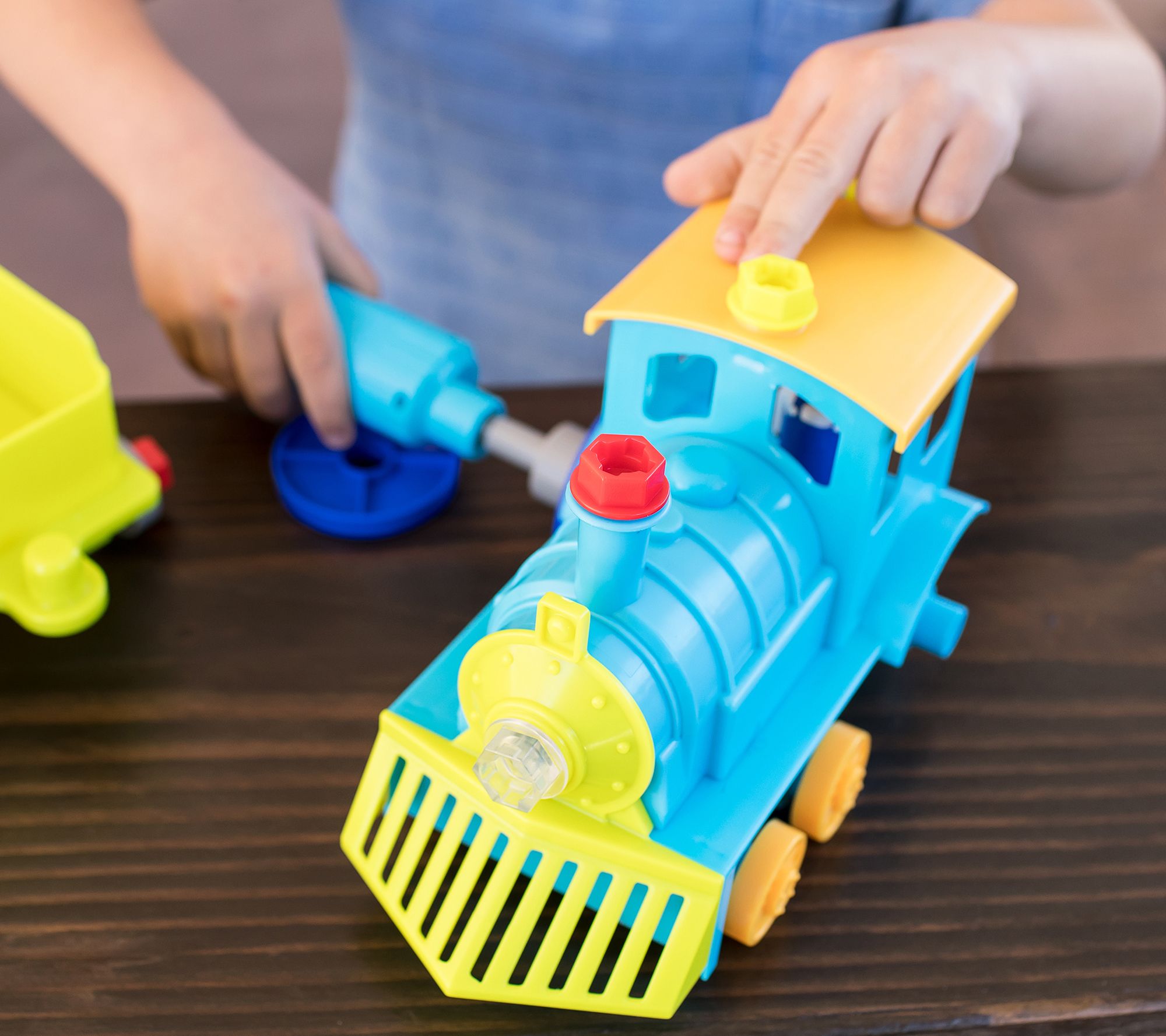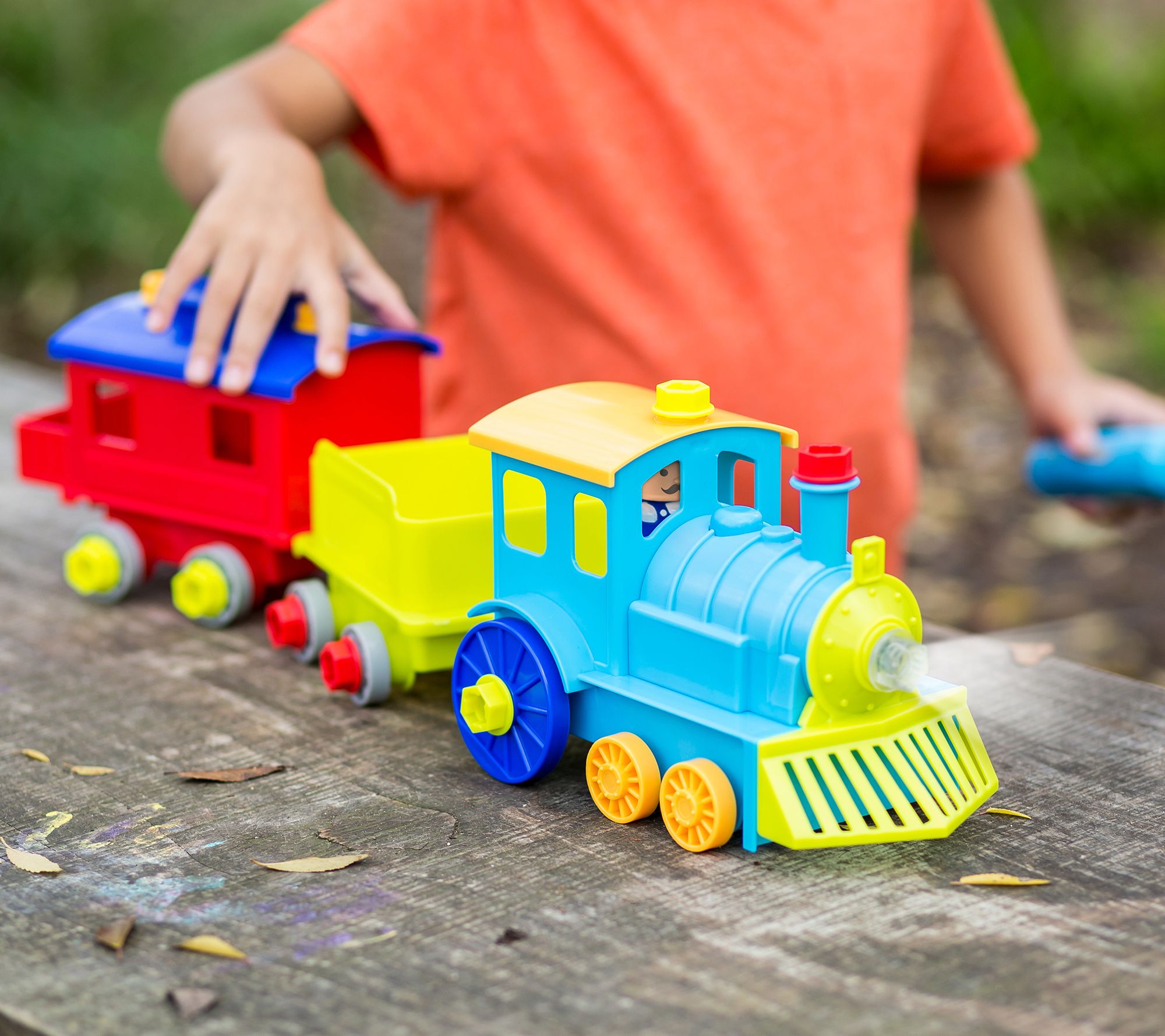 • Includes Design & Drill train engine car, hauling car, caboose, power drill, 25 colorful bolts, and conductor figurine