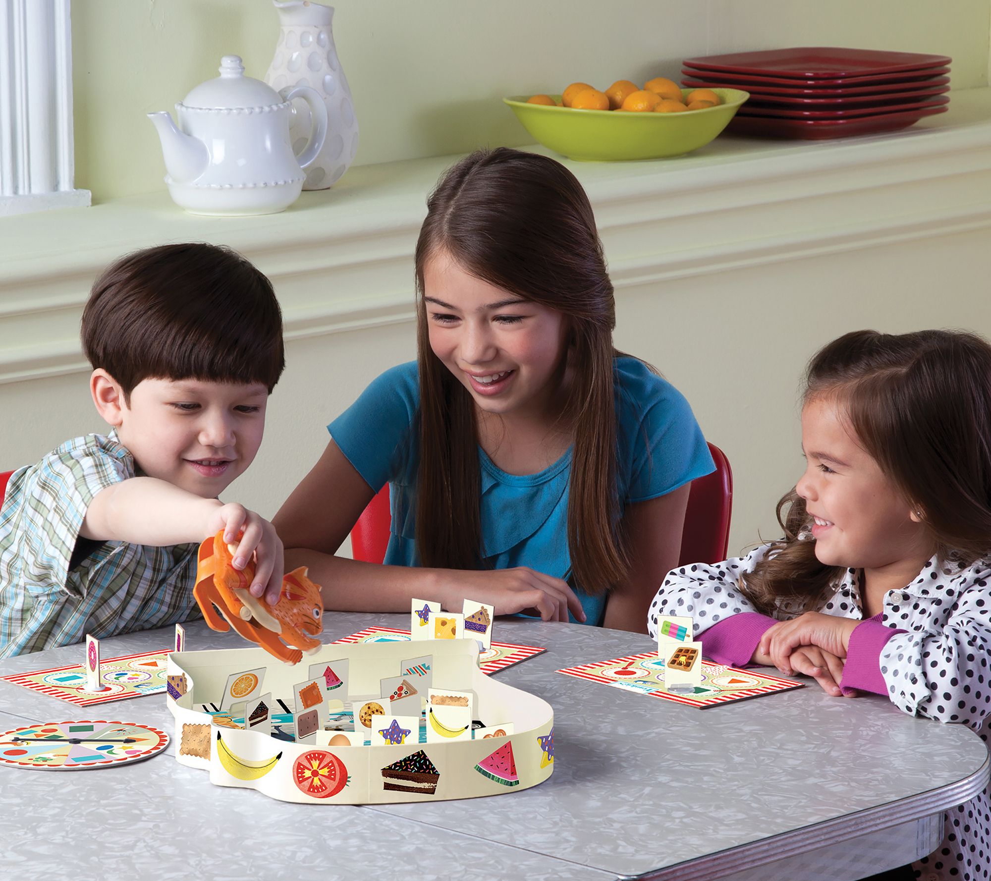 • Includes Frankie squeezer, 20 food game pieces, four placemat player boards, spinner, and game board