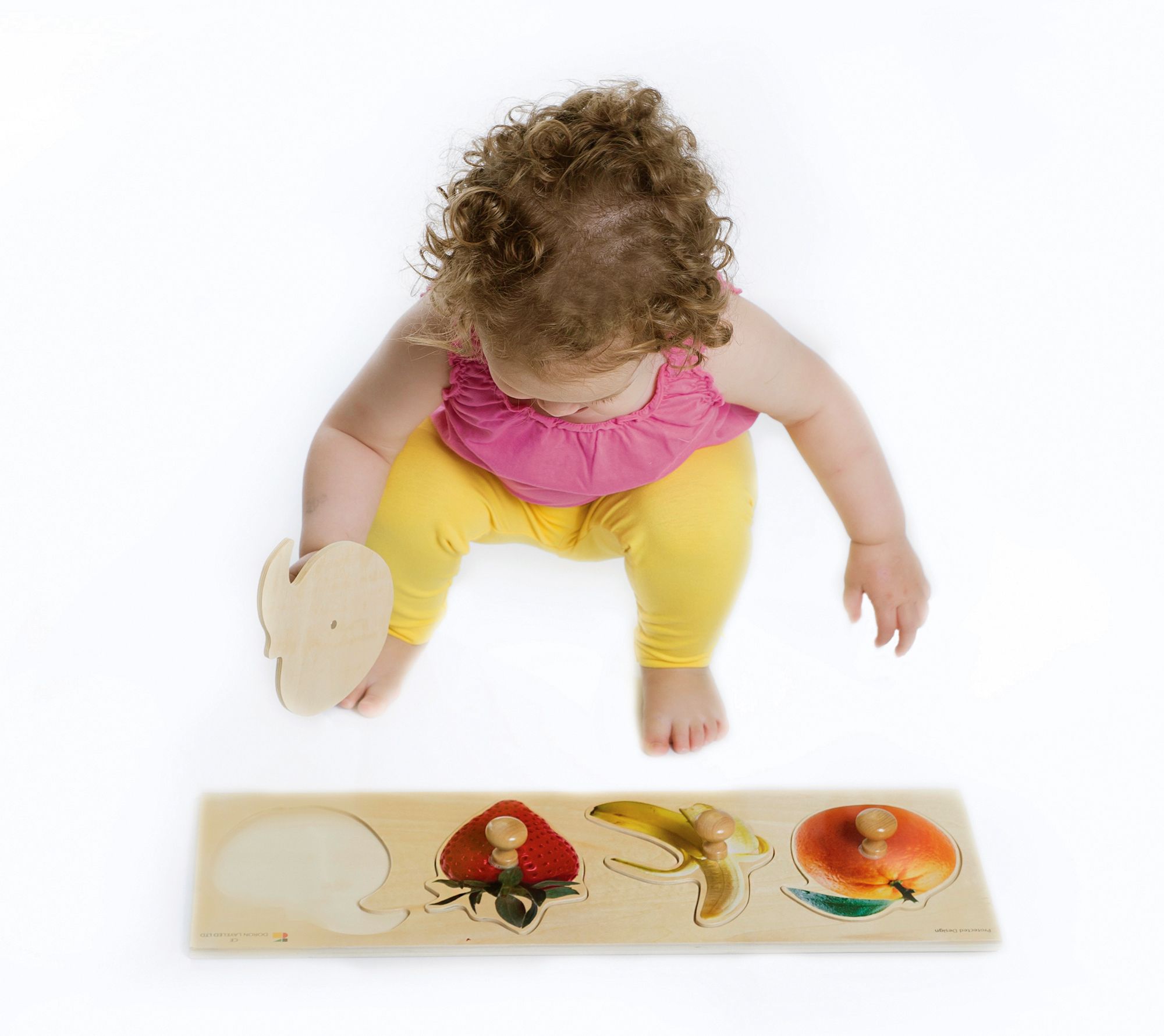 The extra big wooden knobs on these puzzle pieces make it easy for little hands to remove and place. From Edushape.