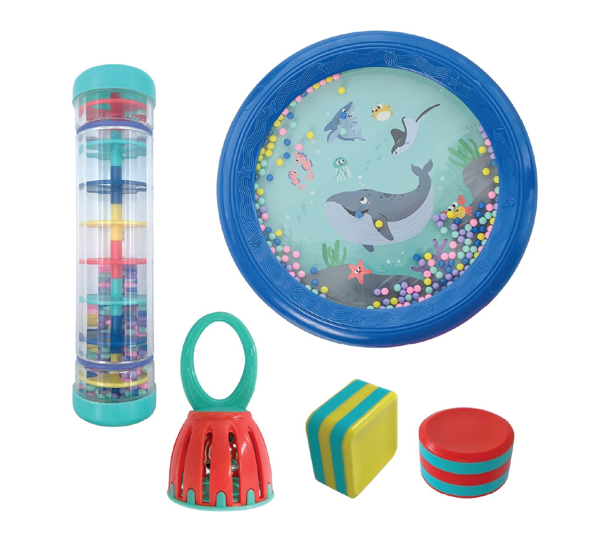• Includes 8" rainstick, Sea World Drum, various shakers, and a bell (total of five pieces)