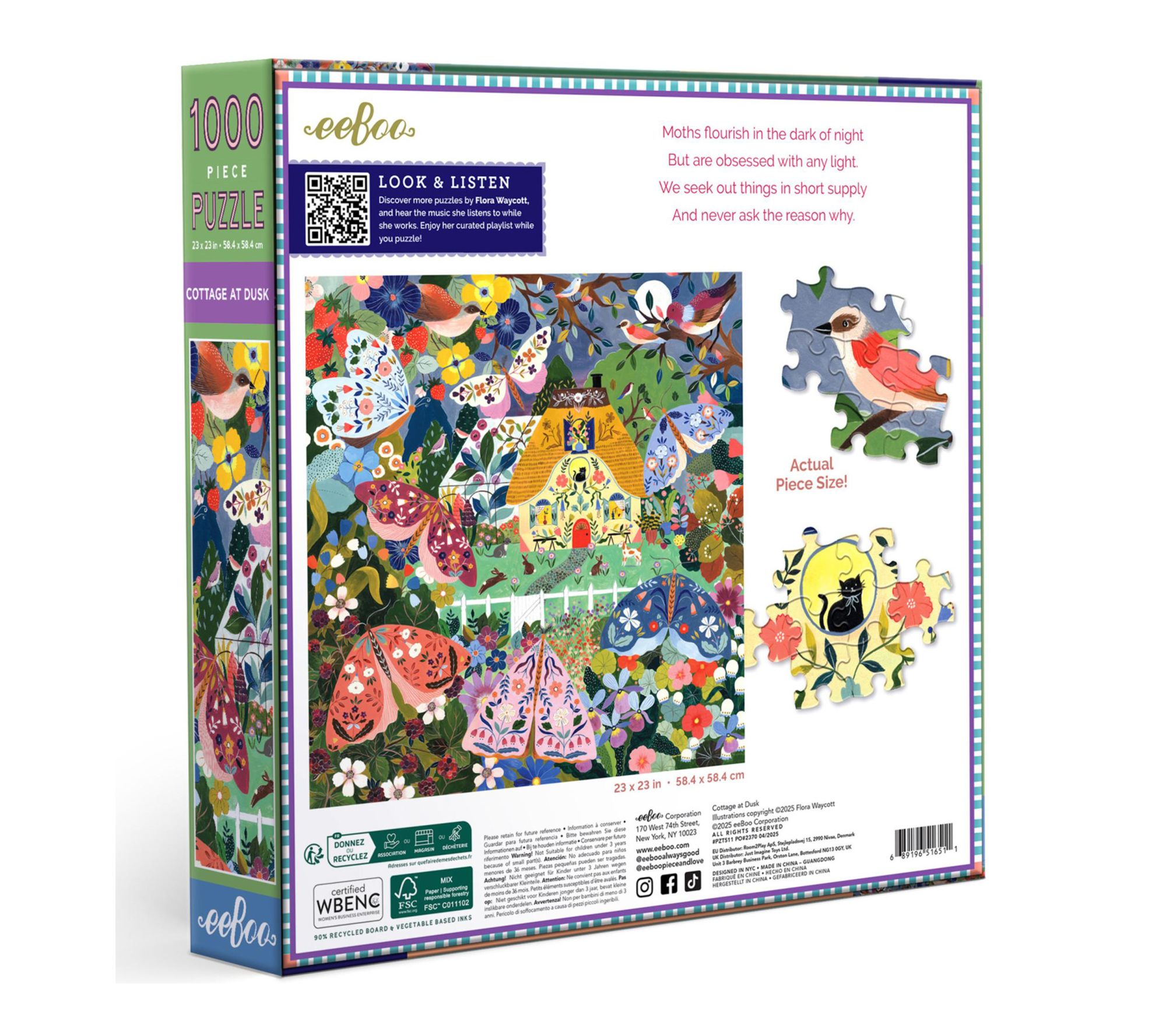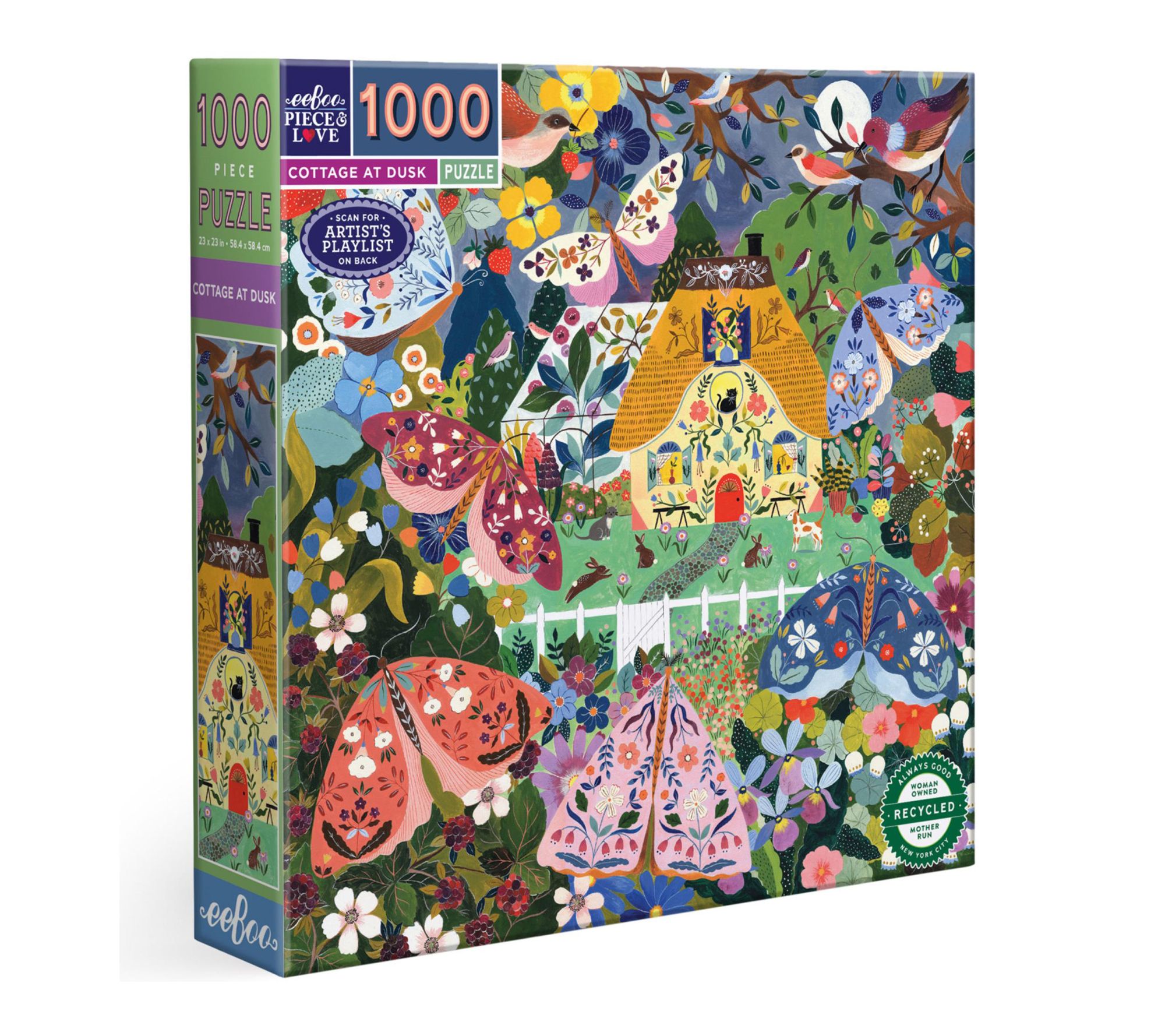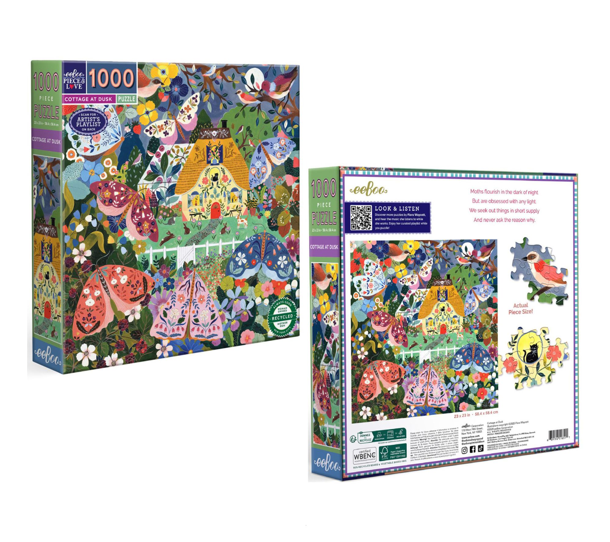 Experience the enchanting beauty of twilight with the eeBoo Piece & Love Cottage at Dusk 1,000-piece square jigsaw puzzle. Artist Flora Waycott brings the night alive with a vibrant display of colorful moths and blooming flowers that create a magical atmosphere. From eeBoo.