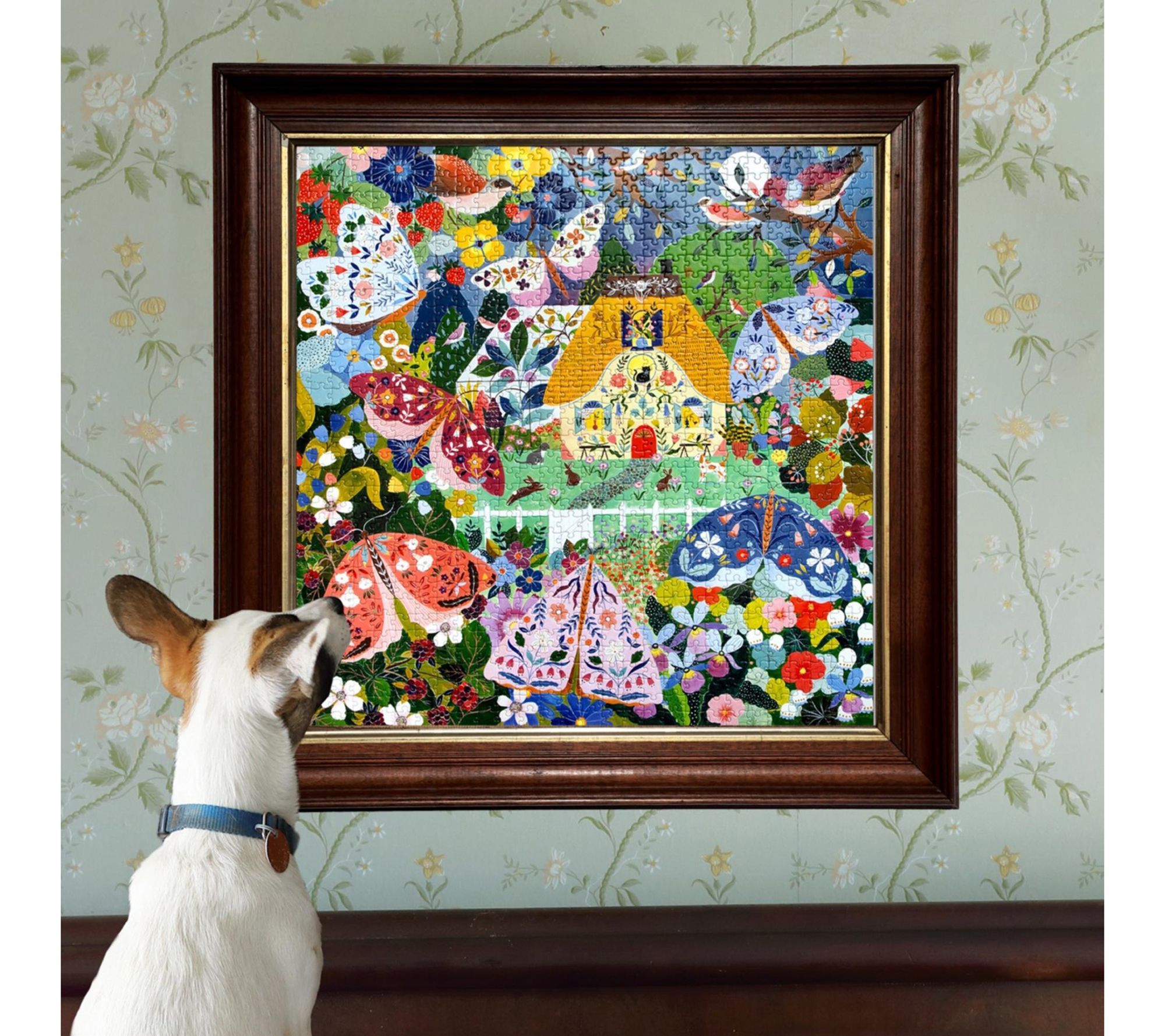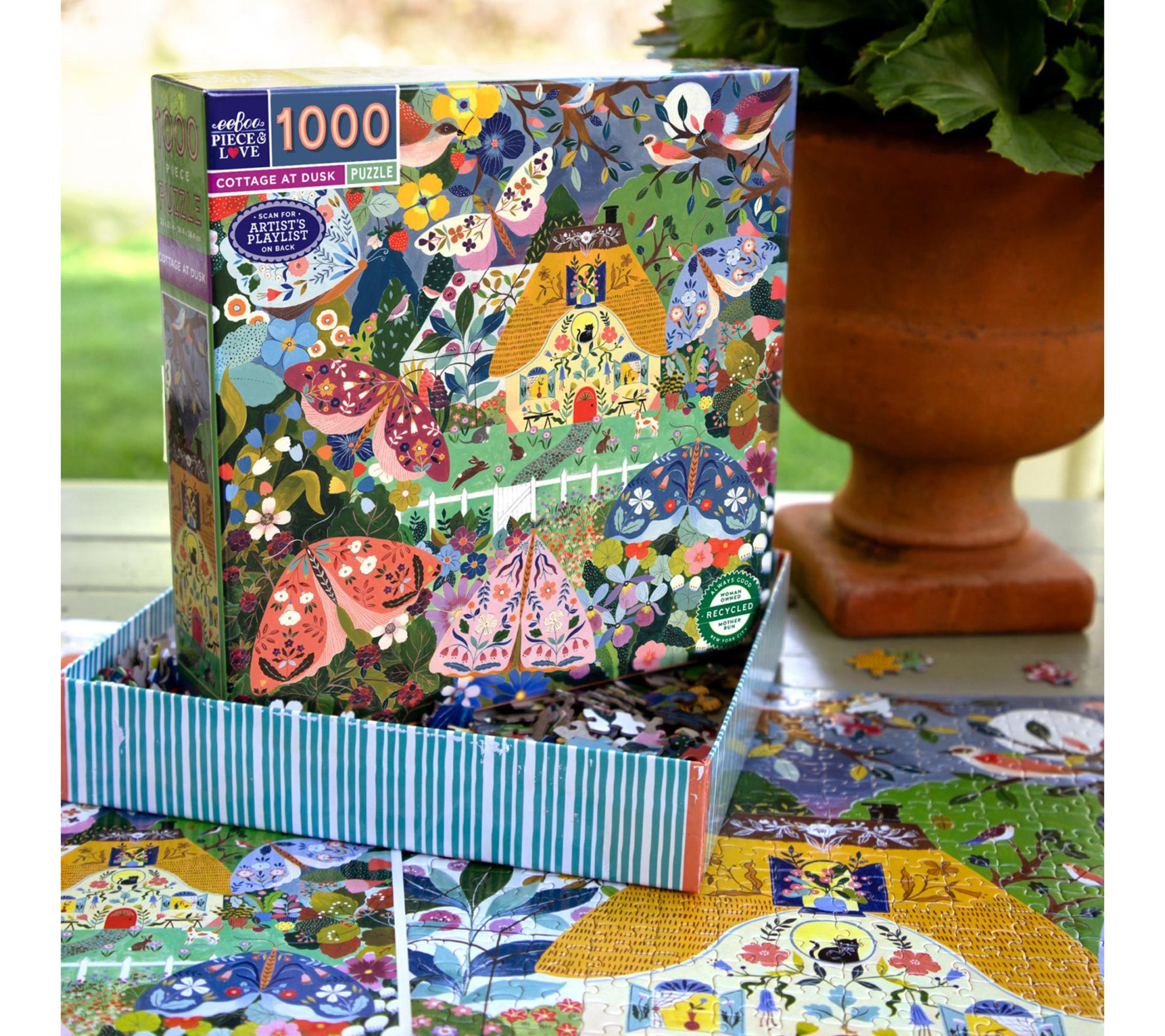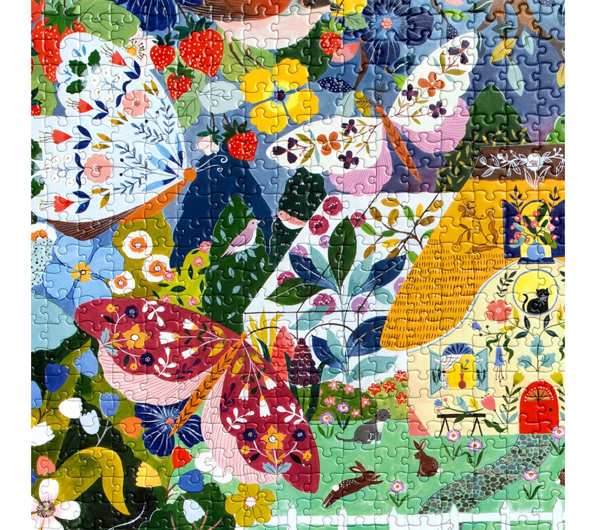 Experience the enchanting beauty of twilight with the eeBoo Piece & Love Cottage at Dusk 1,000-piece square jigsaw puzzle. Artist Flora Waycott brings the night alive with a vibrant display of colorful moths and blooming flowers that create a magical atmosphere. From eeBoo.
