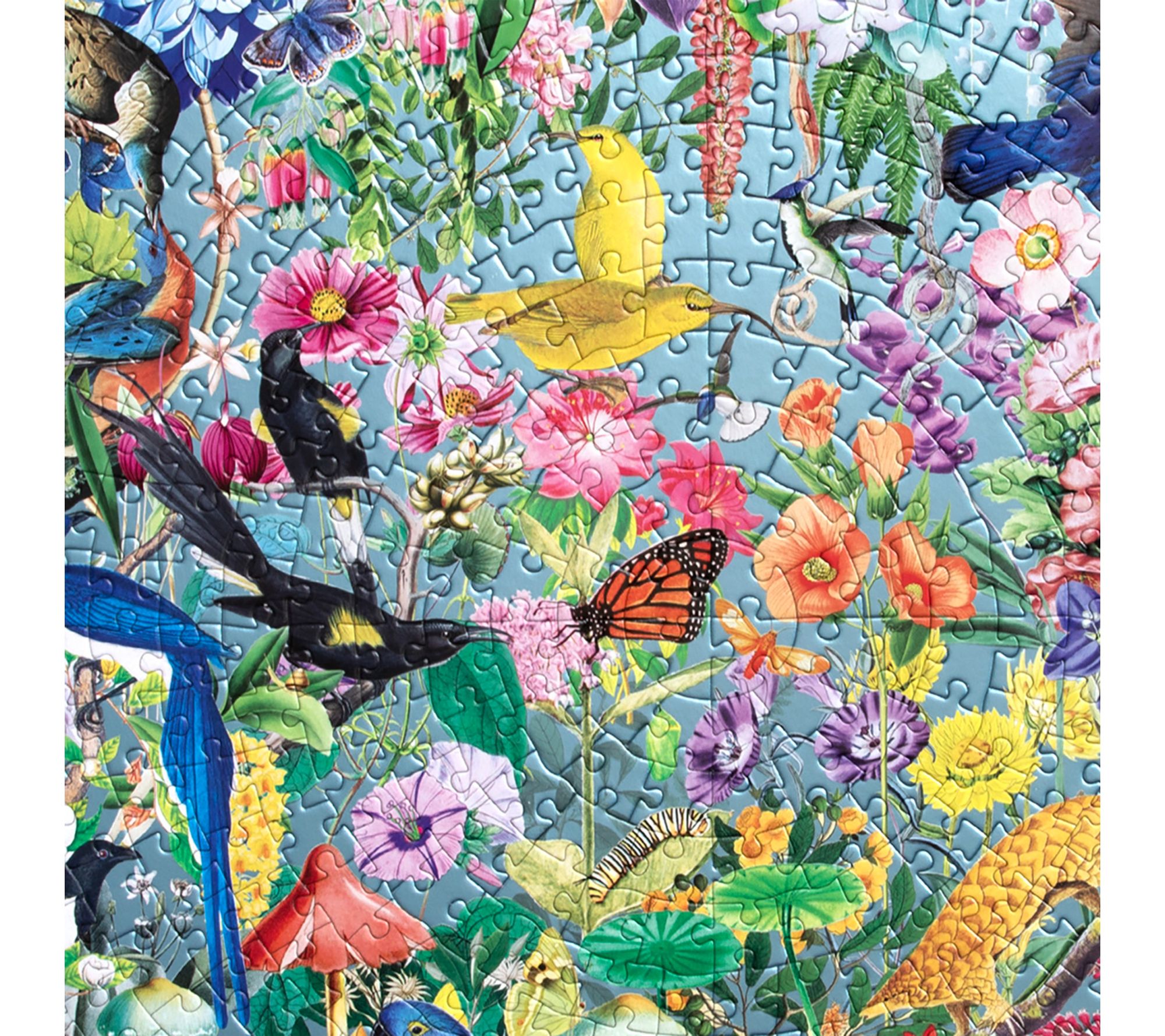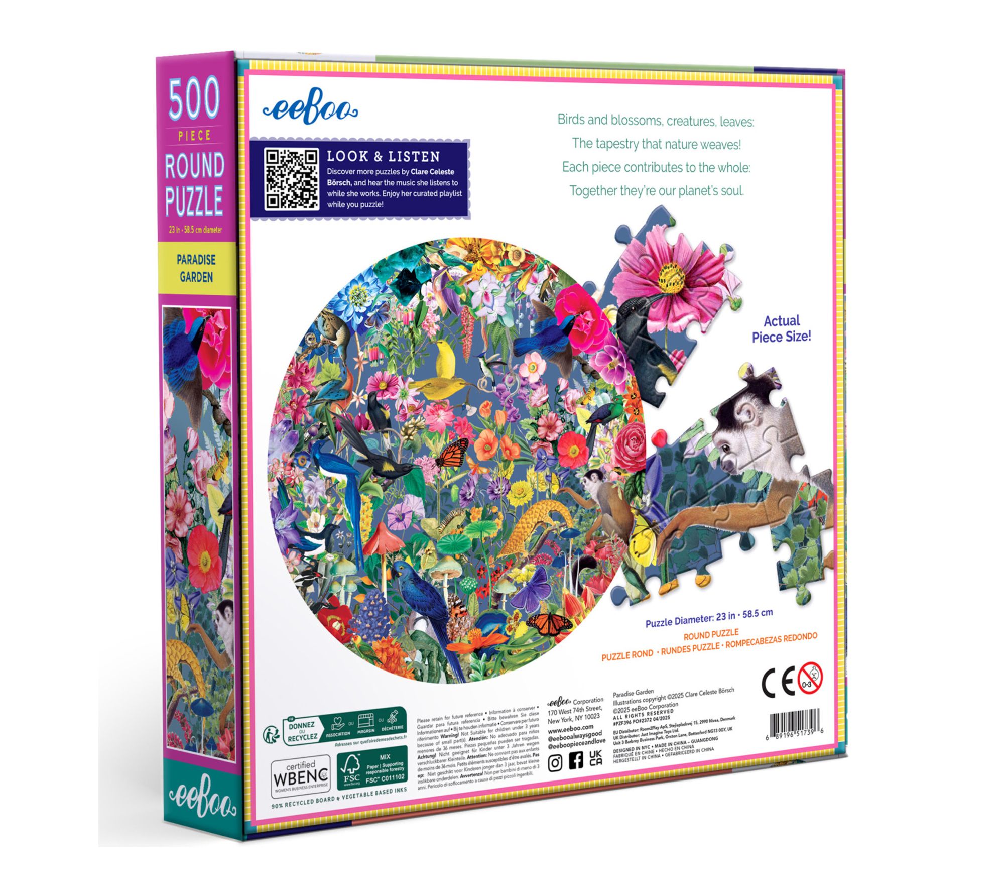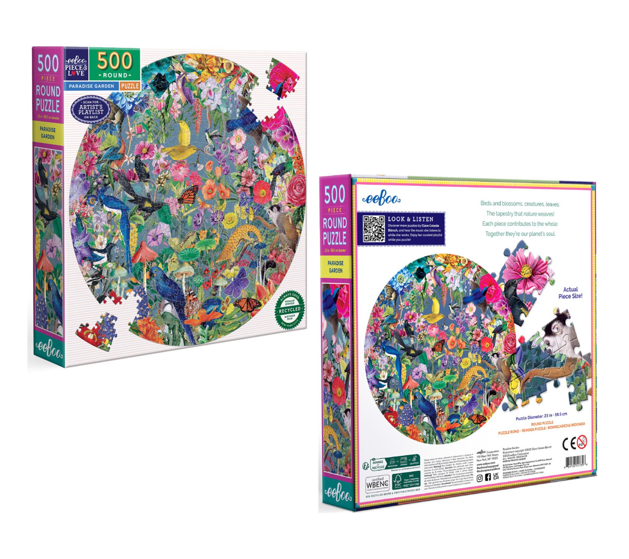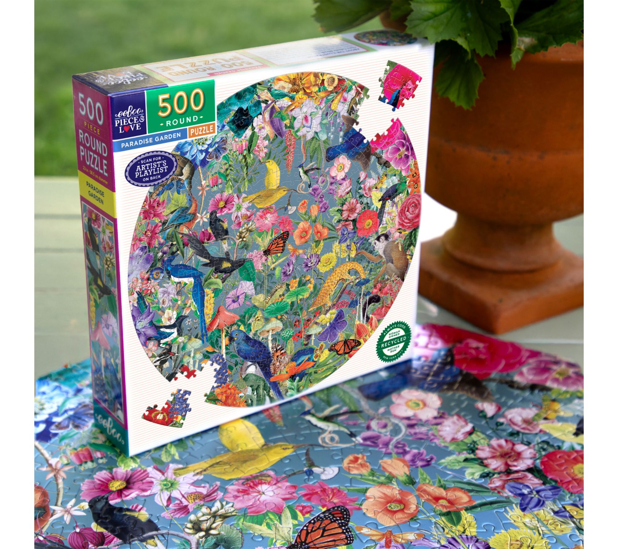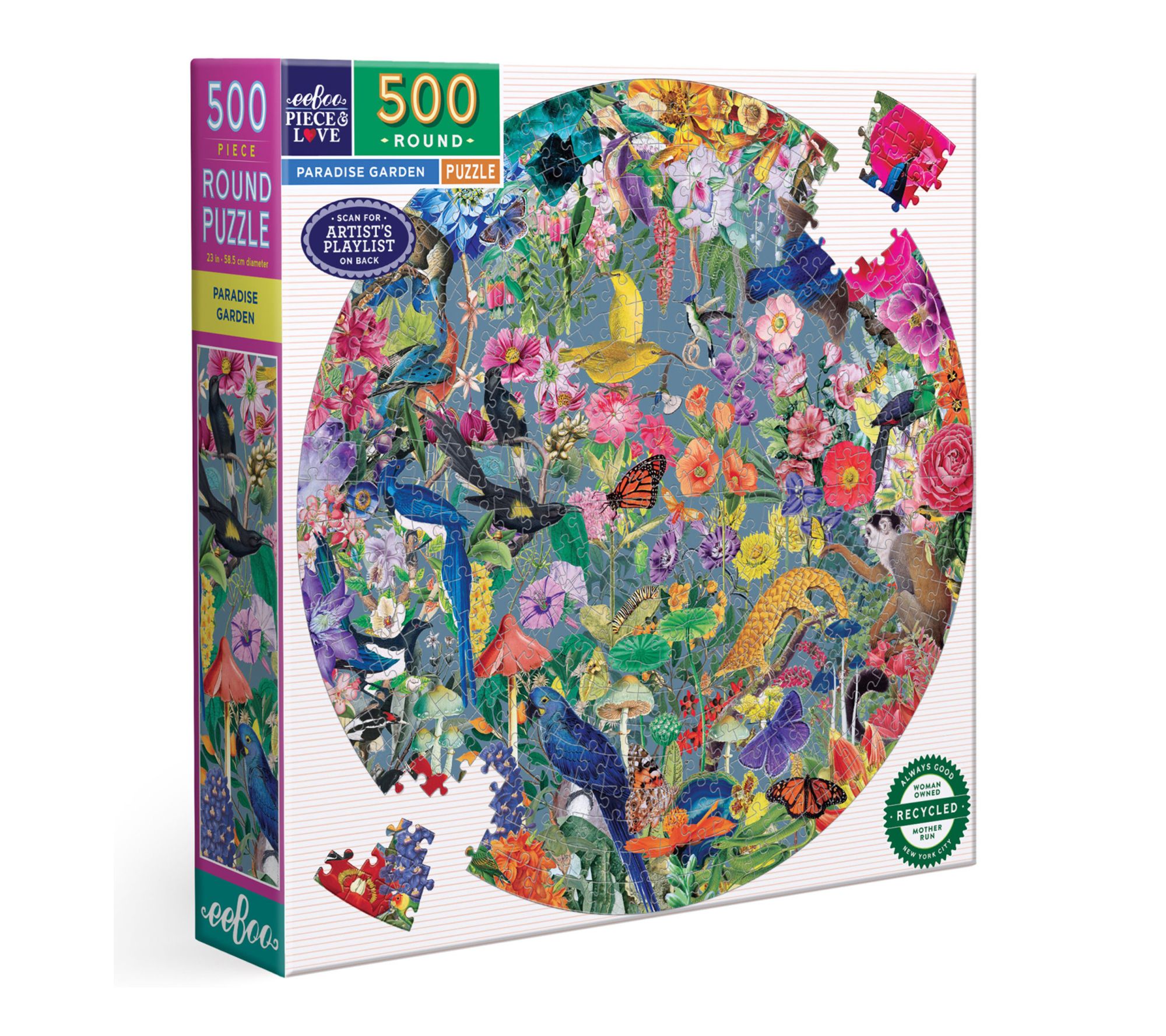 Transport your family or friends to an enchanting botanical retreat as you piece together the Paradise Garden 500-piece round jigsaw puzzle. Lush birds, intricate flowers, and vibrant colors blend beautifully to create a captivating challenge -- plus a curated playlist adds a musical layer to your puzzling experience. From eeBoo.