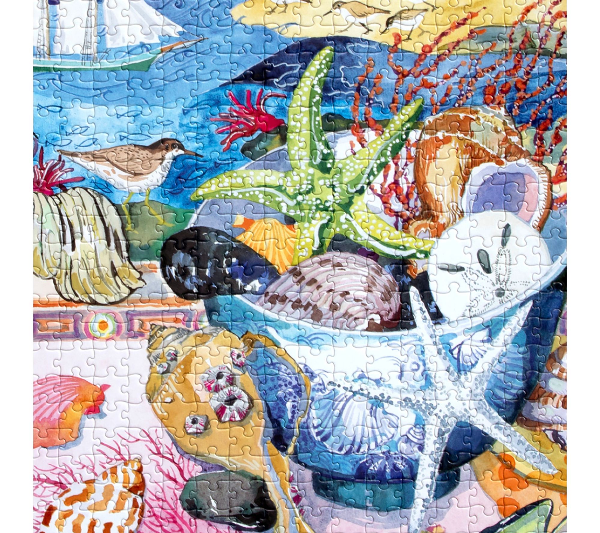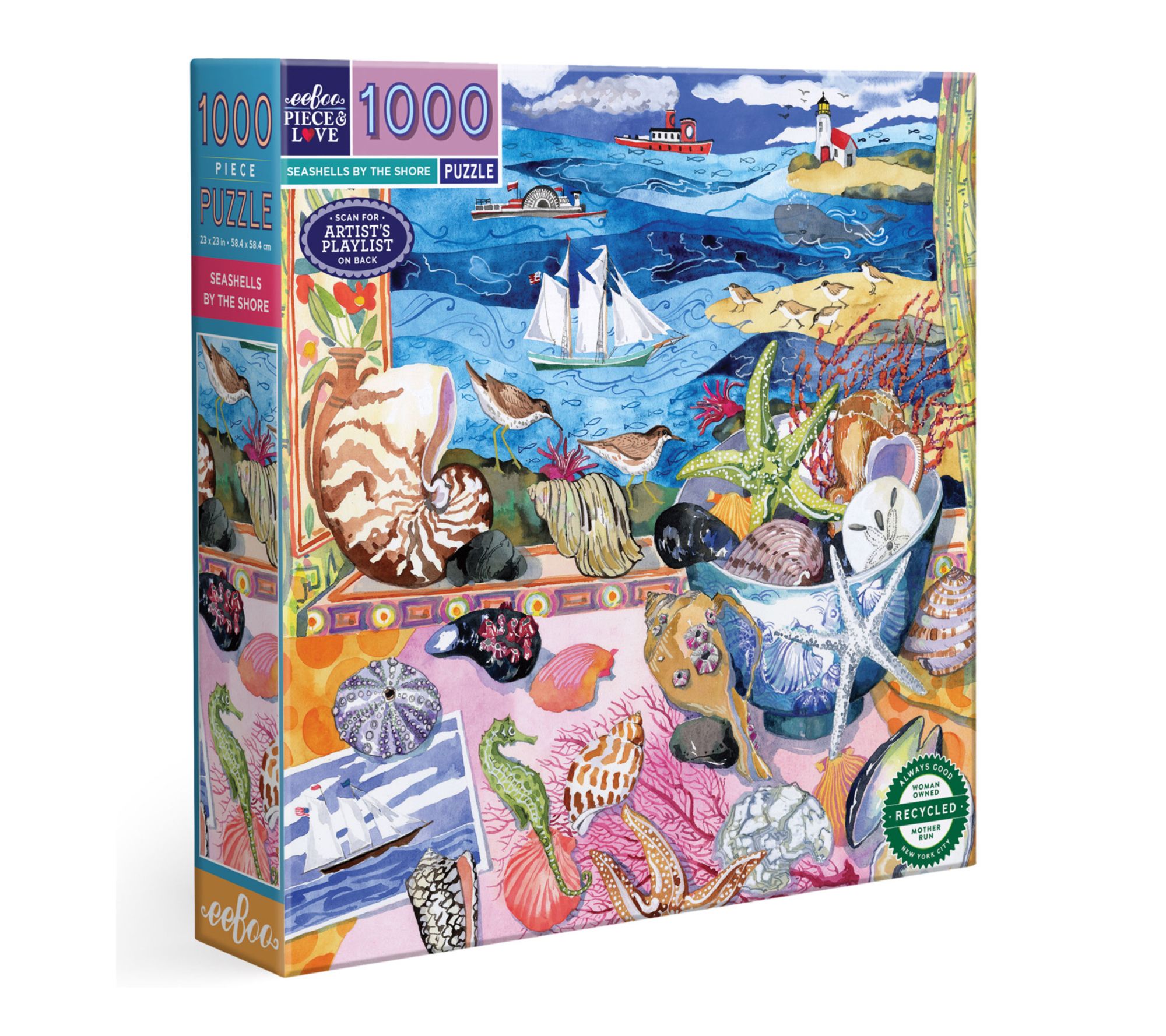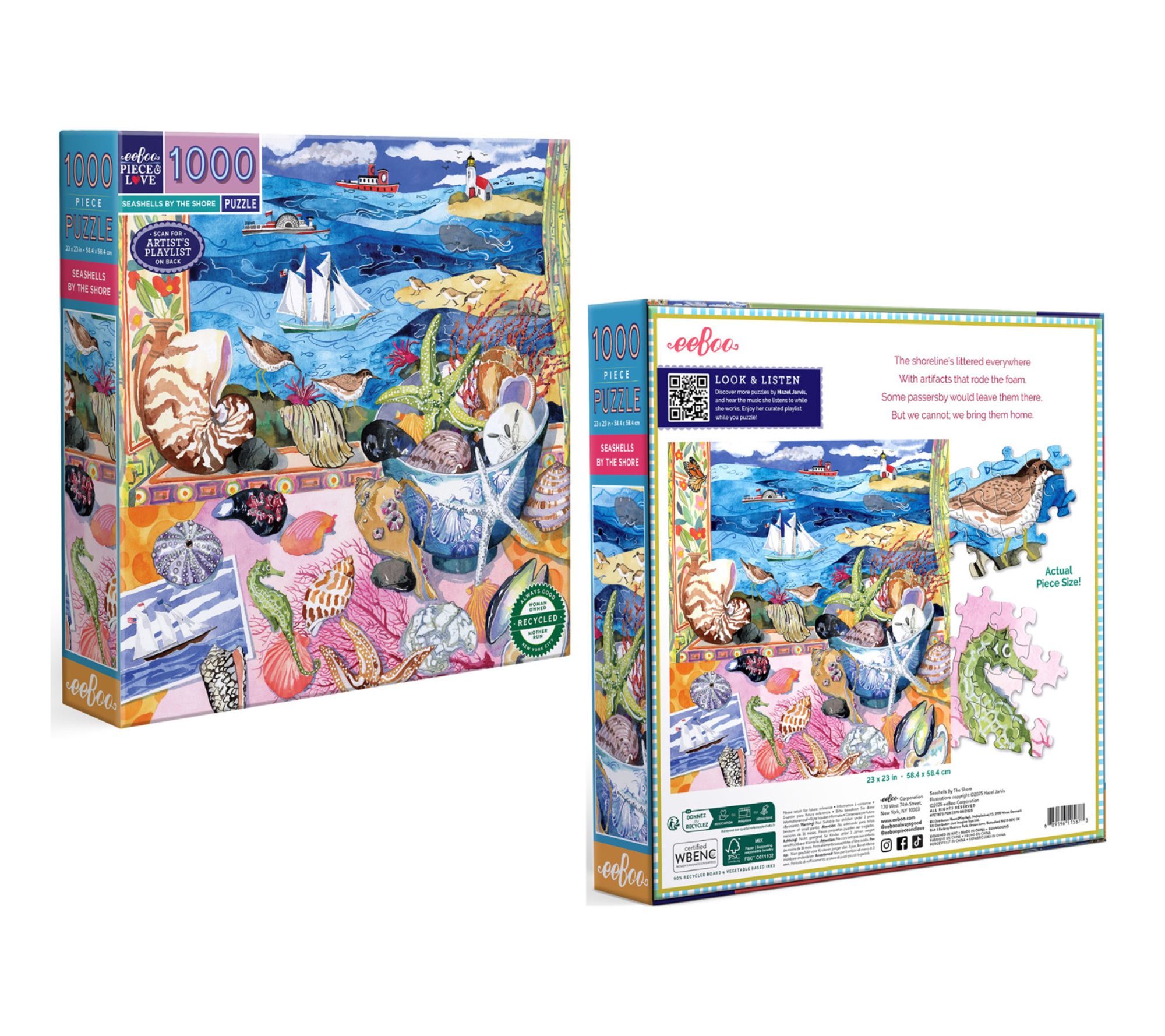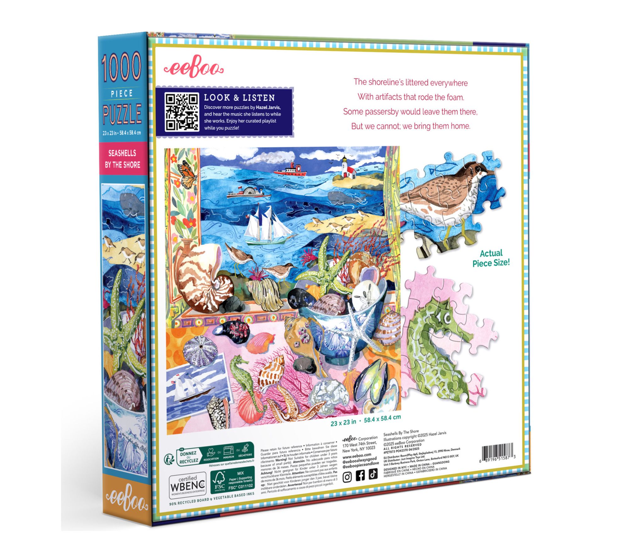 Let your mind wander to peaceful shores with this 1000-piece puzzle featuring Hazel Jarvis's watercolor blend of seashells and gentle waves. Enjoy hours of thoughtful assembly, whether relaxing solo or gathering with family, and immerse yourself in the tranquil scene with a curated artist playlist and full-color reference insert. From eeBoo.