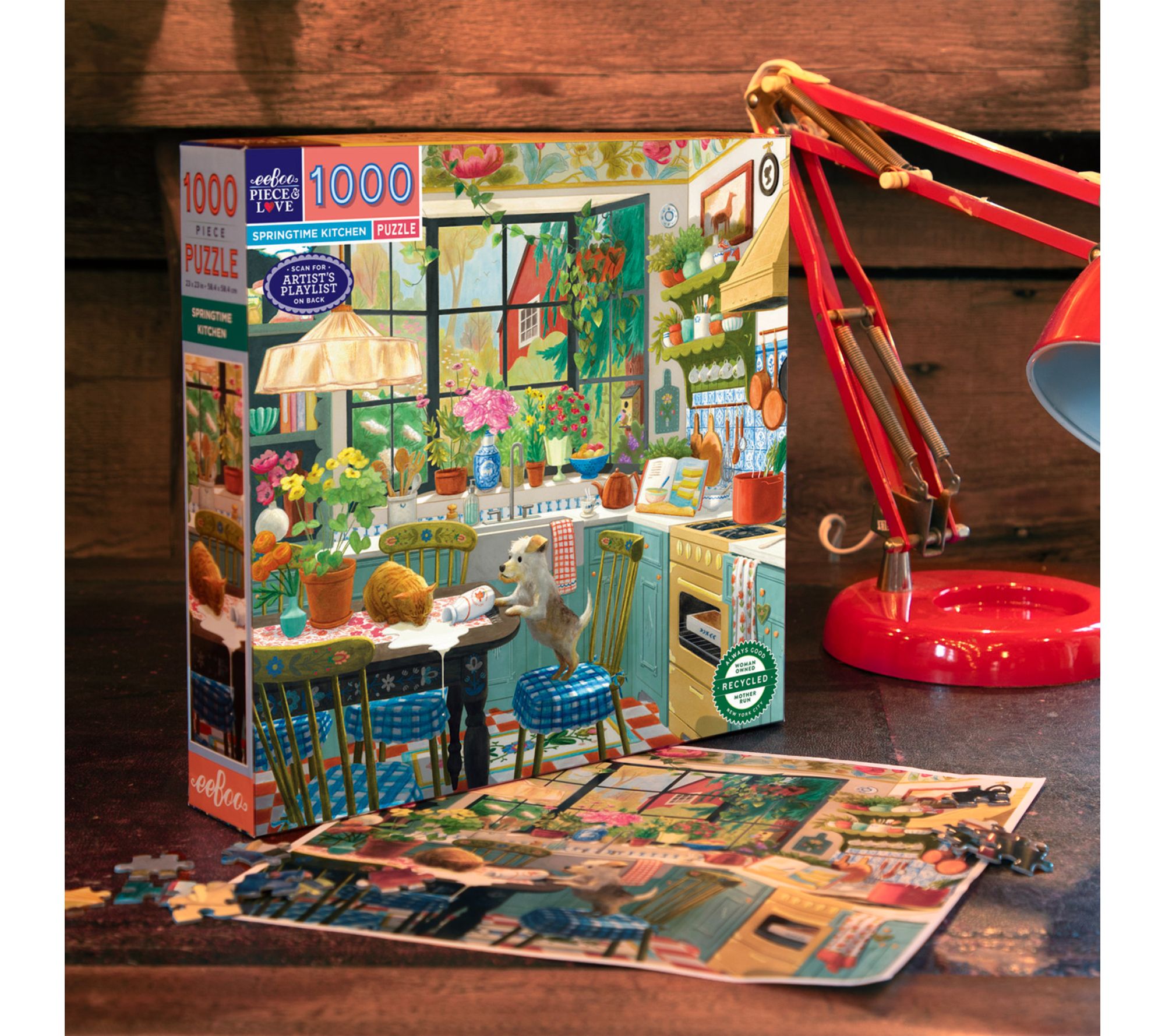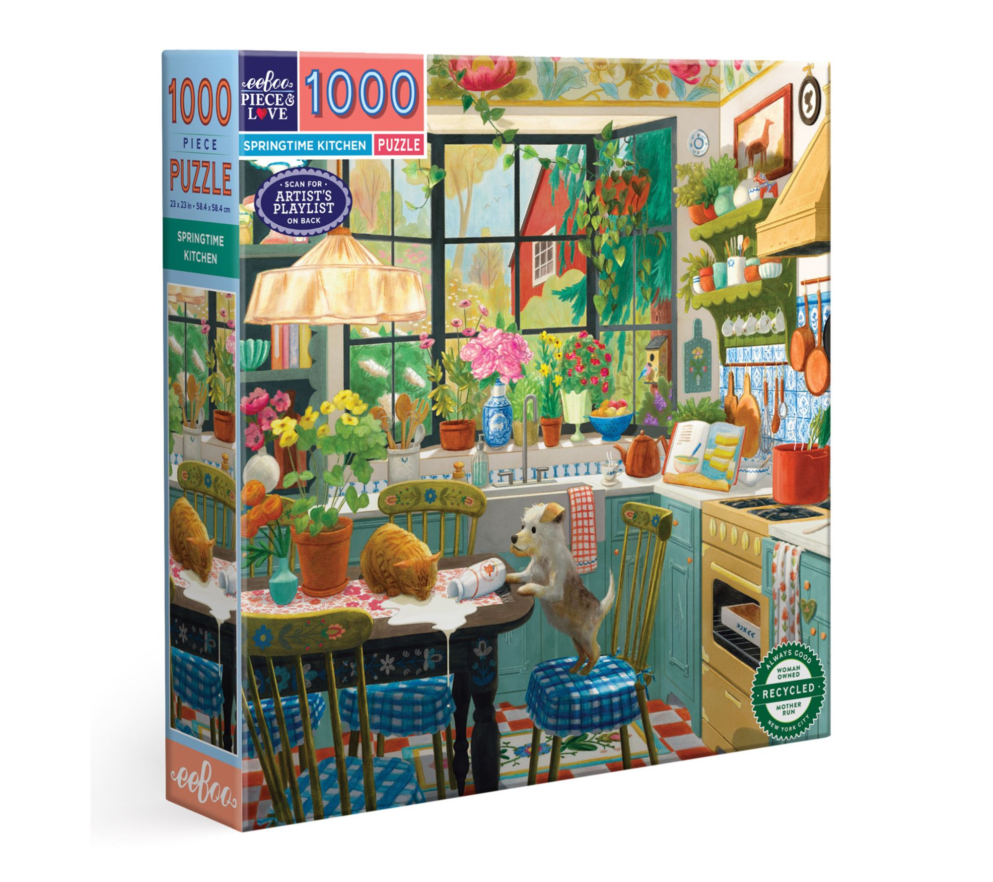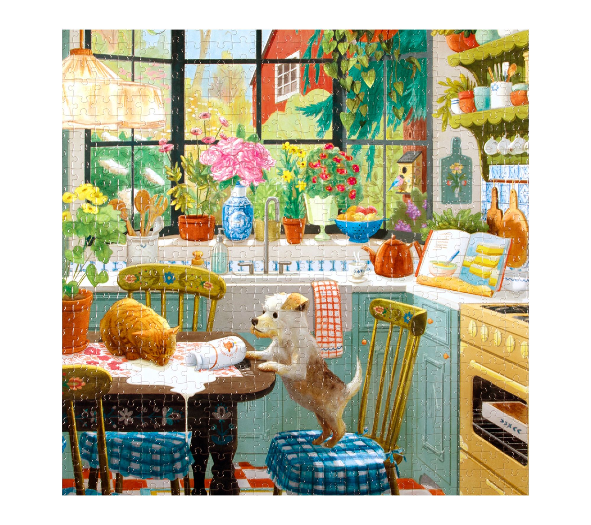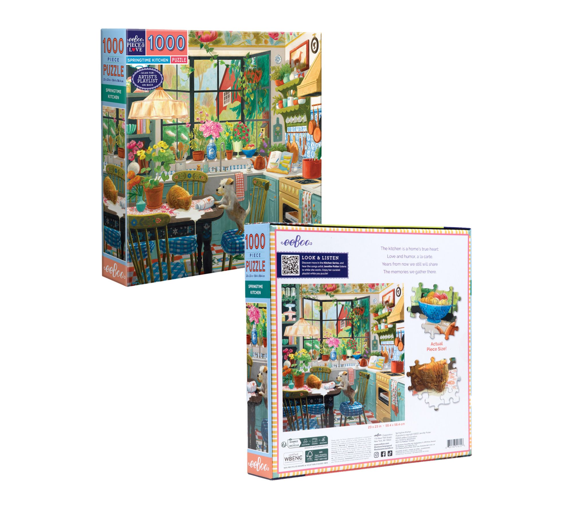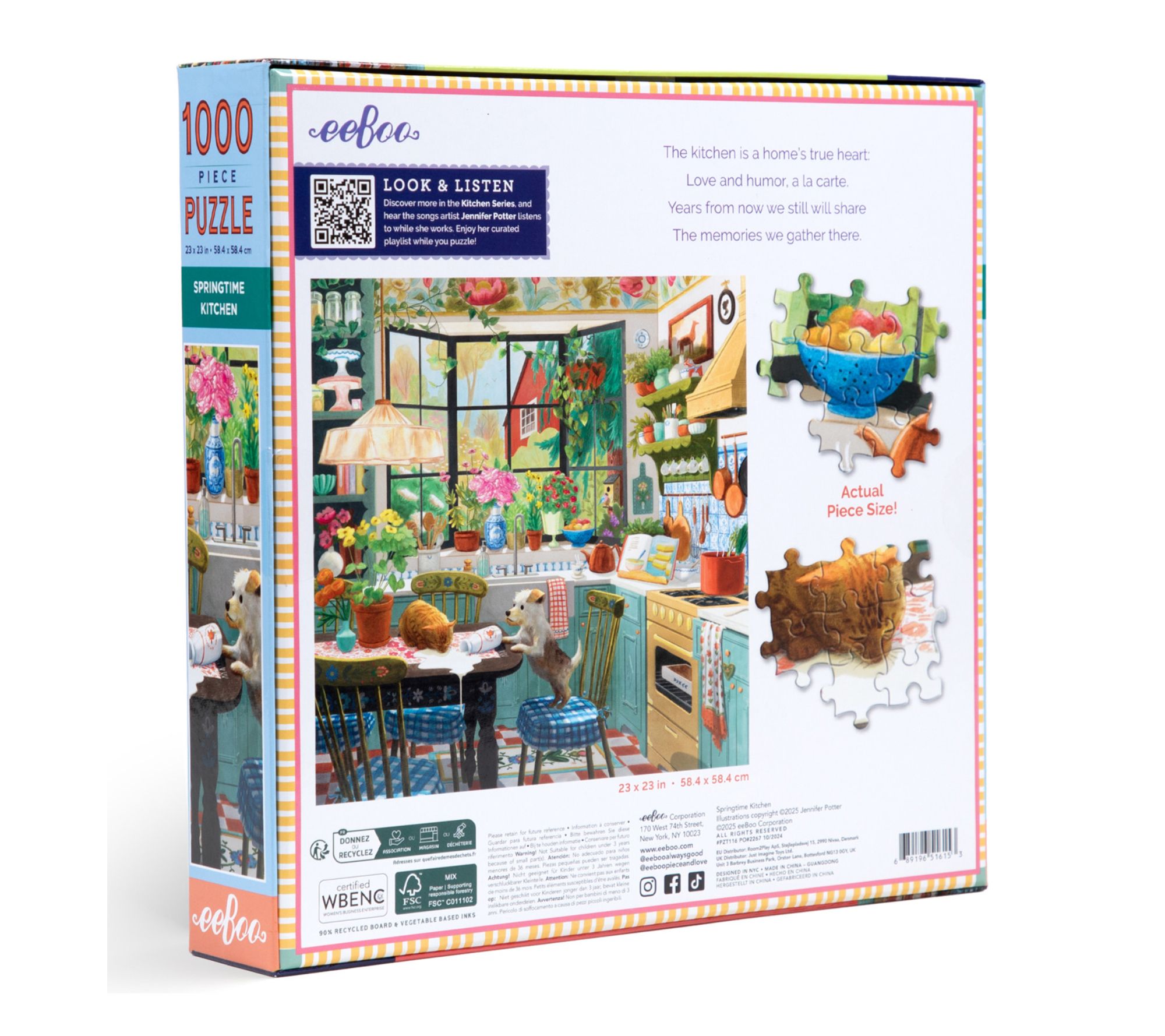 Invite warm moments into your day as you assemble this vibrant 1000-piece puzzle designed by artist Jennifer Potter. Experience the charm of a cozy kitchen scene, enhanced with glossy, high-quality pieces and a curated playlist for a relaxing activity solo or with family. From eeBoo.
