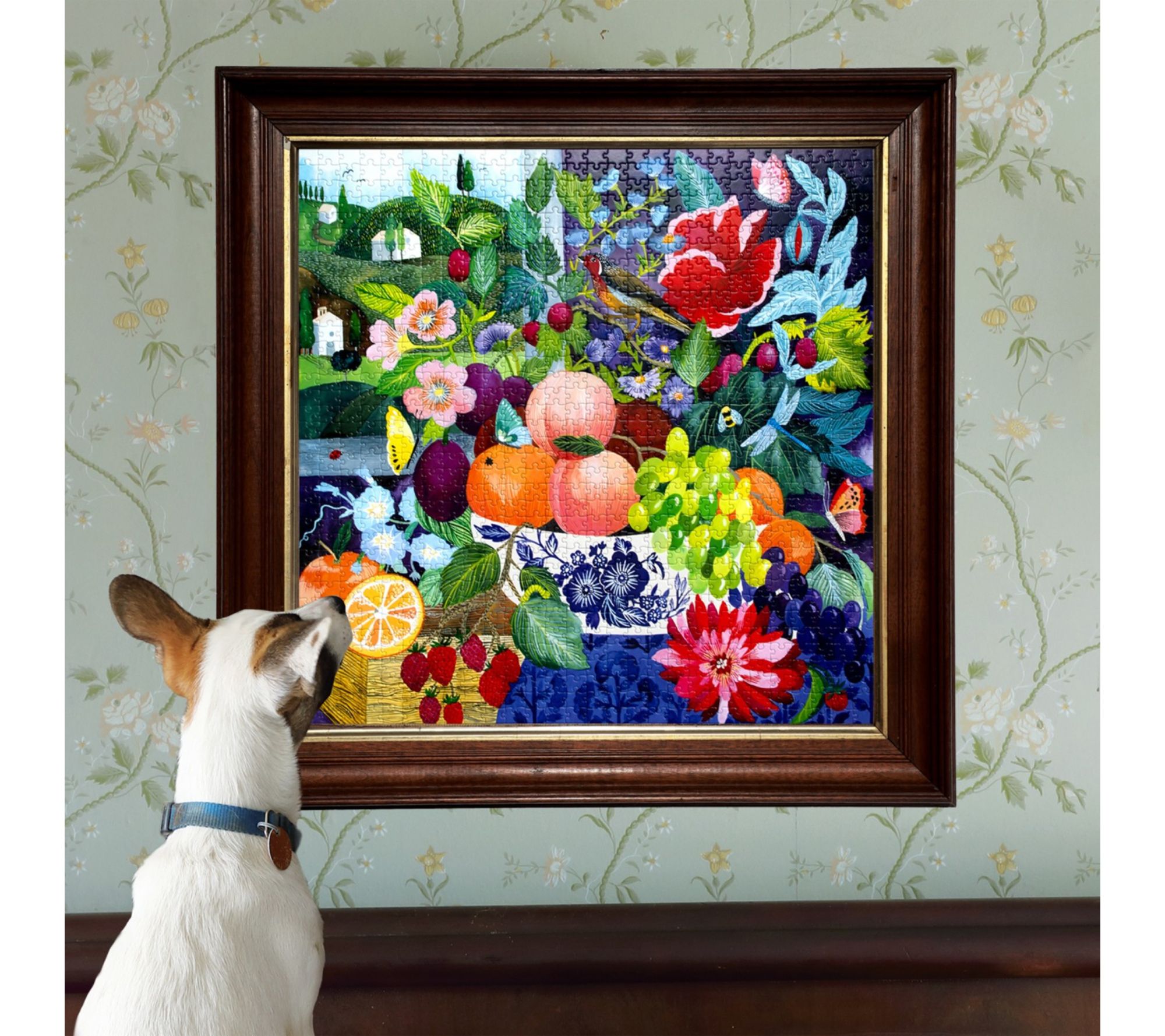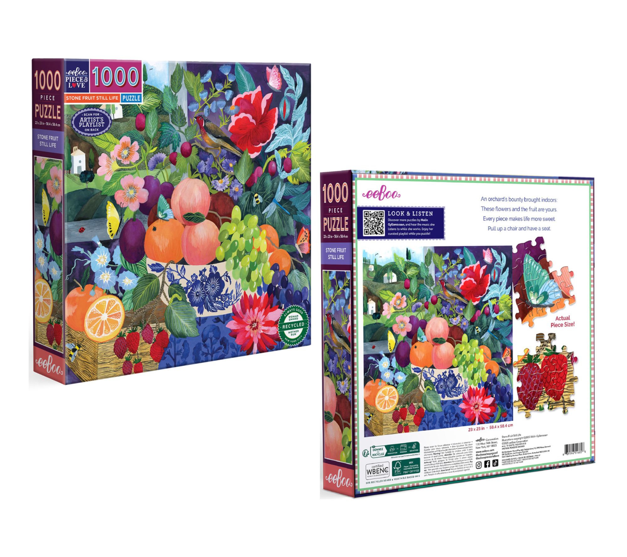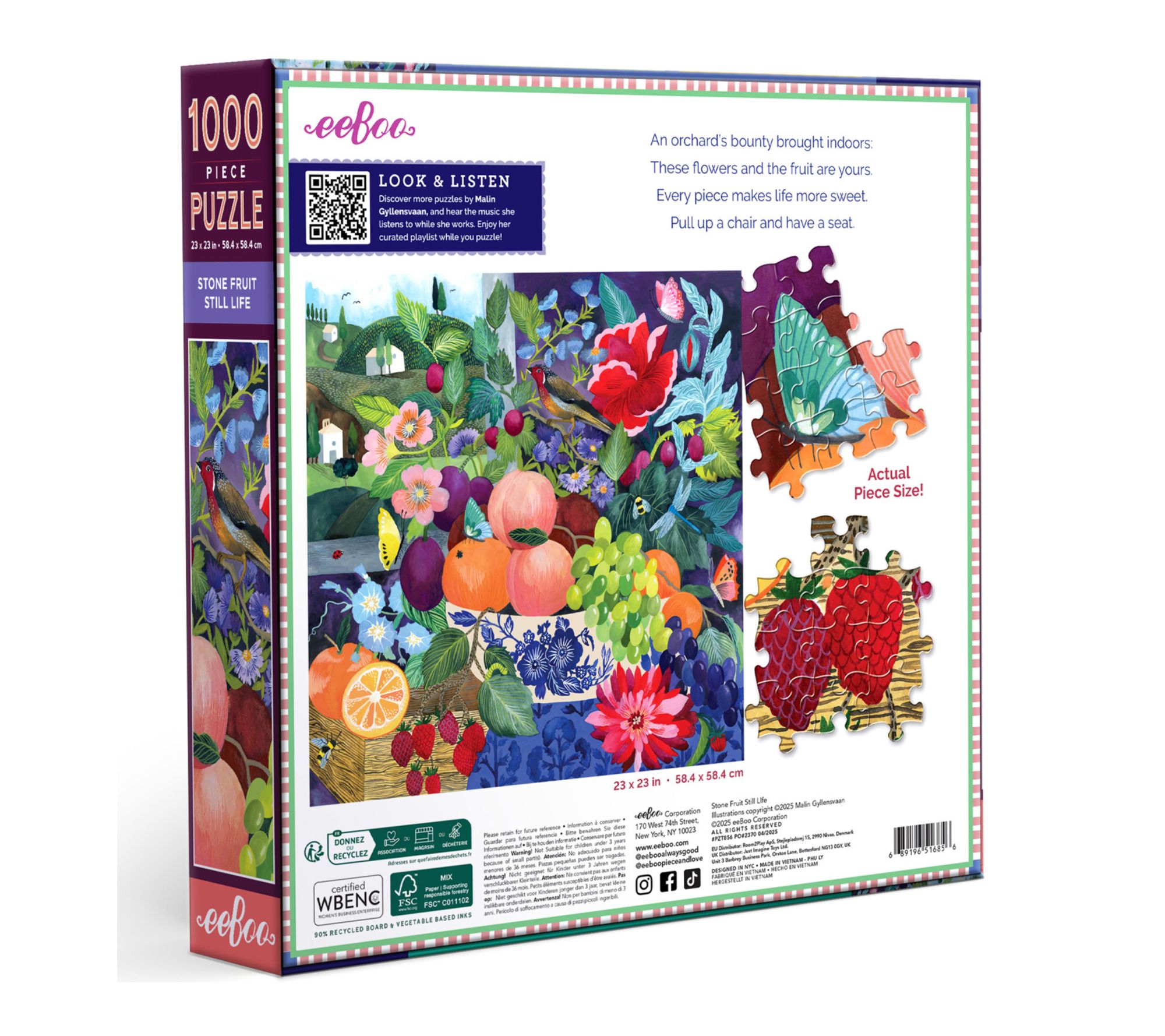 Lose yourself in a vibrant celebration of orchard abundance with this 1,000-piece jigsaw puzzle, featuring a beautifully styled still life of ripe peaches, plums, and luscious stone fruits illustrated by Malin Gyllensvaan. Enjoy cozy moments piecing together glossy, interlocking pieces and immerse yourself further with a full-color reference insert. From eeBoo.