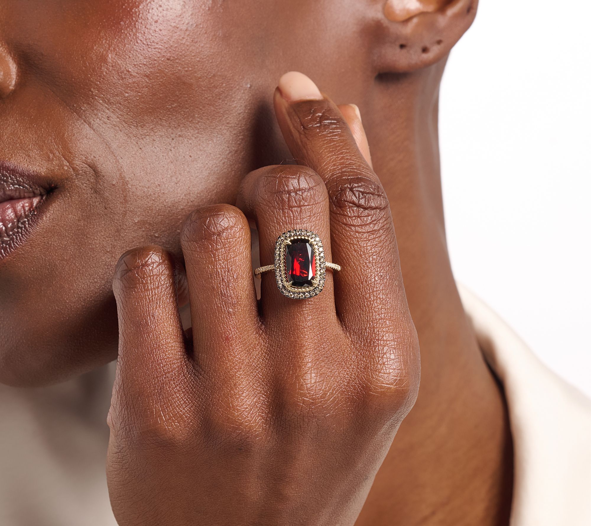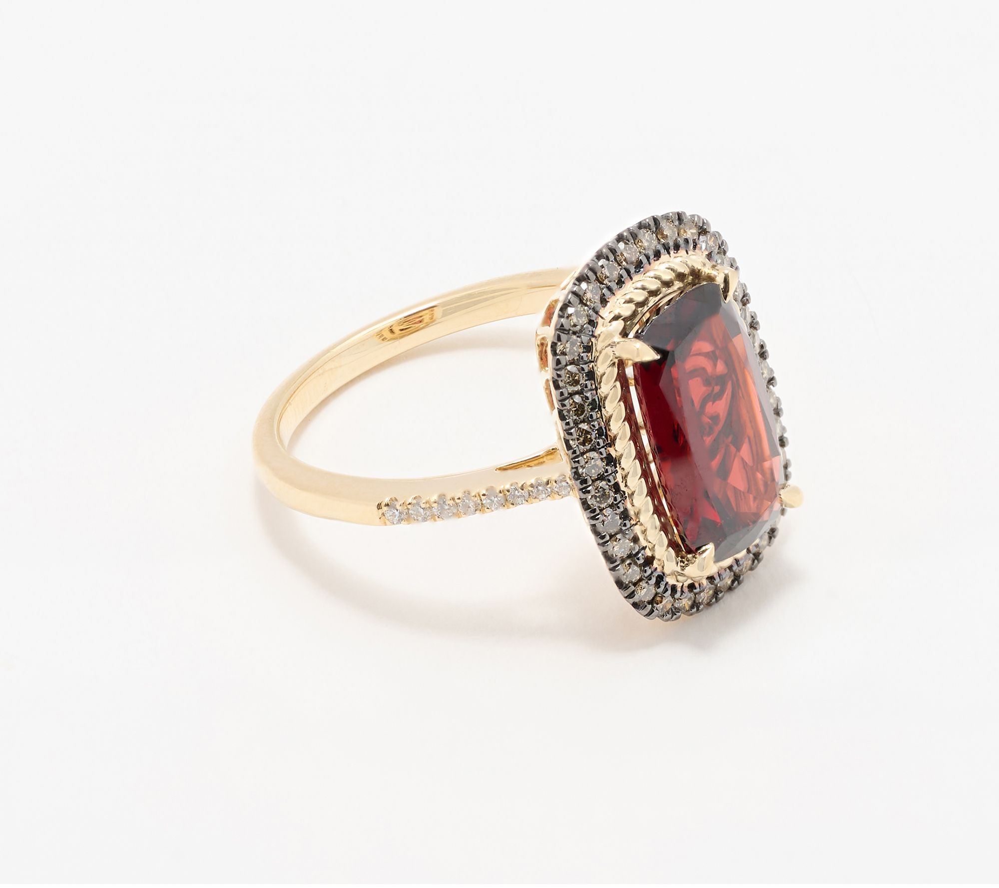 • Garnet accented by brown and white diamonds; polished finish
