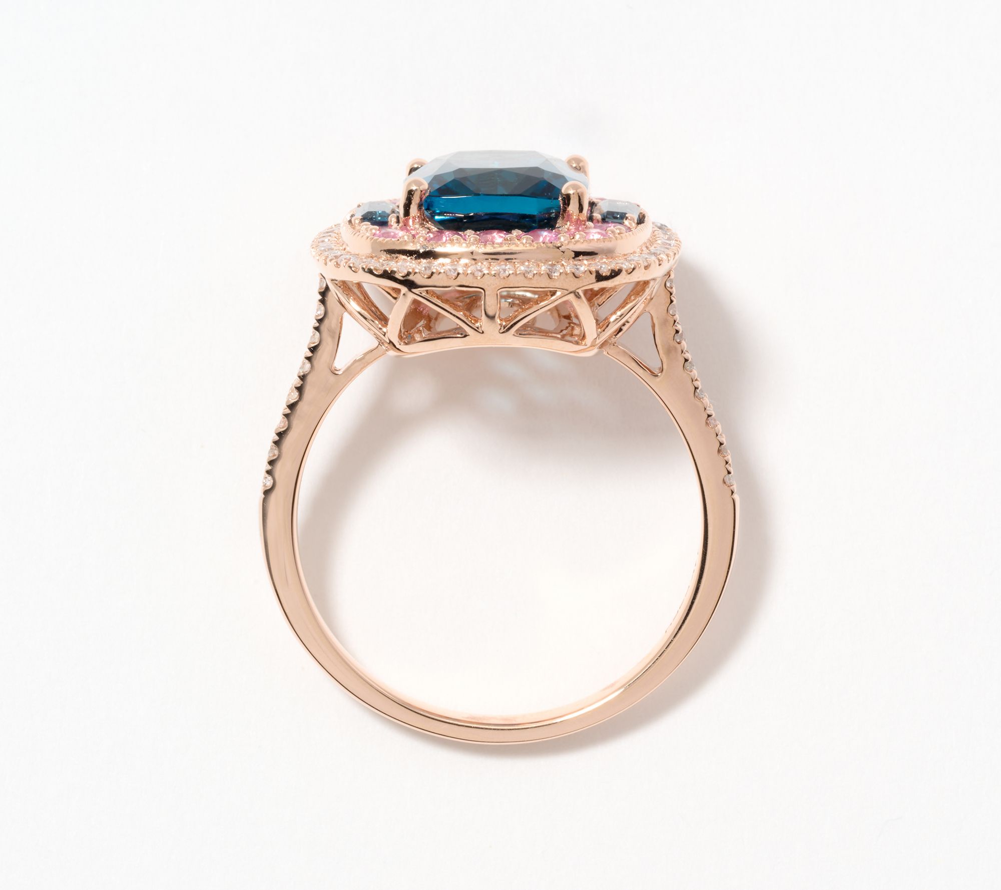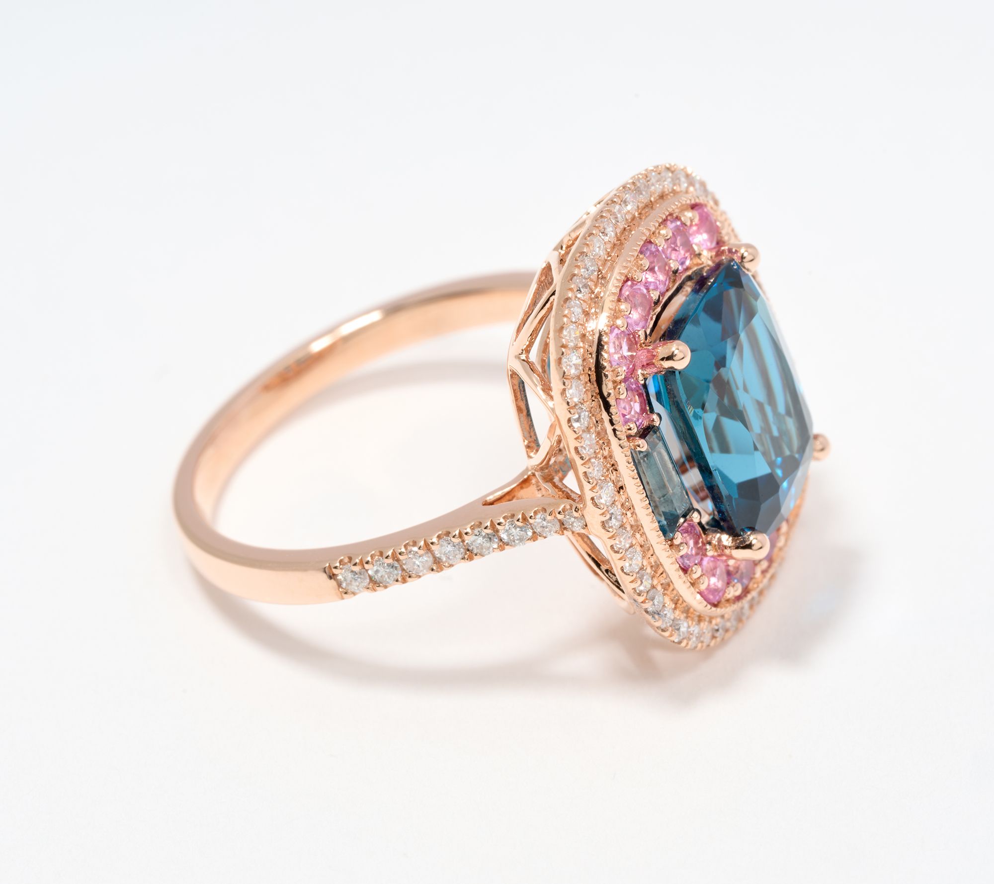 Cushion-cut London blue topaz center stone; pink sapphire and London blue topaz side gemstones; diamond halo; polished finish