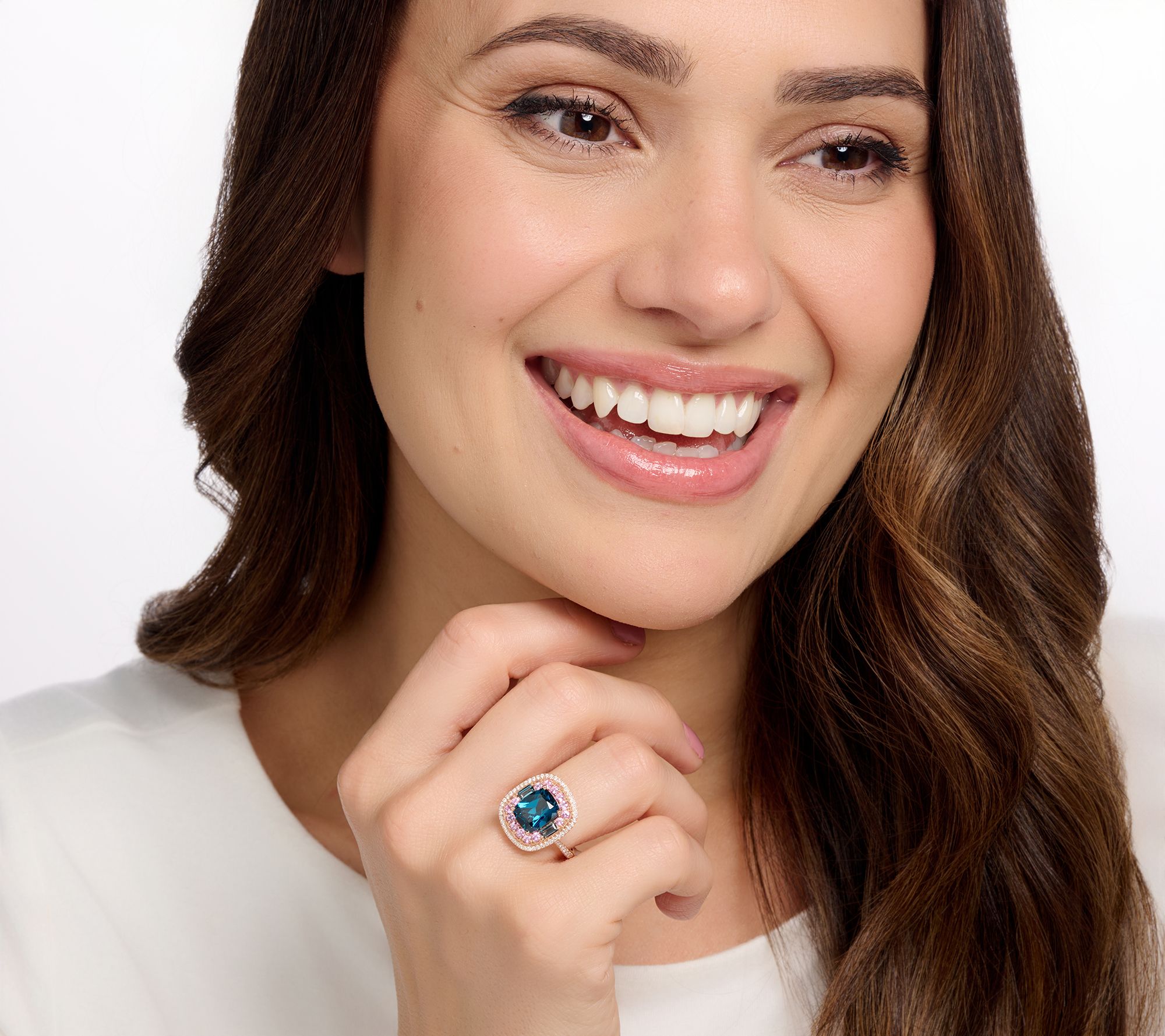 Total gemstone weights are approximate: London Blue Topaz center stone 3.10 carats; Pink Sapphire/London Blue Topaz side stones 0.70 carat