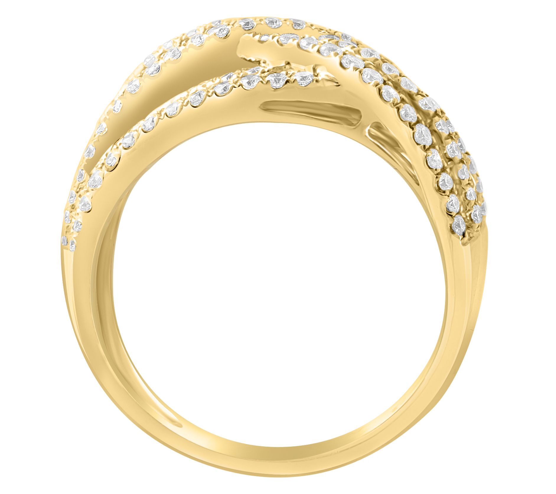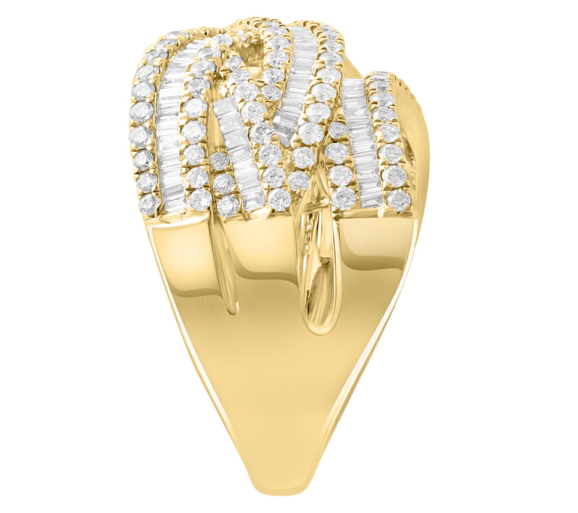 Slip this dazzling ring on for those moments when extra sparkle is a must -- lunch with friends, a day at the office, or a night on the town. Rows of baguette and round diamonds sweep elegantly across a polished 14K gold bypass band, creating a look that's glam yet wearable every day. Style it solo or layer with slim stackers for maximum impact. From Effy.