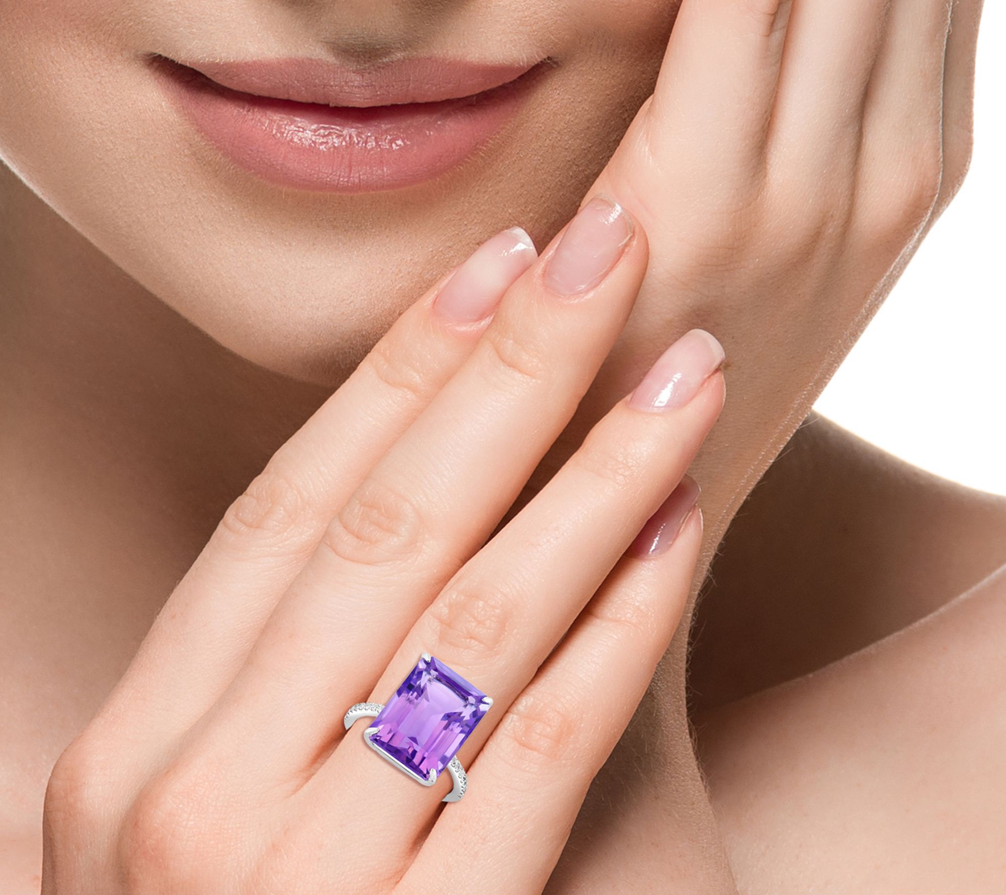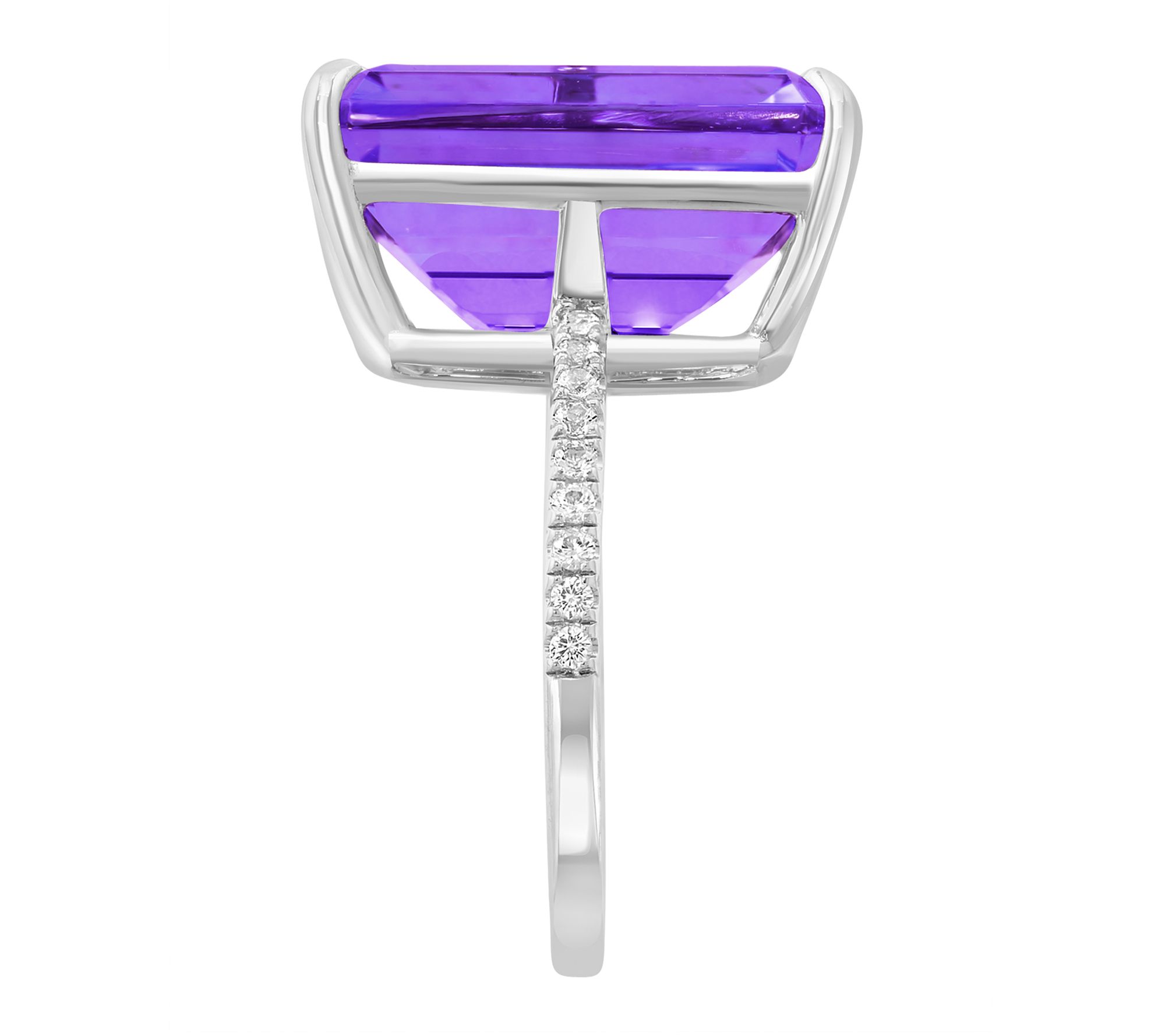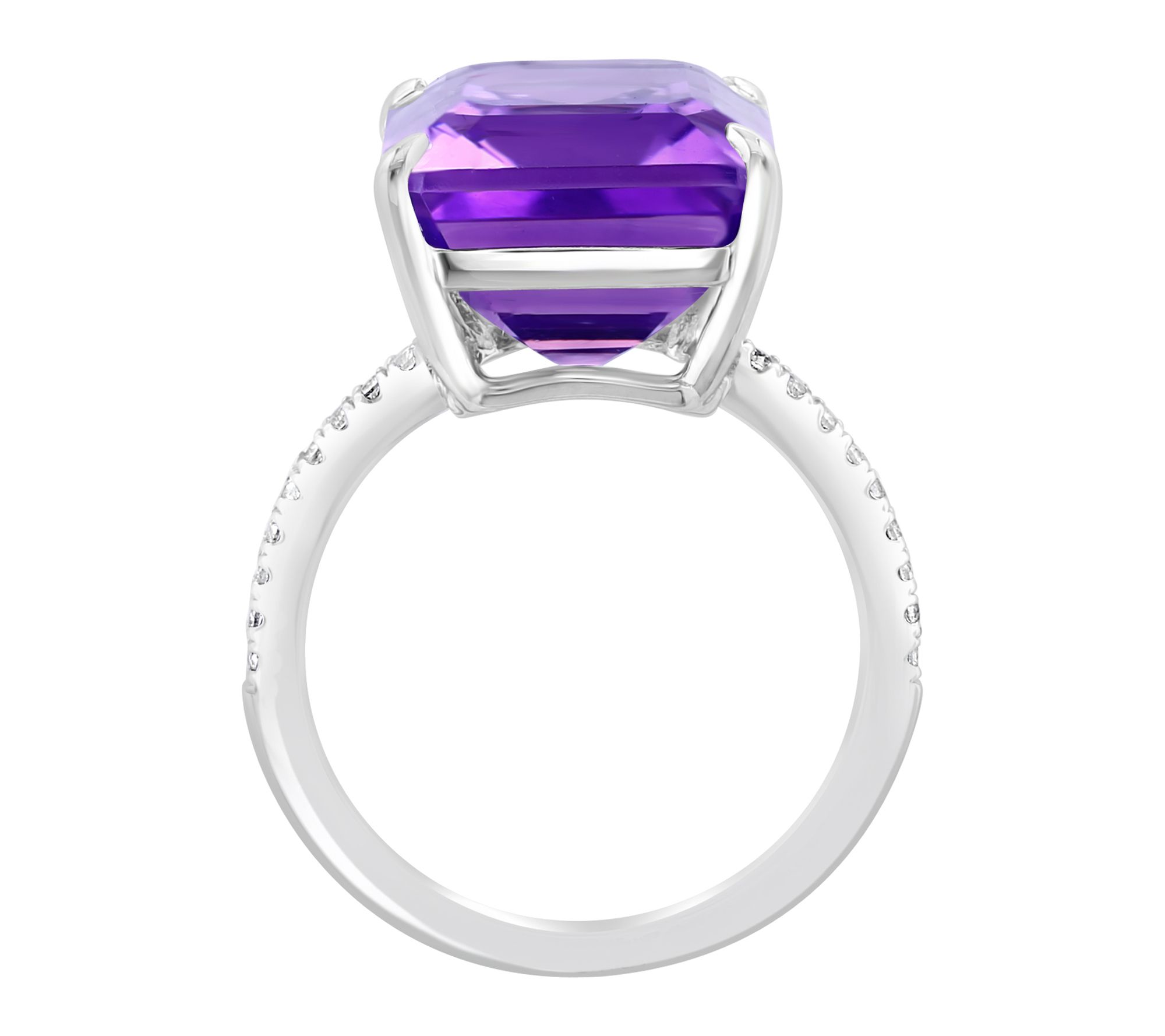 • Emerald-cut amethyst in center; round white sapphires along shank; prong set; polished finish