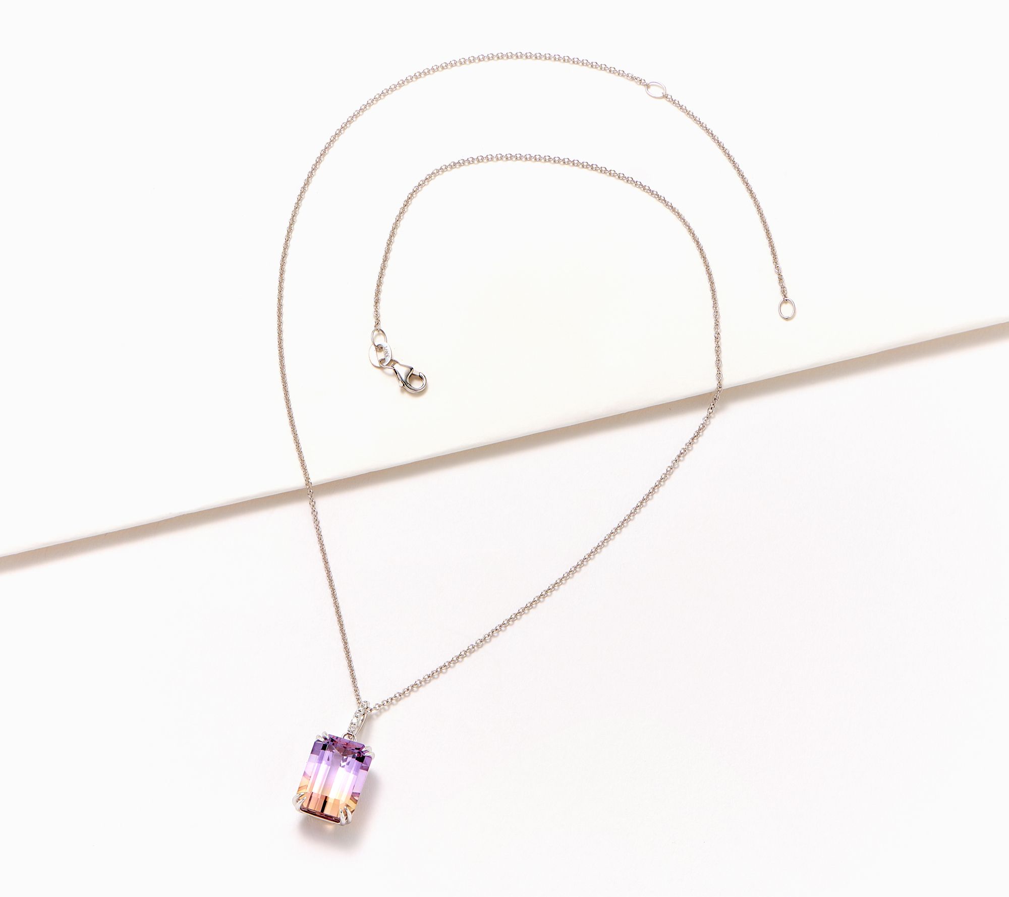 • Emerald-cut ametrine; round full-cut diamonds, polished