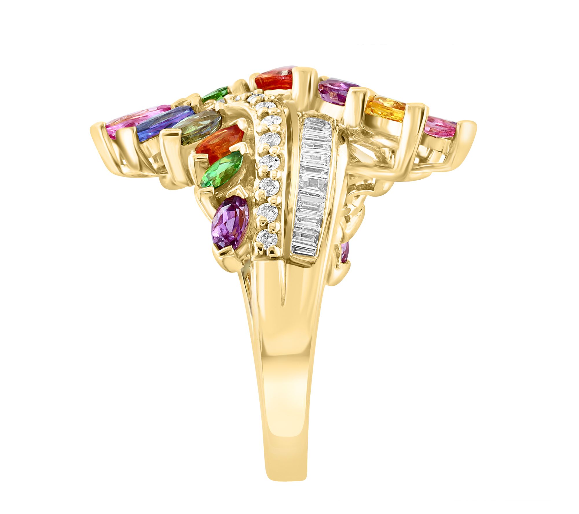 • Marquee-cut natural ceylon sapphire, green sapphire, orange sapphire, pink sapphire, purple sapphire, tsavorite, yellow sapphire; baguette and round white diamonds; polished finish