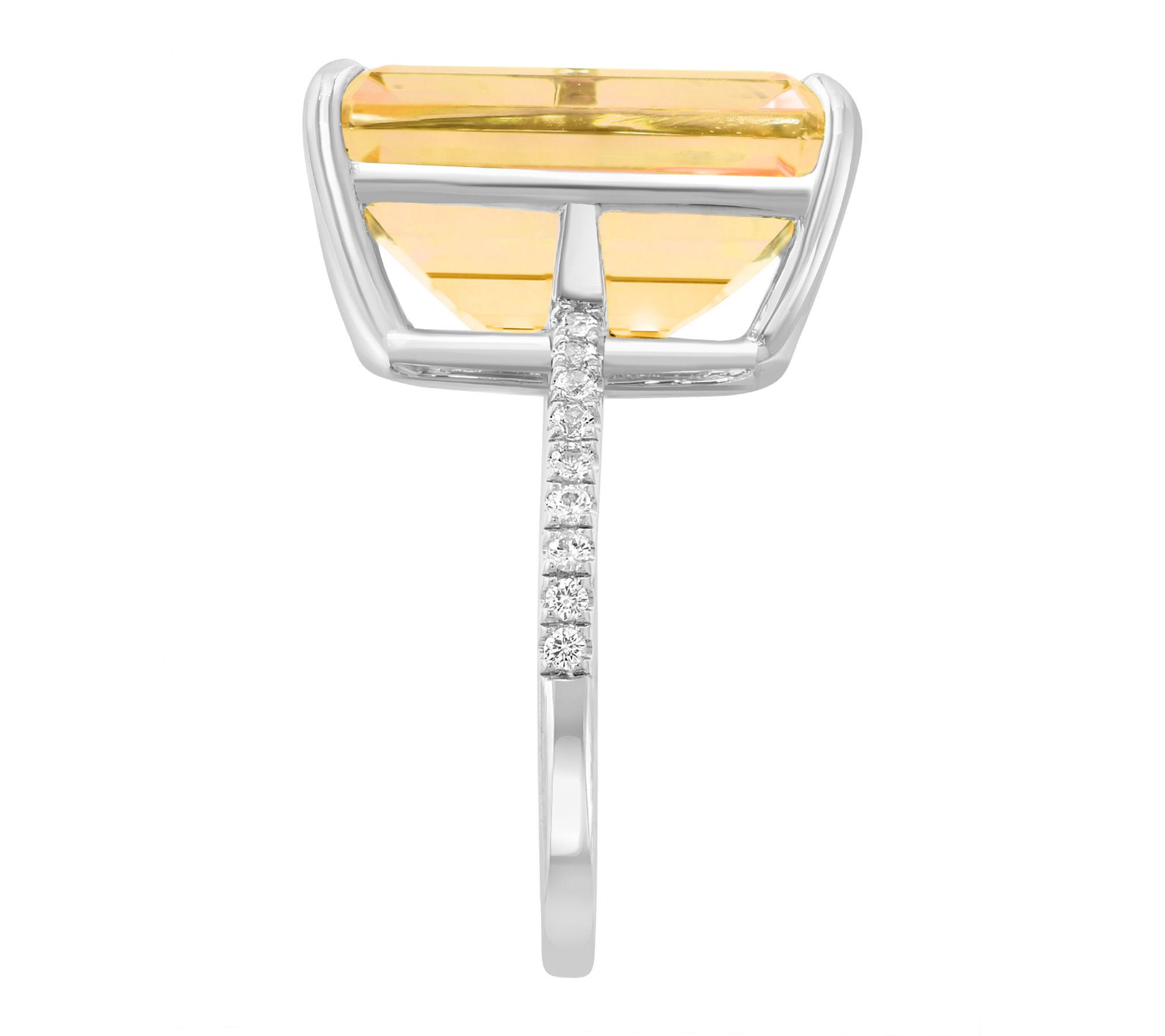• Emerald-cut citrine in prong setting at center; round white sapphire accents; polished finish