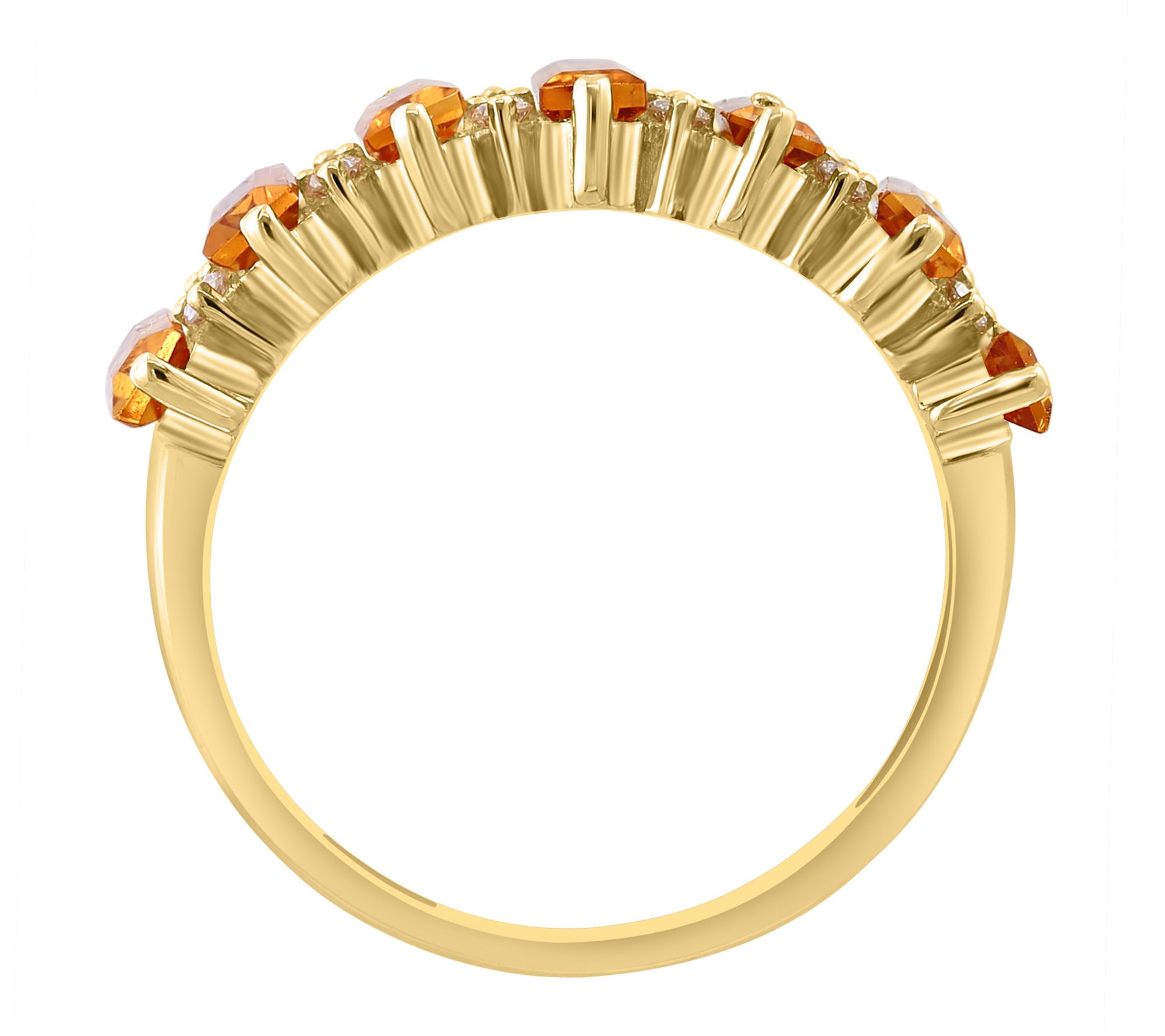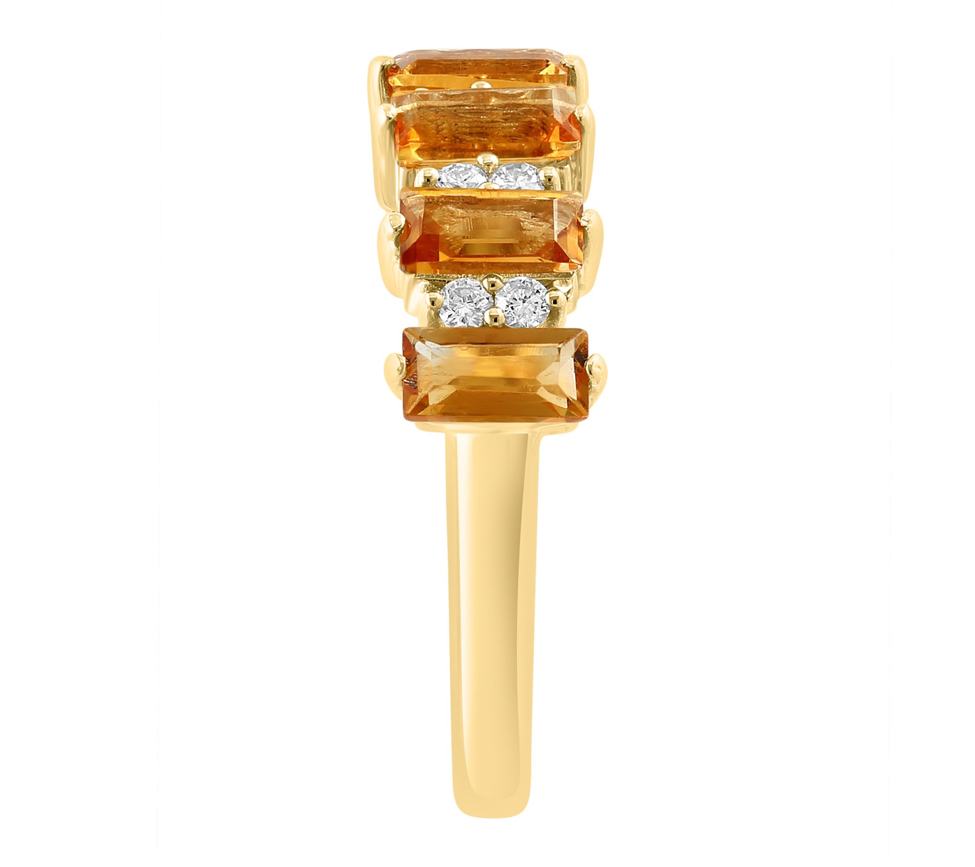 Emerald-cut citrine in prong setting; round diamonds; band style; polished finish