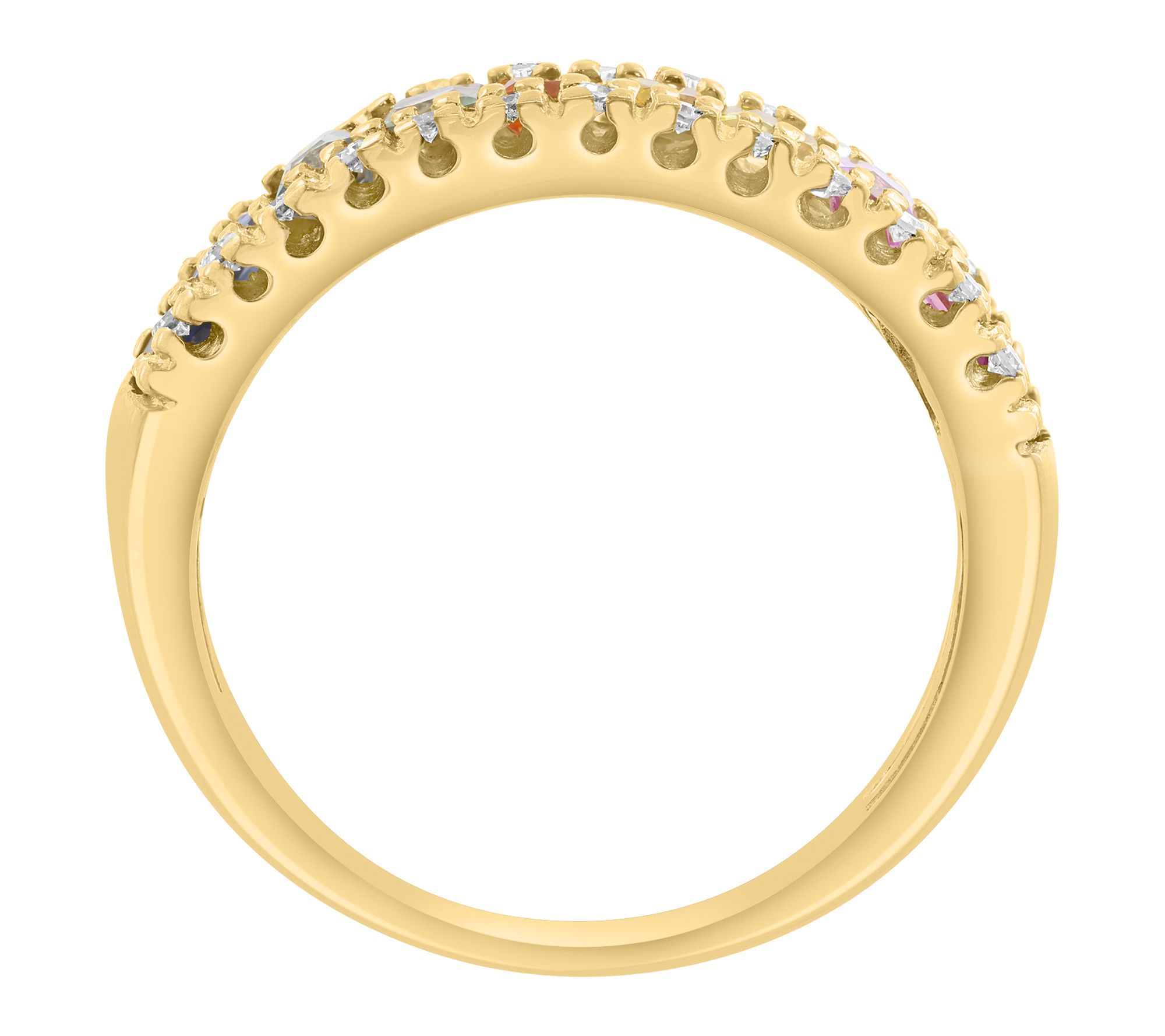 Slip on a vibrant band ring that brings together a celebration of color -- blue, green, pink, yellow sapphires, and sparkling diamond accents all come alive in an elegant cocktail design. This sophisticated ring is a conversation starter whether you're dressing up for a special event or adding a little glamour to your everyday style. From Effy.