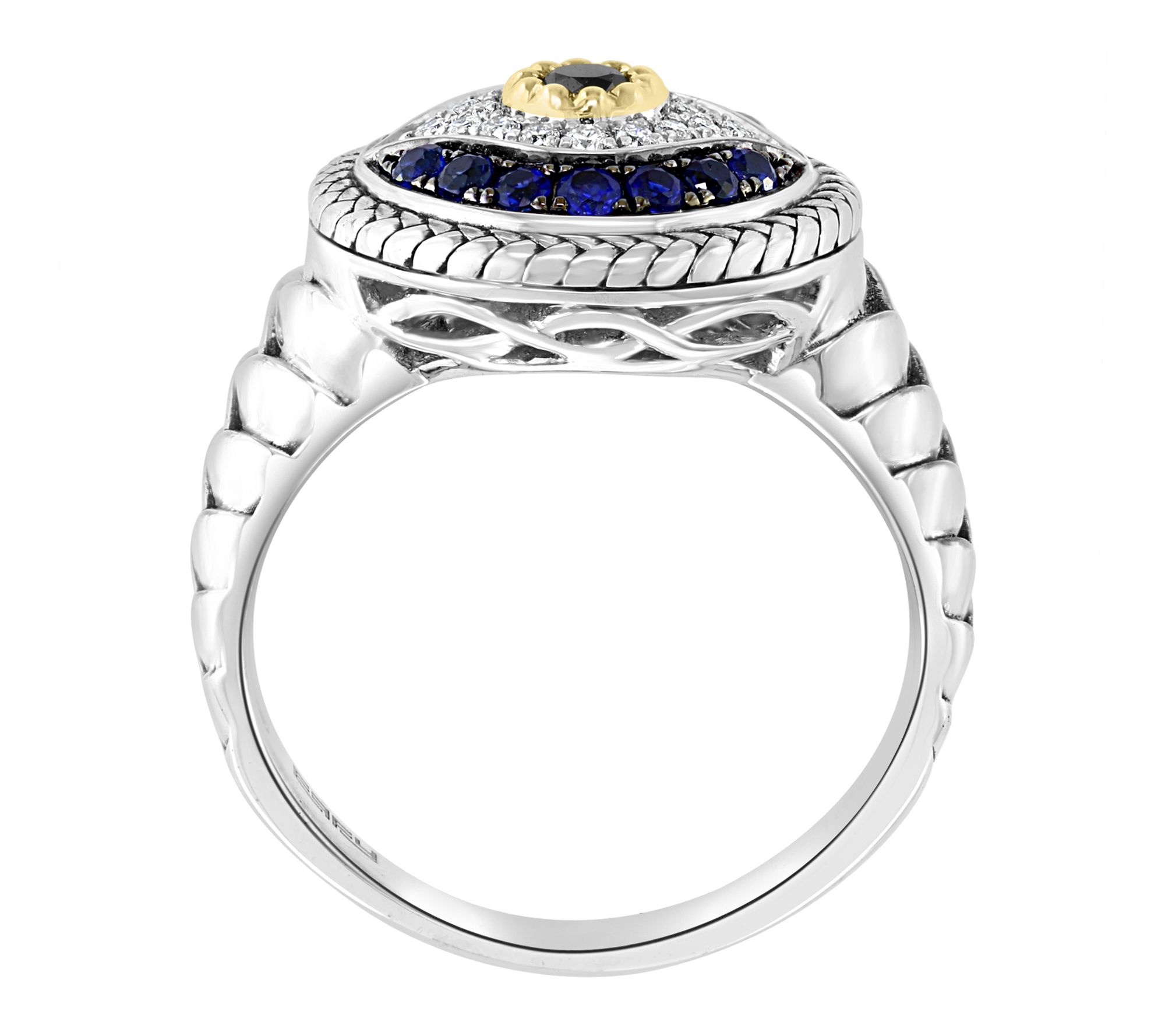 • Evil eye design; round, prong-set diamonds, black diamonds, and sapphires; two-tone finish
