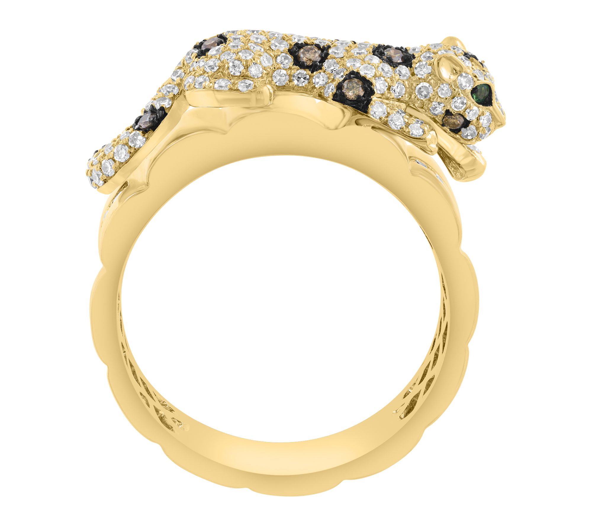 Infuse every ensemble with a touch of intrigue -- the captivating panther design of this cocktail ring showcases a wild spirit and sparkling beauty. Espresso and white diamonds glimmer against lush green tsavorite, all set in gleaming 14K yellow gold, making it a striking accent for evenings out or special celebrations. From Effy.