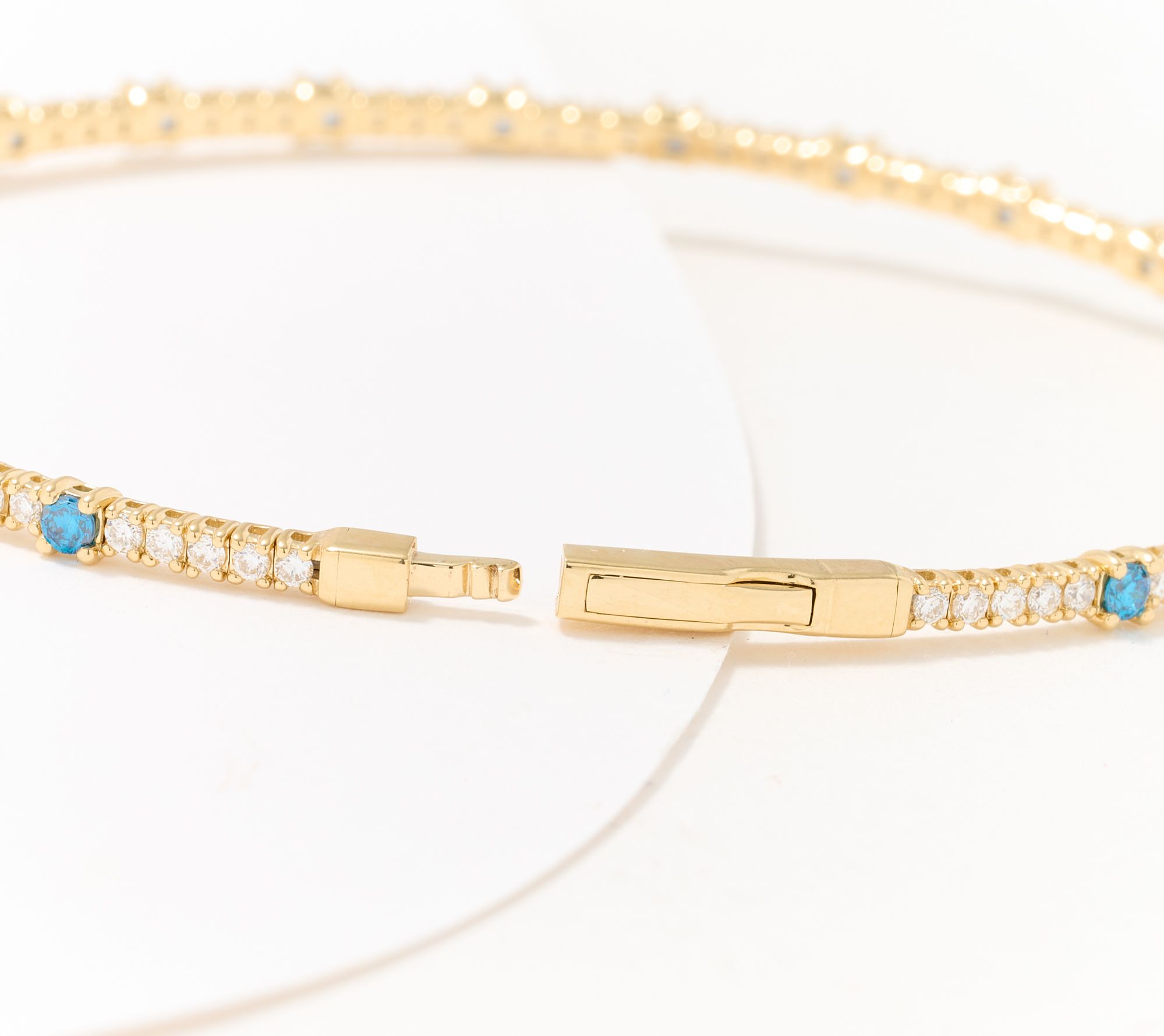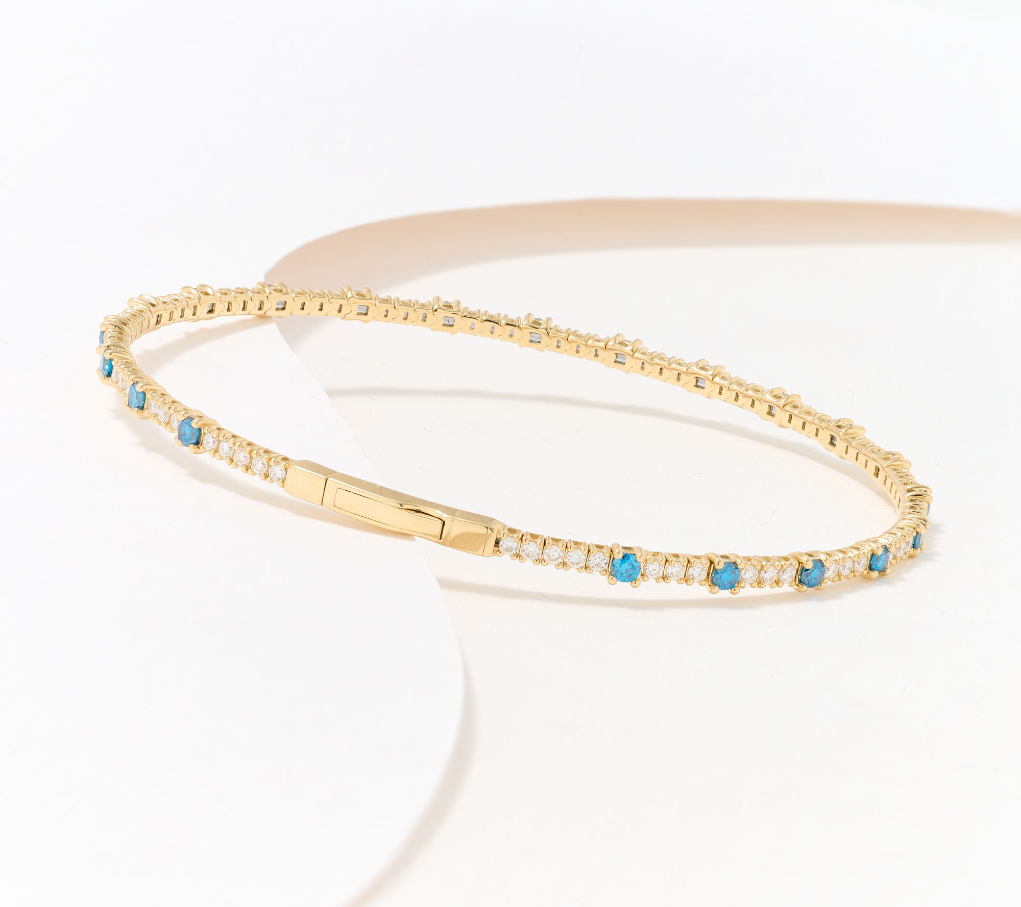 Blue round lab-grown diamonds (1.00 carat) and white lab-grown diamonds (1.00 carat) in bangle design; polished finish