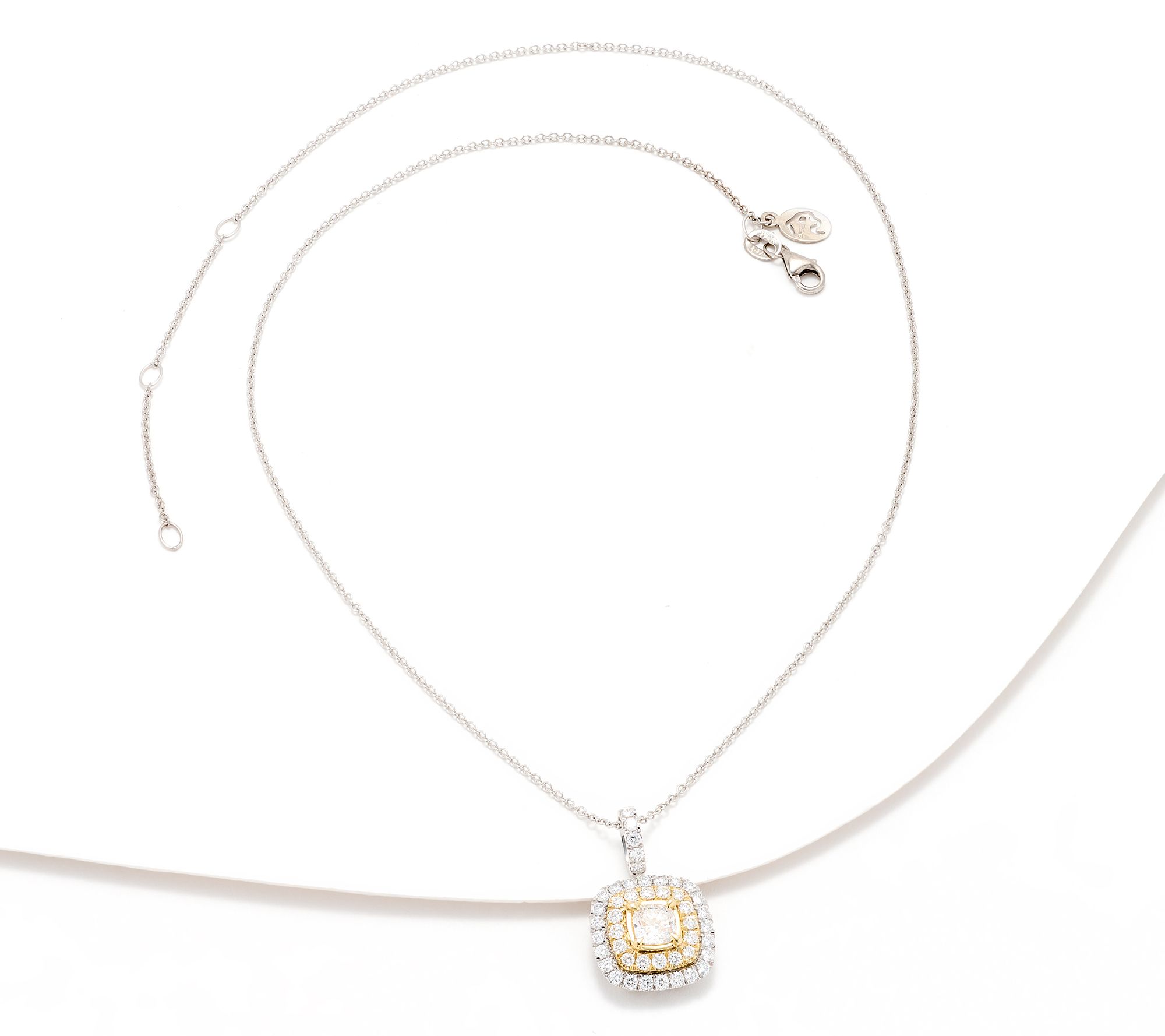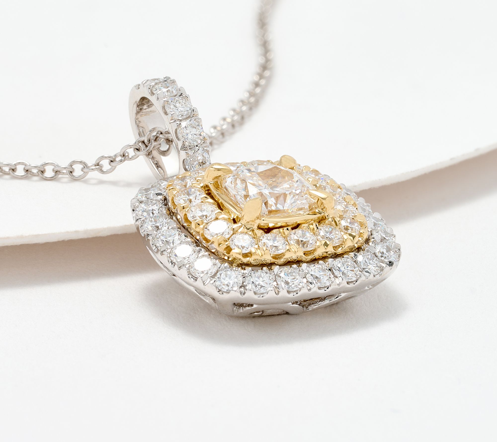 Sunglasses, please! With row after row of sparkling lab-grown diamonds haloing a glorious cushion-cut lab-grown diamond, this two-tone pendant has a big, bright presence. Wear it as an inspired companion for both milestone events and everyday flair. From Effy.