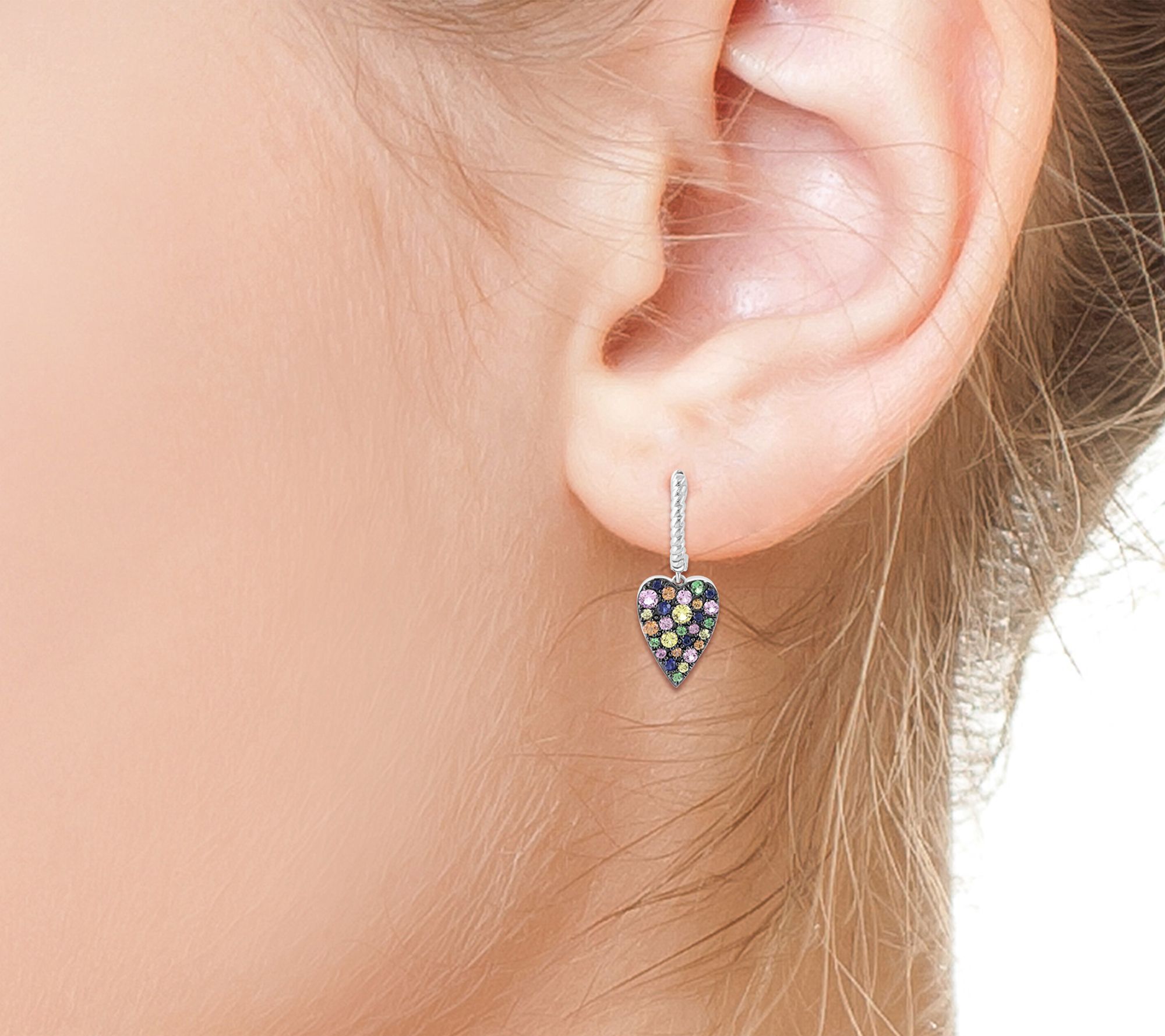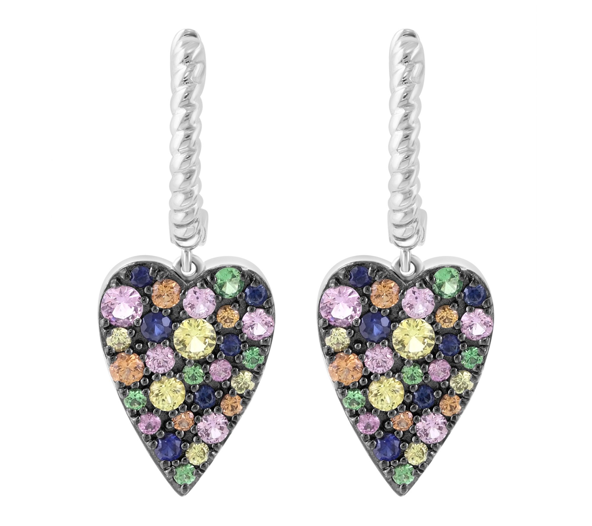 Colorful hearts add a joyful sparkle to any celebration, bringing vibrant hues to your everyday look or special occasions. These dangle earrings are designed with a lively array of sapphires and tsavorite stones, creating a dazzling heart motif that's sure to catch the eye. From Effy.