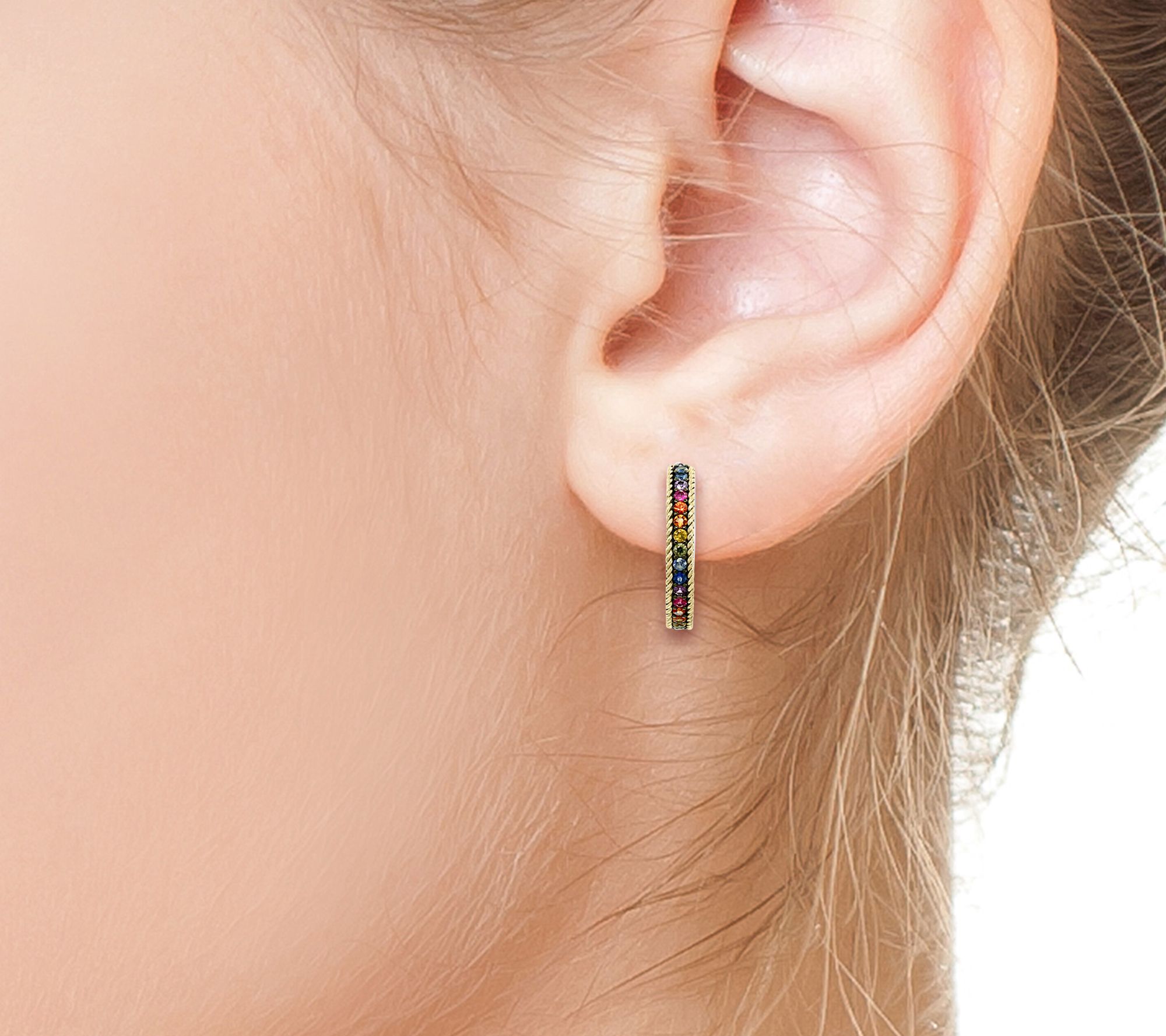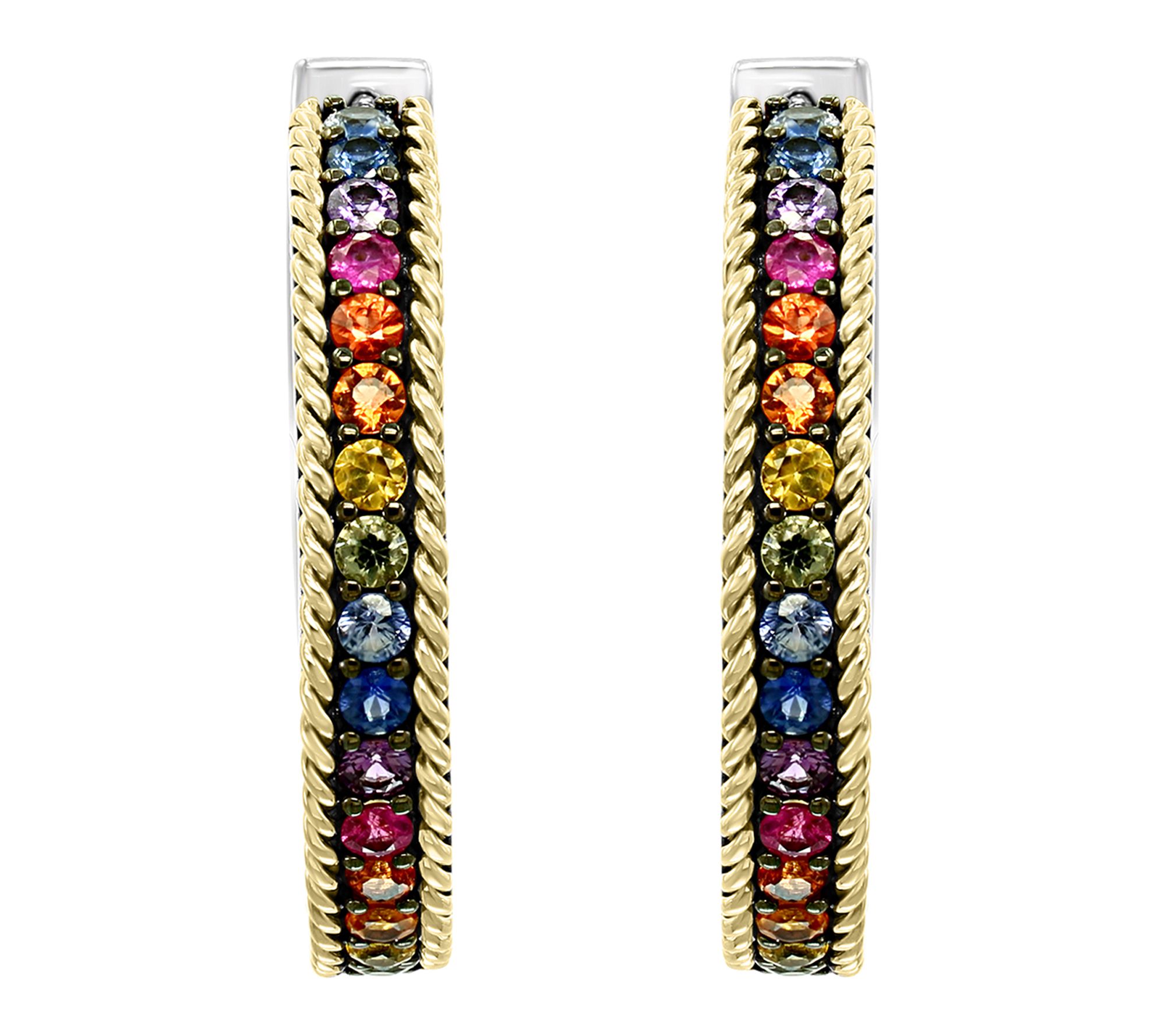 Radiate colorful elegance at every occasion with these hoop earrings that feature vibrant multi-sapphire gemstones in a dazzling spectrum of hues. Set in 18K yellow gold and sterling silver, their round, prong-set sapphires catch the light beautifully -- making them a lively addition to date nights or dinners with friends. From Effy.