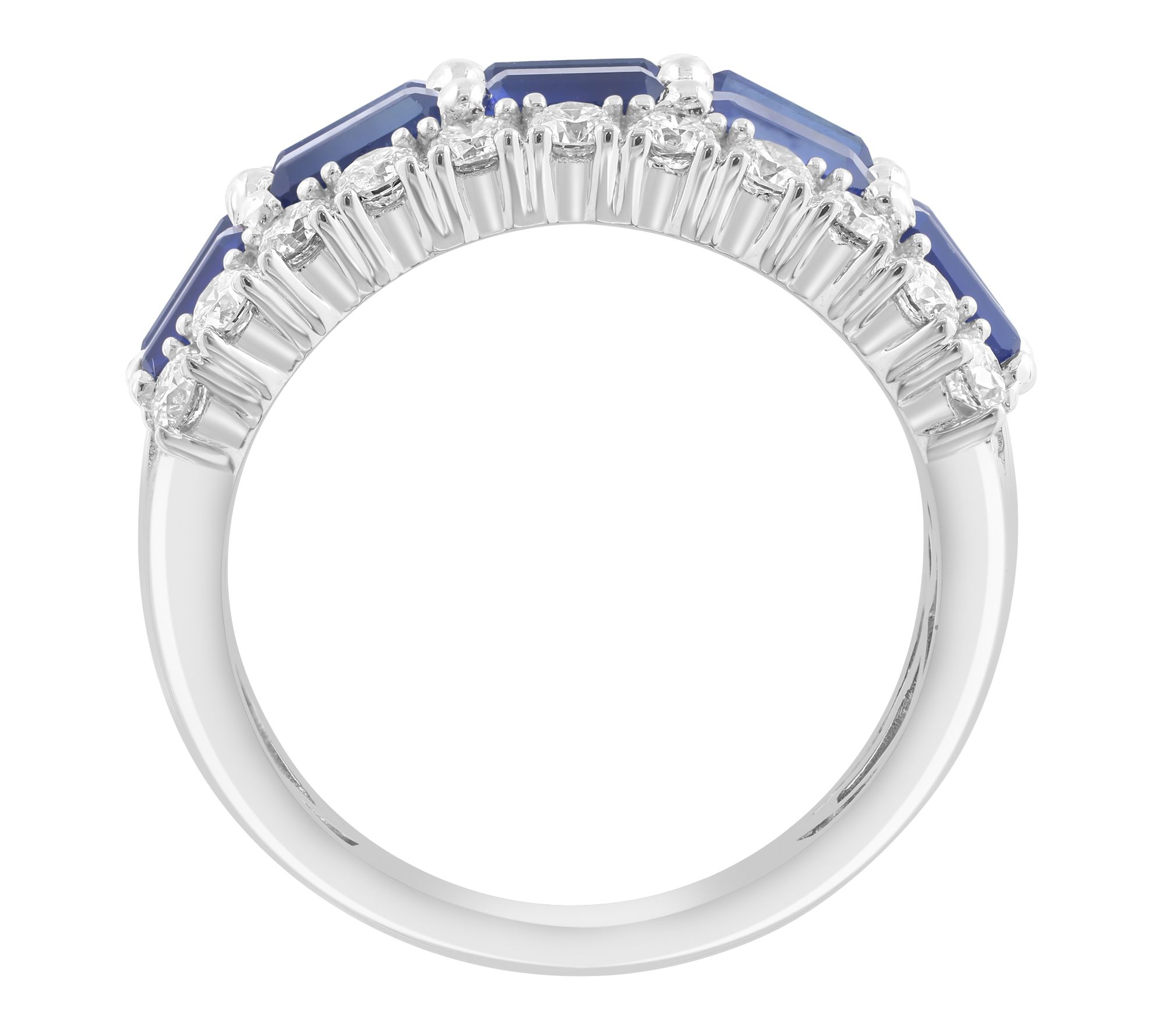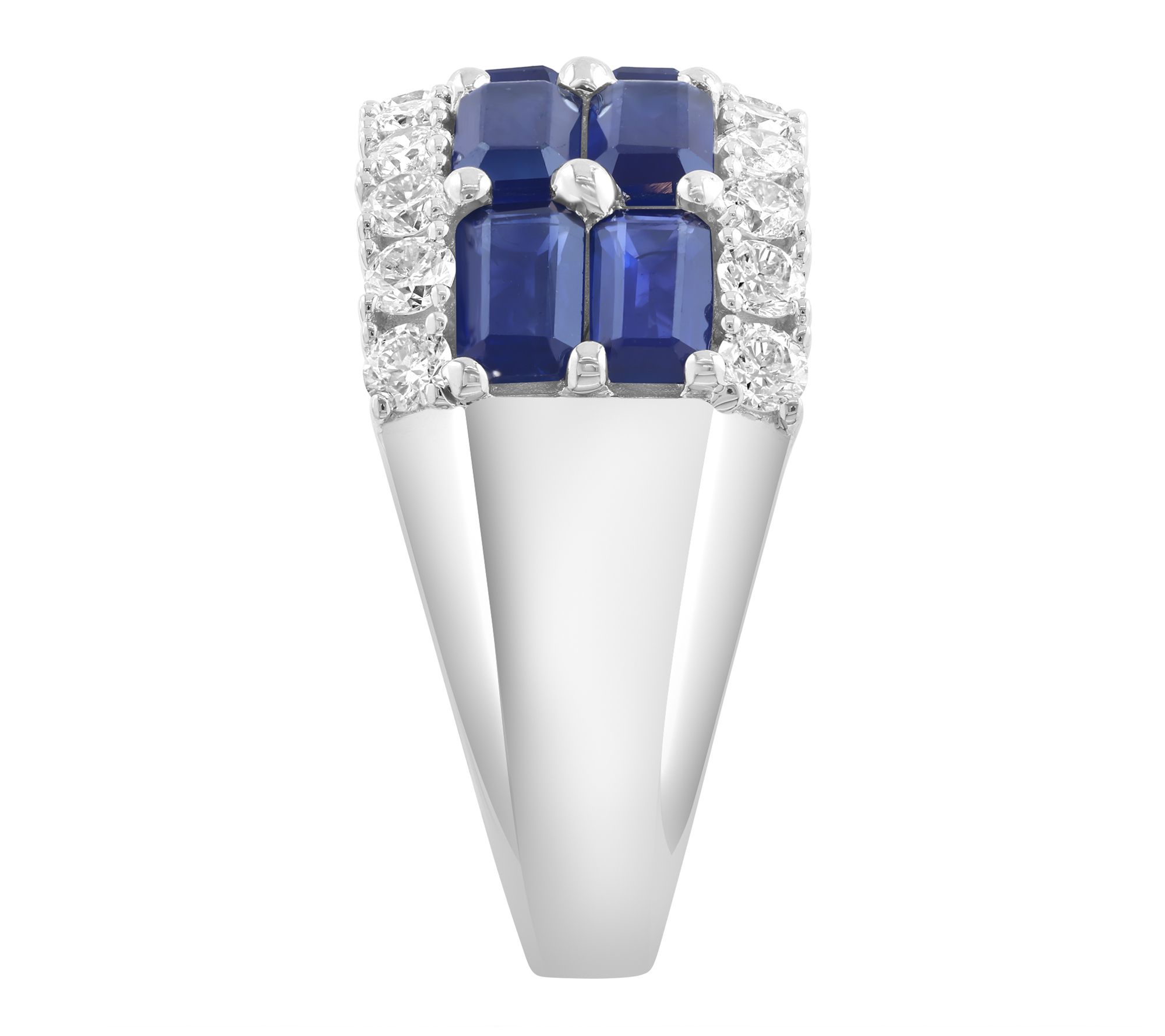 Make every celebration memorable with this dazzling ring, where vibrant blue sapphires and sparkling diamonds create a look that's both sophisticated and eye-catching. Set in 14K white gold, its striking multi-row design adds instant glamour to evening events or special occasions, while the bold east-west cocktail style ensures your hand is the center of attention. From Effy.