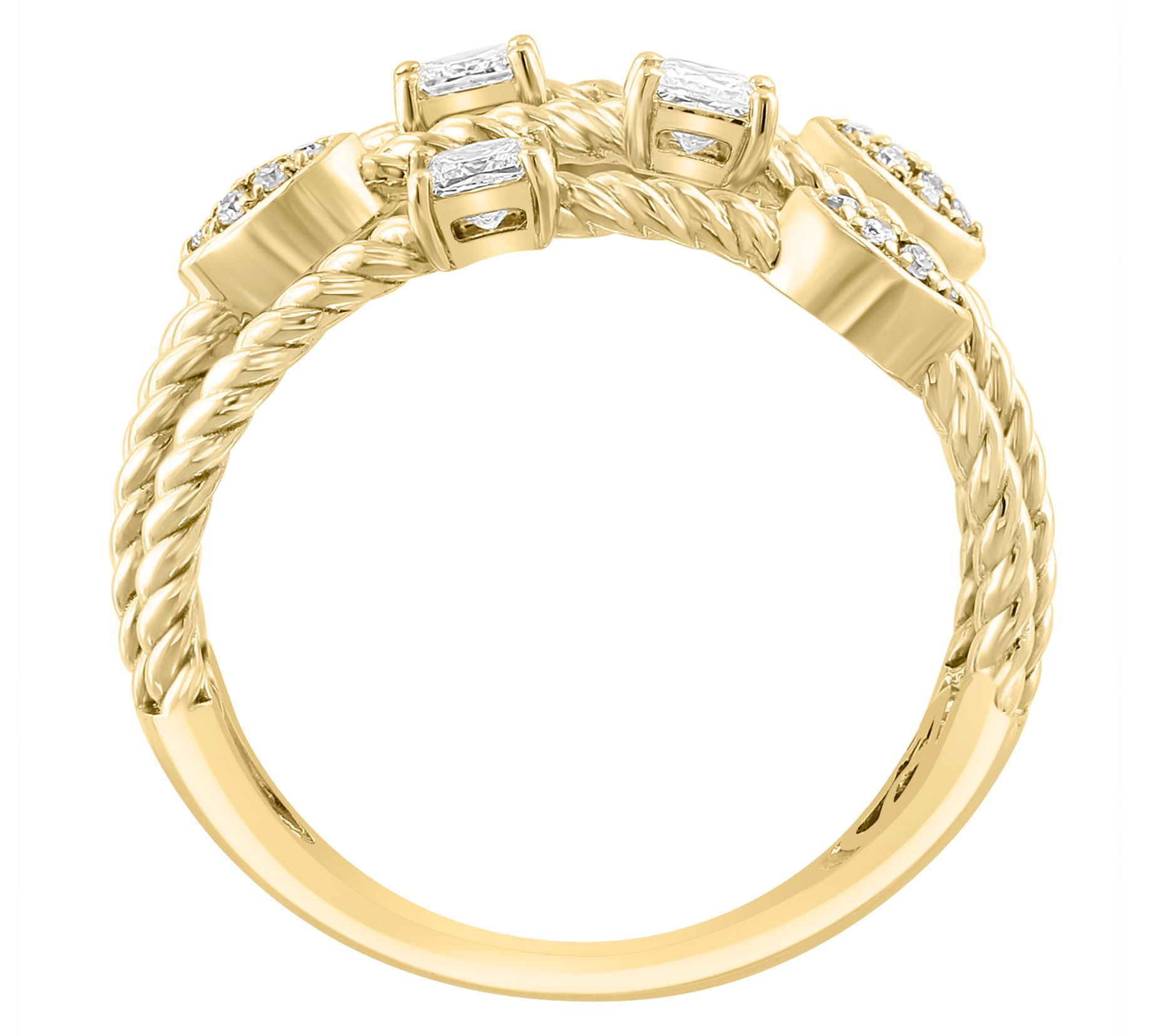 Round and square diamonds; prong and pave settings; rope-inspired, multi-row openwork design; polished finish