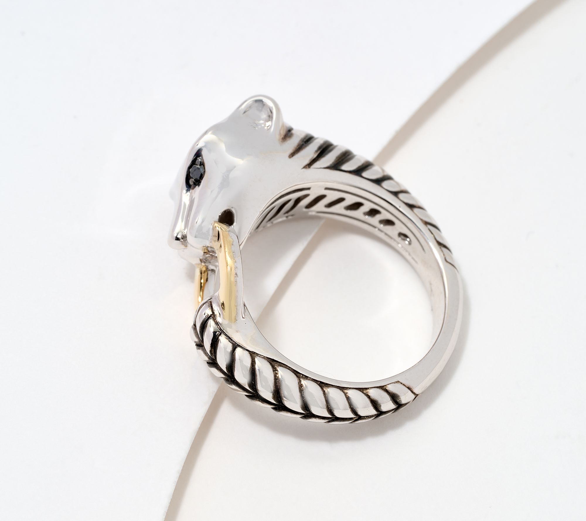 Slip into a bold mood with this panther ring that commands attention. Crafted with a mix of sterling silver and 18K yellow gold, the striking piece catches the eye with glimmering black diamond eyes. Pair it with casual attire or let it elevate your evening ensemble -- it's a statement that offers fierce style with every wear. From Effy.
