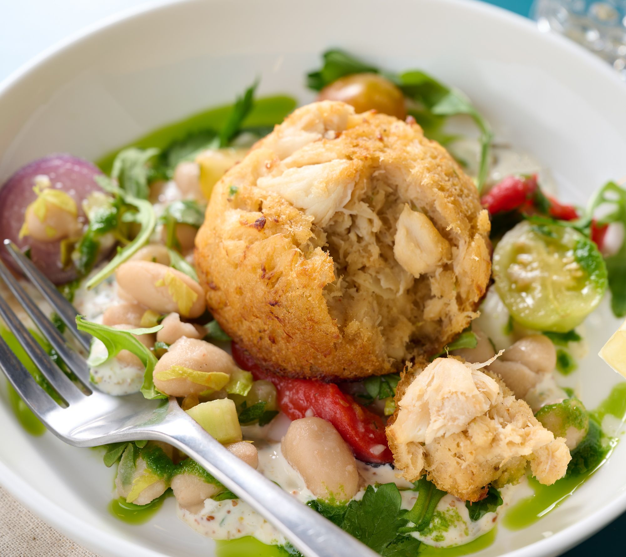Crab meat mixed with mayonnaise, breadcrumbs, Dijon mustard, and lemon