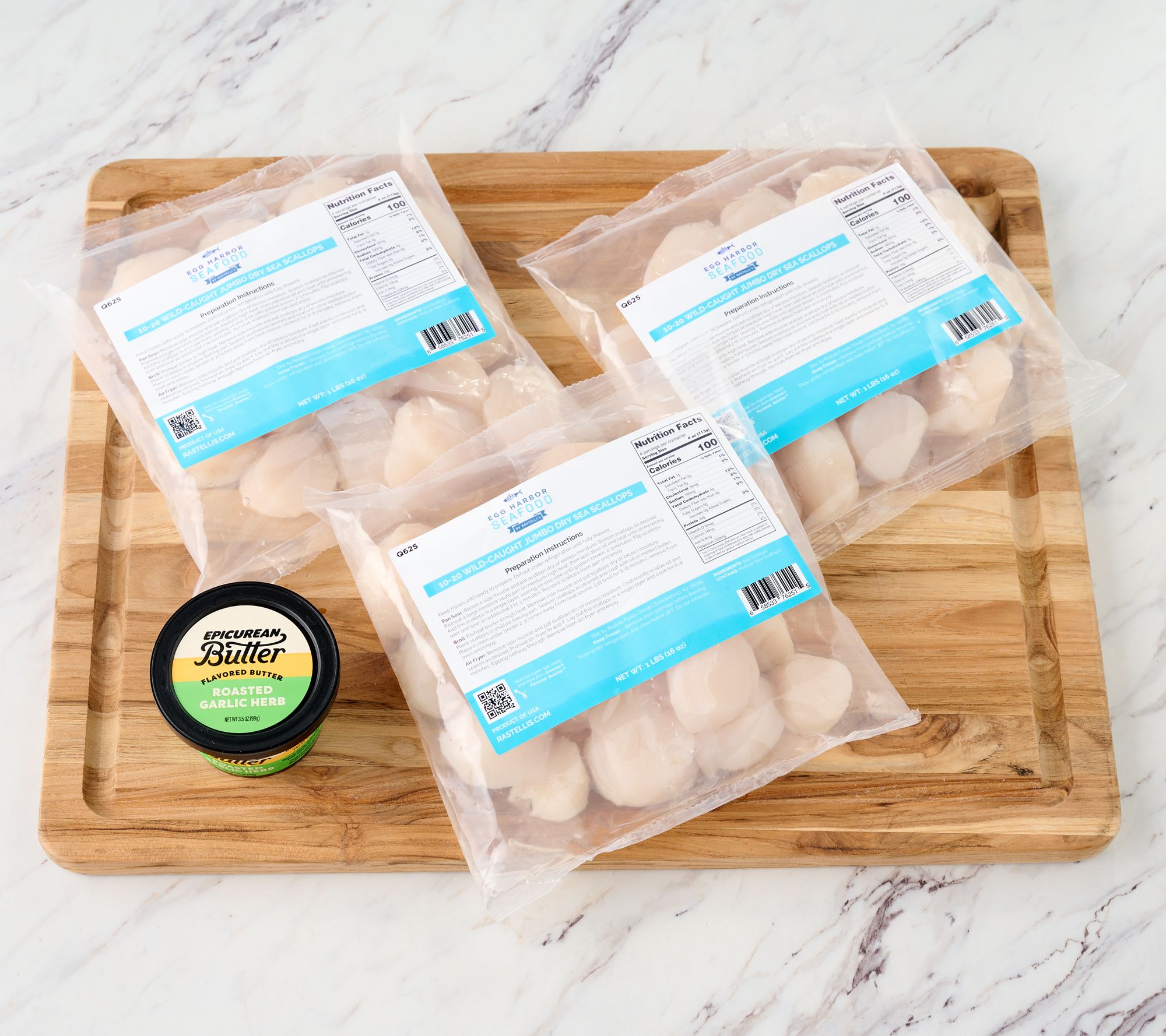 Includes three 1-lb packs of large sea scallops and one 3.5-oz tub of garlic and herb butter