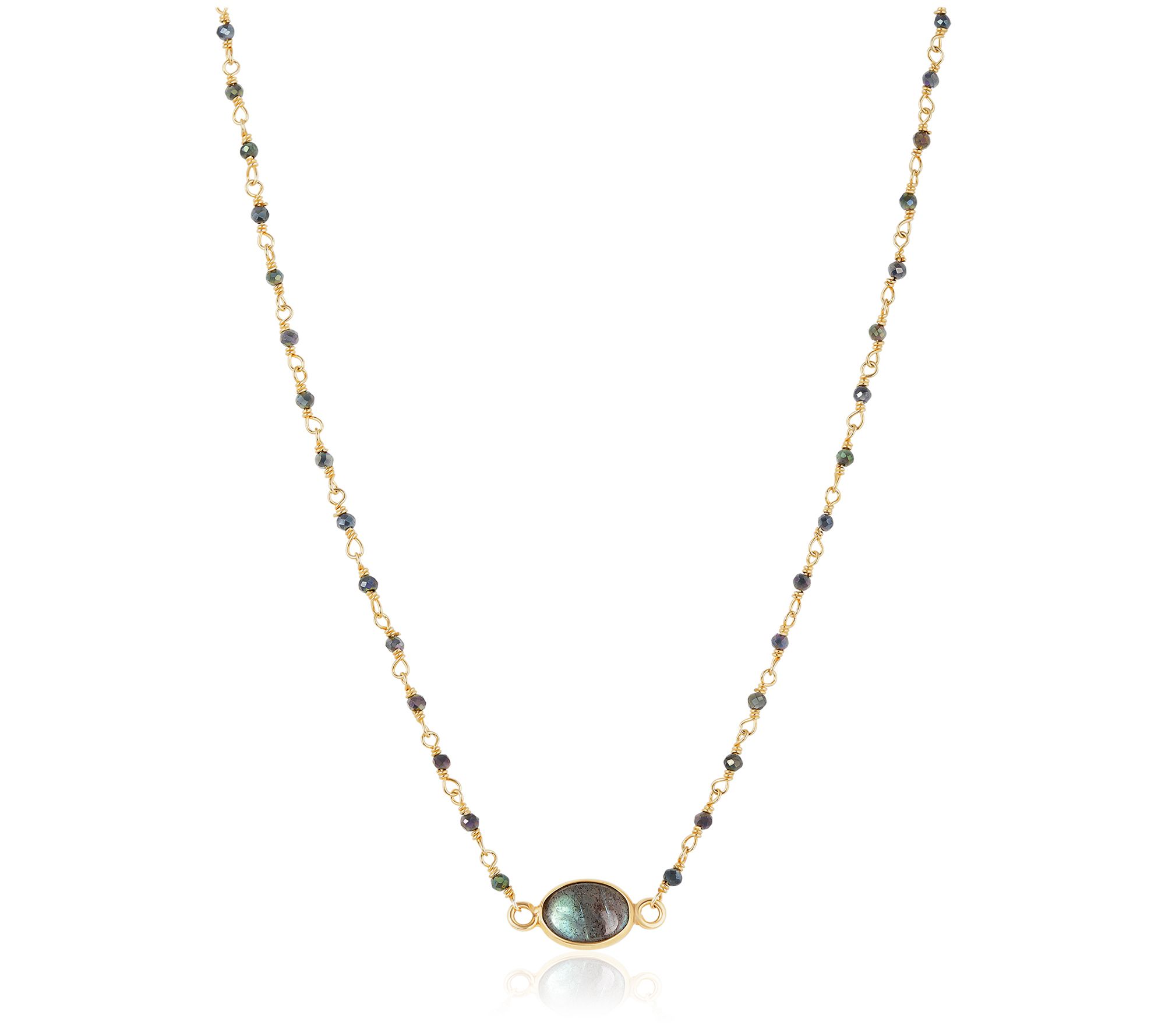 • 14K yellow gold-plated sterling silver necklace with spinel gemstones and a labradorite gemstone center station