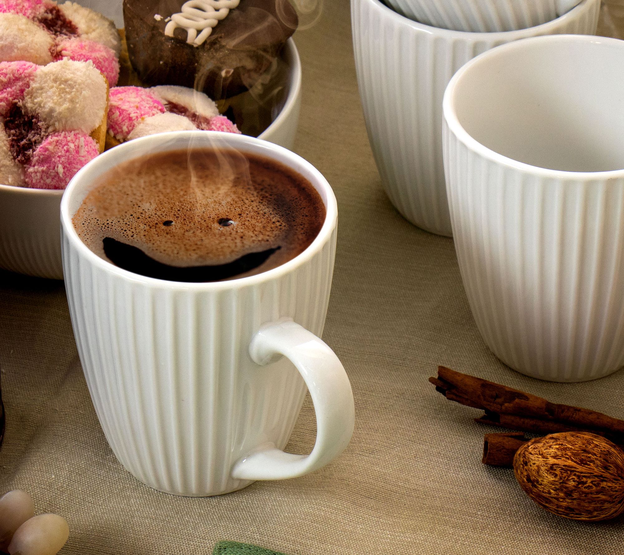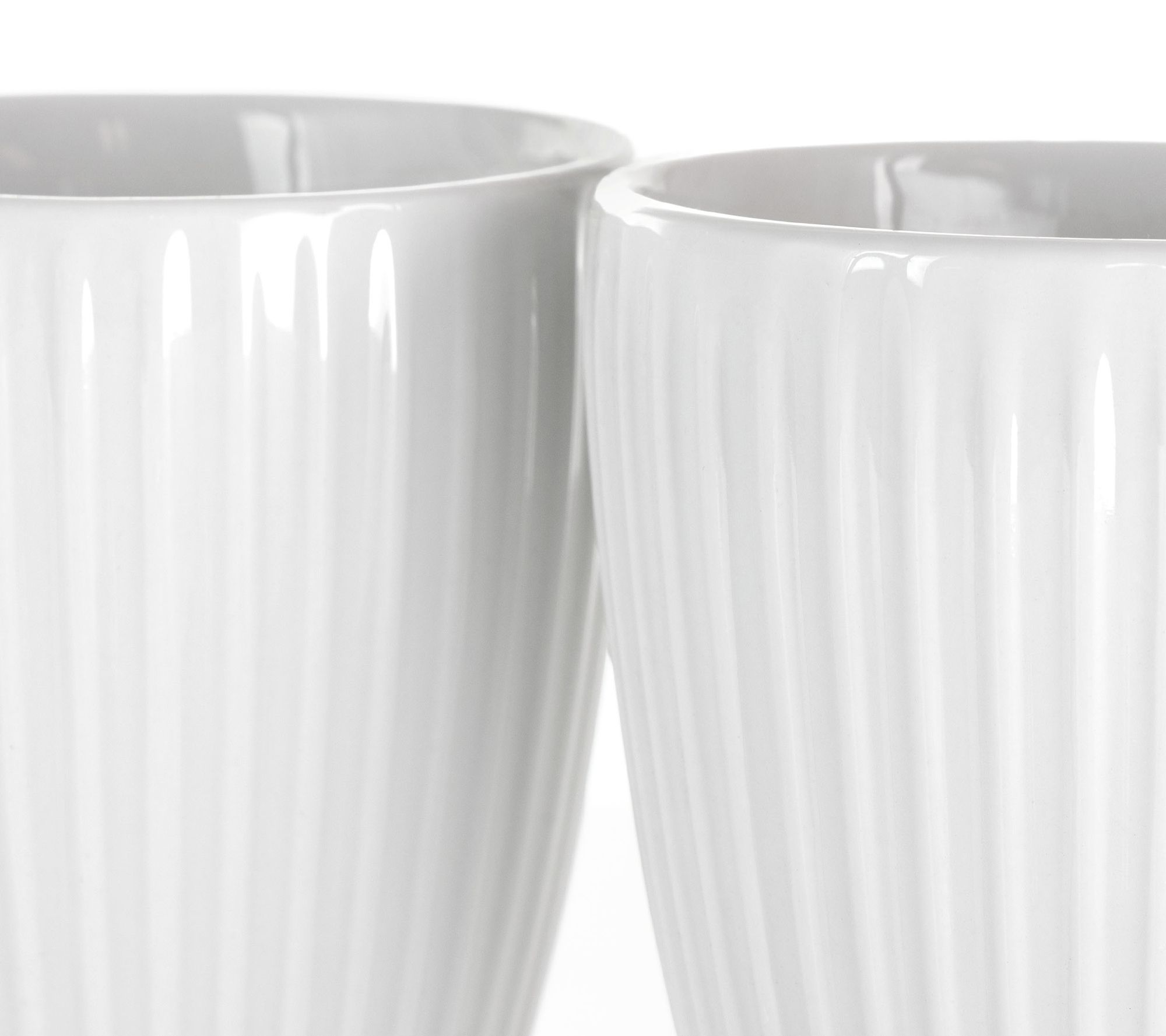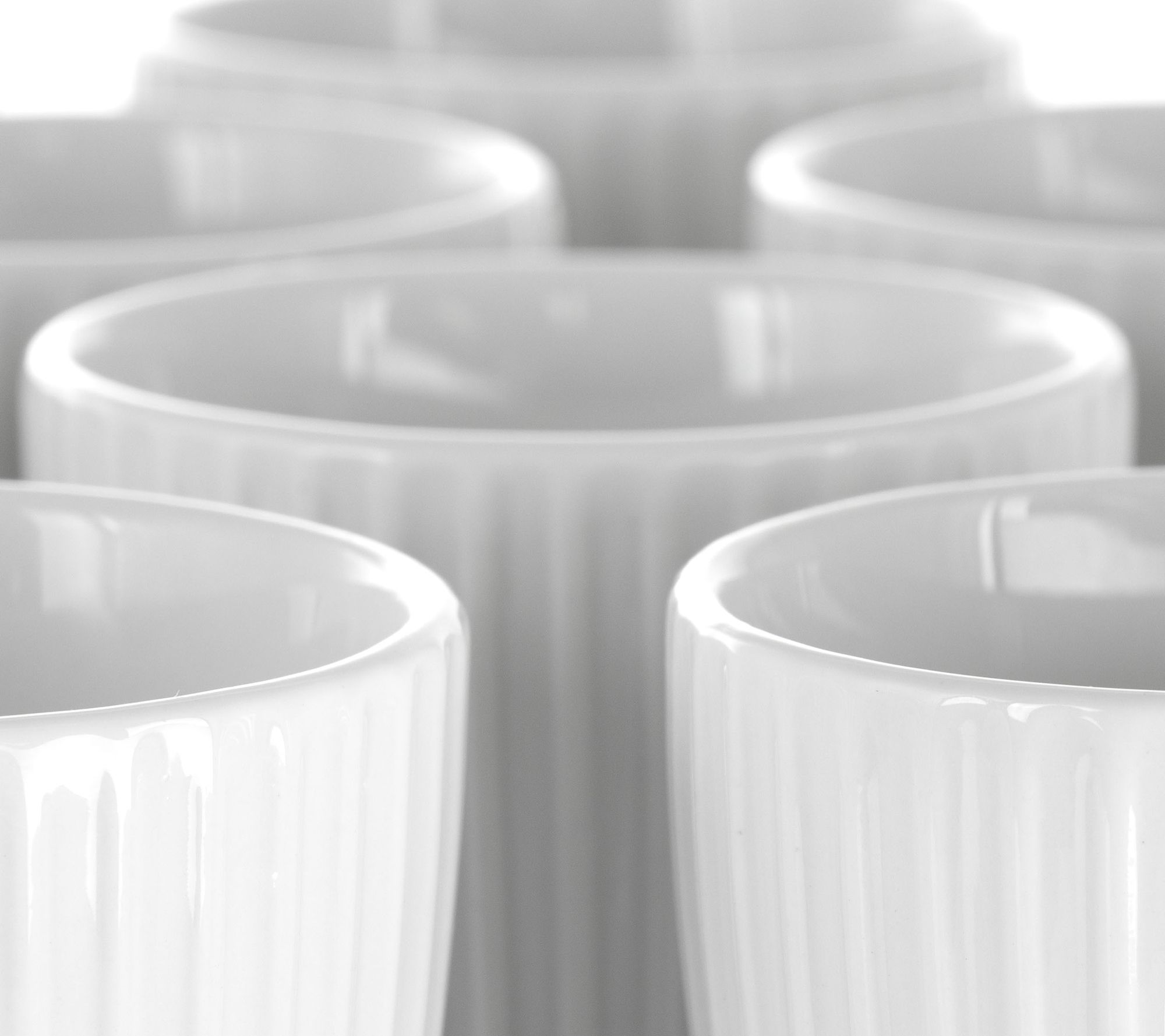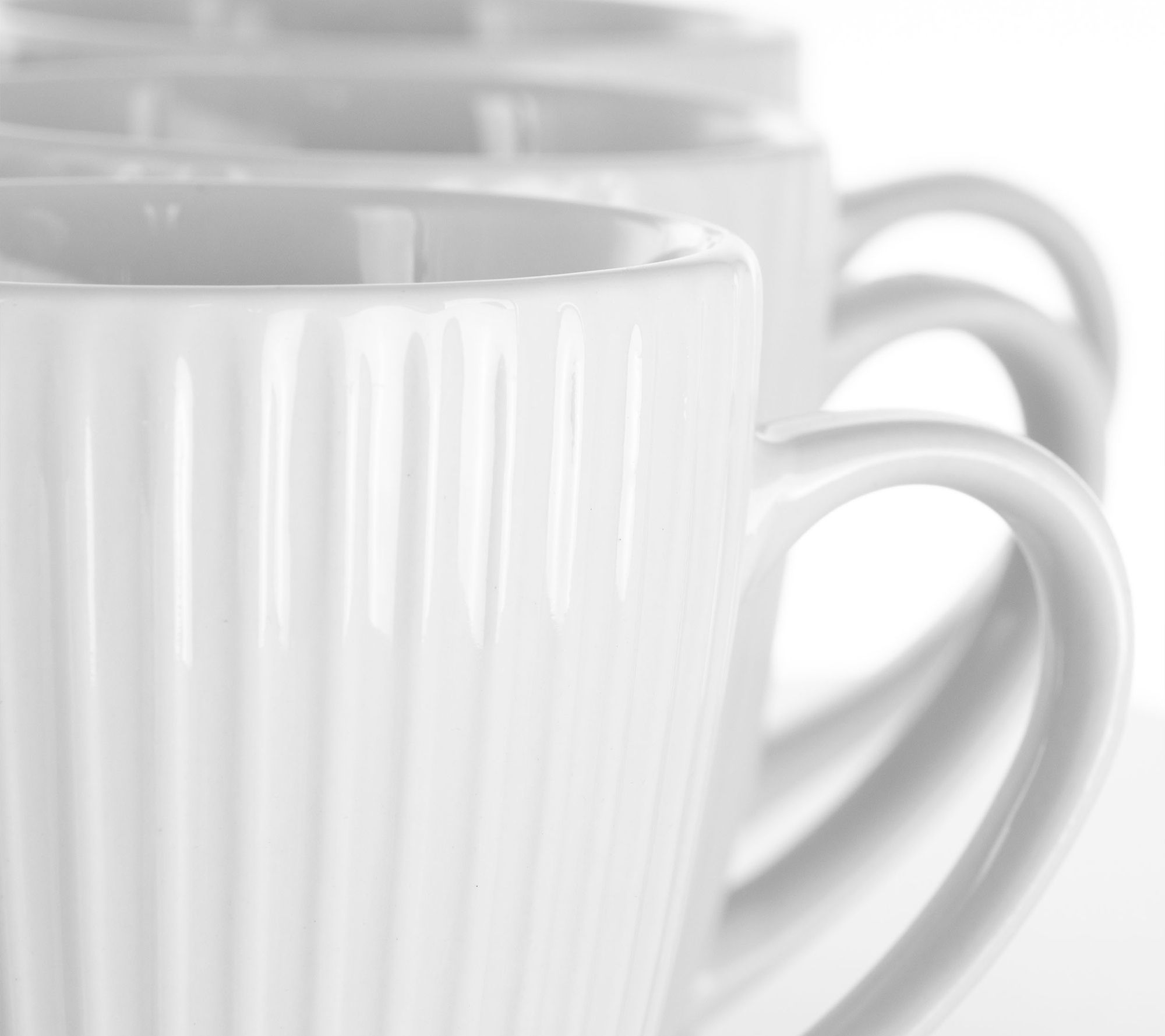 Cozy up with a hot cup of cocoa, tea, or coffee in these 12 white porcelain mugs. Vertically etched lines encircle each cup for added distinction. From Elama.